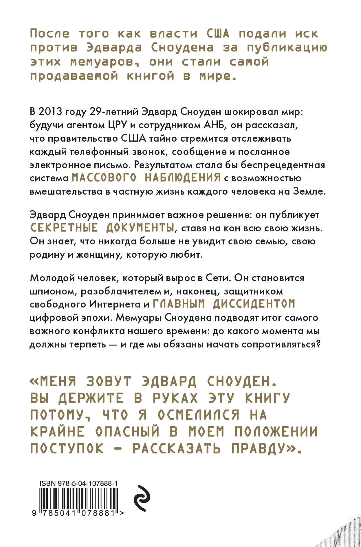 МИРОВОЙ БЕСТСЕЛЛЕР. Выбор читателей № 1 по версии Amazon и New York Times. После того, как правительство США подало иск против бывшего сотрудника ЦРУ и АНБ Эдварда Сноудена за публикацию этих мемуаров, они стали самой продаваемой книгой в мире. В 2013 году 29-летний Эдвард Сноуден шокировал мир: будучи агентом ЦРУ и сотрудником АНБ, он рассказал, что правительство США тайно стремится отслеживать каждый телефонный звонок, сообщение и посланное электронное письмо. Результатом стала бы беспрецедентная система массового наблюдения с возможностью вмешательства в частную жизнь каждого человека на Земле. Эдвард Сноуден принимает важное решение: он публикует секретные документы, ставя на кон всю свою жизнь. Он знает, что никогда больше не увидит свою семью, свою родину и женщину, которую любит. Молодой человек, который вырос в Сети и воочию видел трансформацию Интернета из креативного пространства в систему глобальной слежки. Он становится шпионом, разоблачителем и, наконец, защитником свободного Интернета и главным диссидентом цифровой эпохи. Мемуары Сноудена подводят итог самого важного конфликта нашего времени: до какого момента мы должны терпеть - и где мы обязаны начать сопротивляться? «Эта книга не просто интересна. Не просто представляет собой поразительный рассказ о том, как с помощью современной техники государство устанавливает слежку за каждым, без исключения, гражданином. Это книга о мужестве, о чувстве долга, наконец, о патриотизме. Сказать, что эта книга совершенно уникальна - это не сказать ничего». - Владимир Познер| Издательство | ООО "Издательство "Эксмо" |