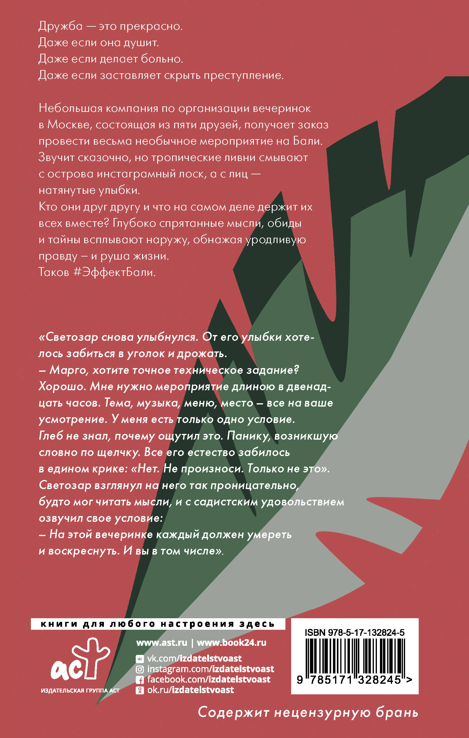 Дружба - это прекрасно. Даже если она душит. Даже если делает больно. Даже если заставляет скрыть преступление. Небольшая компания по организации вечеринок в ­Мос­кве, состоящая из пяти друзей, получает заказ провести весьма необычное мероприятие на Бали. Звучит сказочно, но тропические ливни смывают с острова инста­грамный лоск, а с лиц - натянутые улыбки. Кто они друг другу и что на самом деле держит их всех вместе? Глубоко спрятанные мысли, обиды и тайны всплывают наружу, обнажая уродливую правду - и руша жизни. Таков #ЭффектБали.