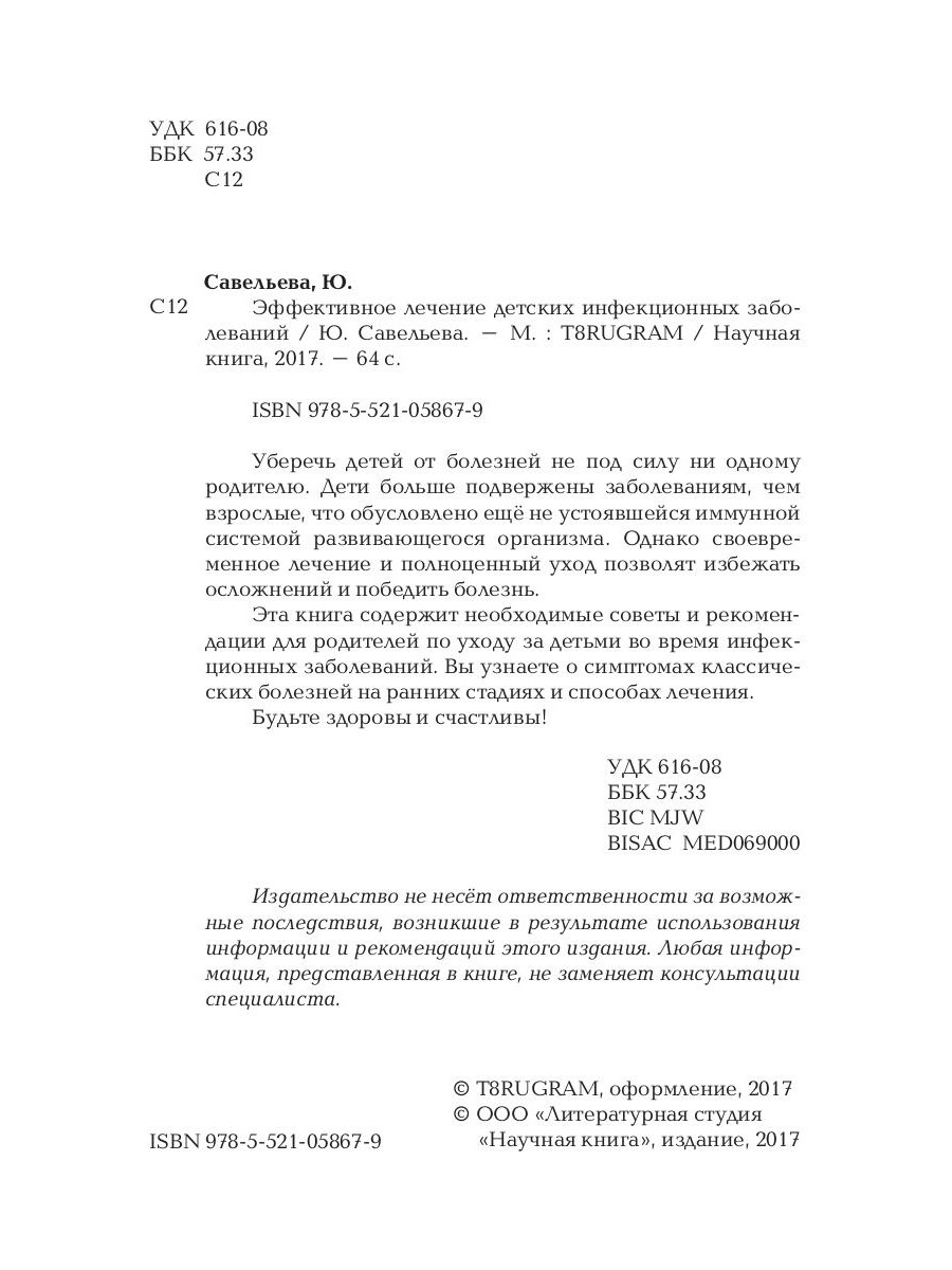 Уберечь детей от болезней не под силу ни одному родителю. Дети больше подвержены заболеваниям, чем взрослые, что обусловлено ещё не устоявшейся иммунной системой развивающегося организма. Однако своевременное лечение и полноценный уход позволят избежать осложнений и победить болезнь. Эта книга содержит необходимые советы и рекомендации для родителей по уходу за детьми во время инфекционных заболеваний. Вы узнаете о симптомах классических болезней на ранних стадиях и способах их лечения.| Издательство | Т8 RUGRAM |