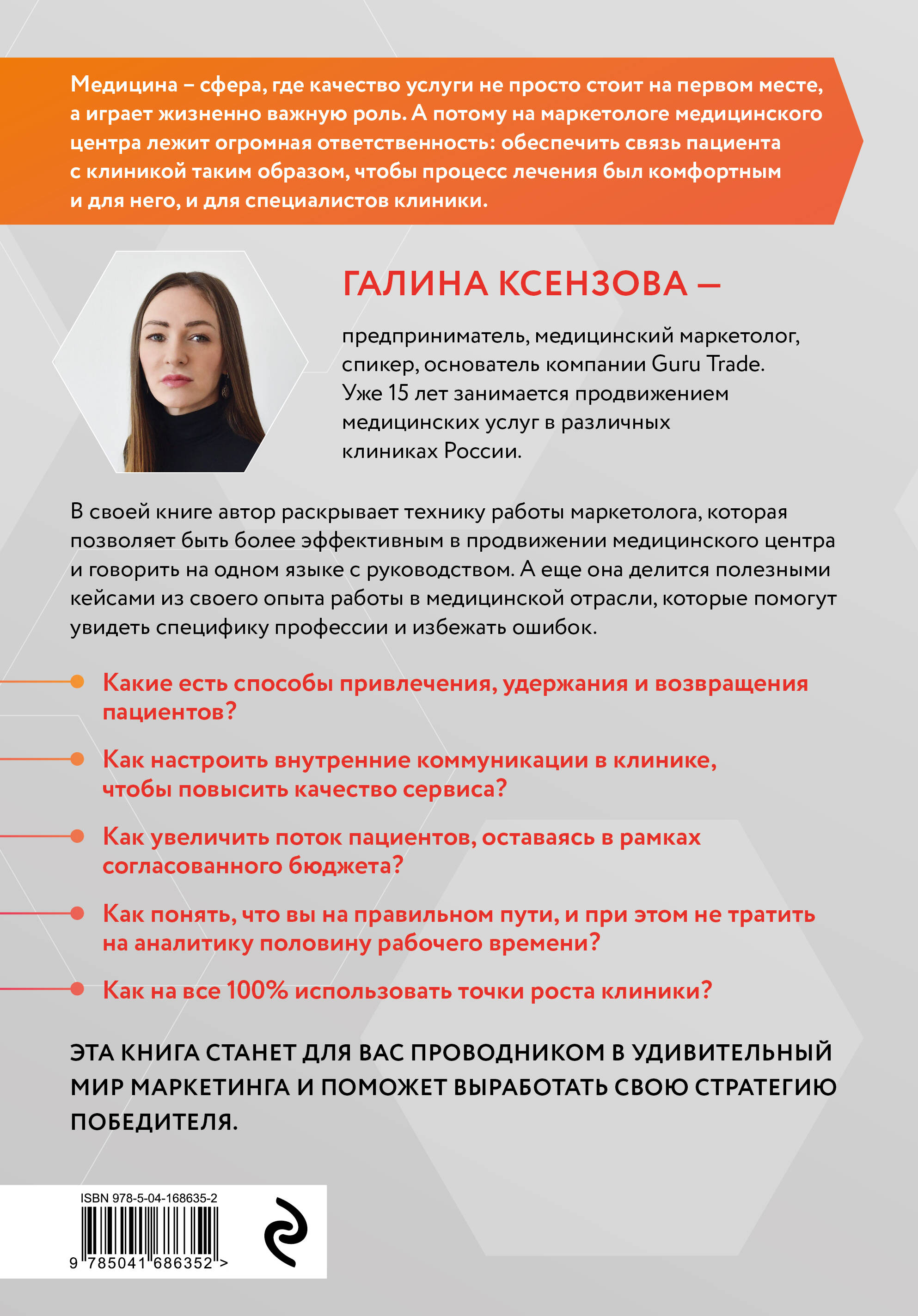 Совместная работа с врачами, поиск и внедрение новых путей развития клиники, исследование пациентопотока - все это может быть приятным и плодотворным процессом, а не серой рутиной. Галина Ксензова, предприниматель и медицинский маркетолог с 15-летним опытом, знает об этом не понаслышке. В своей книге она делится эффективными инструментами для продвижения медцентра и рассказывает, как наладить работу так, чтобы вы достигали своих целей и получали удовольствие от процесса. - Как привлечь и удержать пациентов и сделать процесс лечения в клинике наиболее комфортным и для них, и для врачей? - Как определить точки роста клиники и использовать их на все 100%? - Как эффективно ввести новые услуги и акции и наладить работу с партнерами? - Как справляться с операционной работой и научиться управлять потоками пациентов? - Как улучшить существующие точки контакта и где найти новые?| Издательство | ООО "Издательство "Эксмо" |