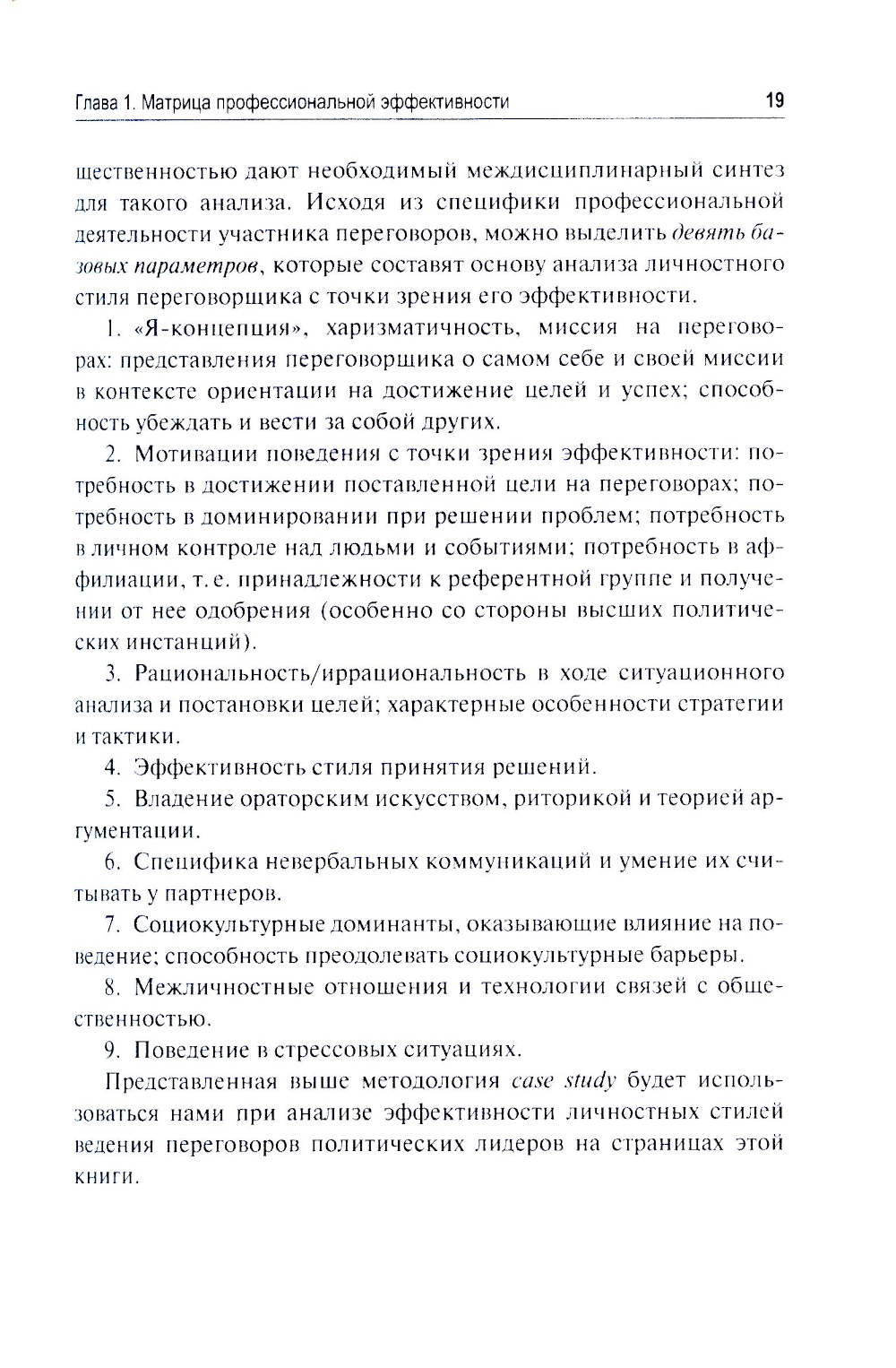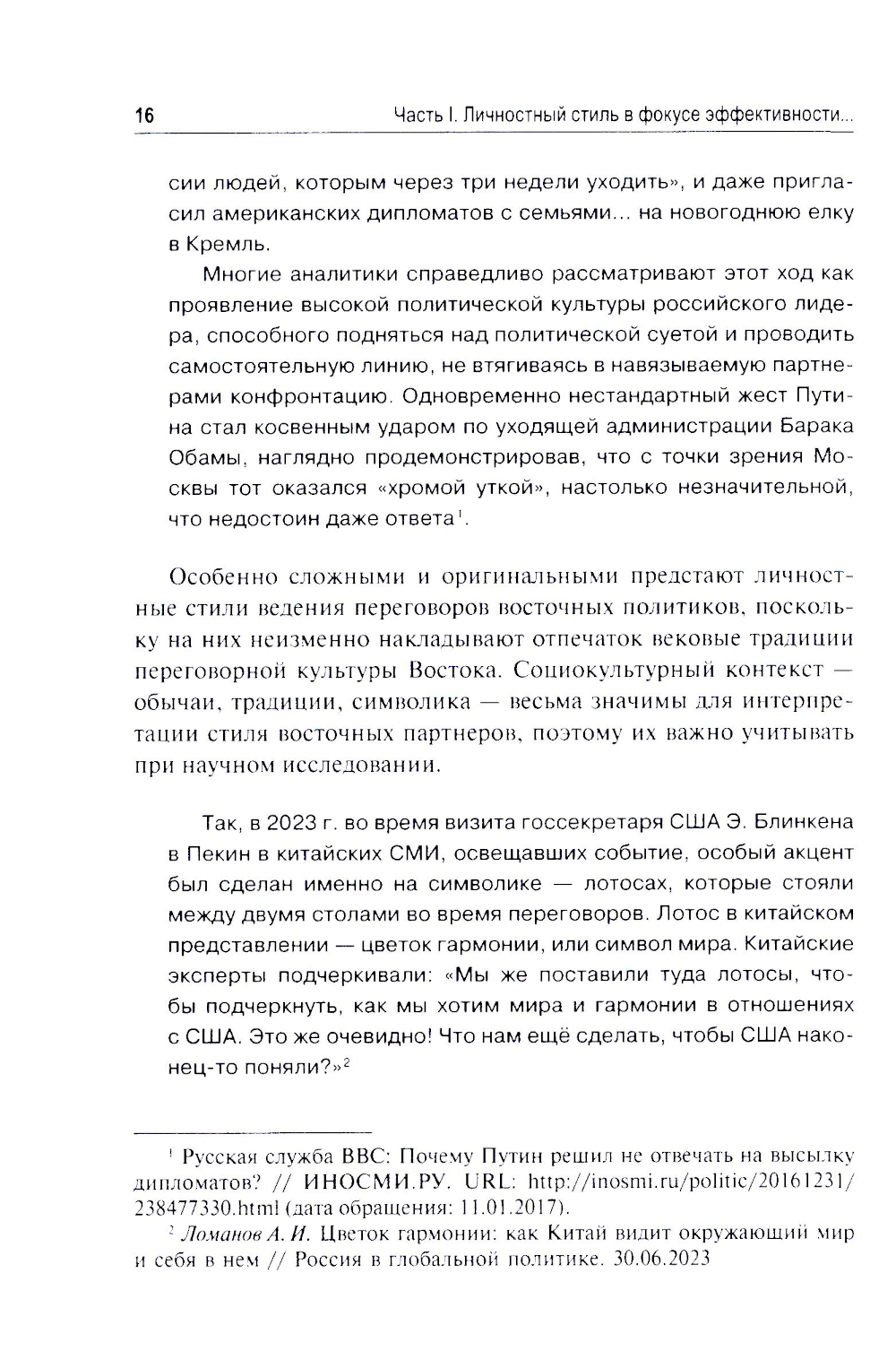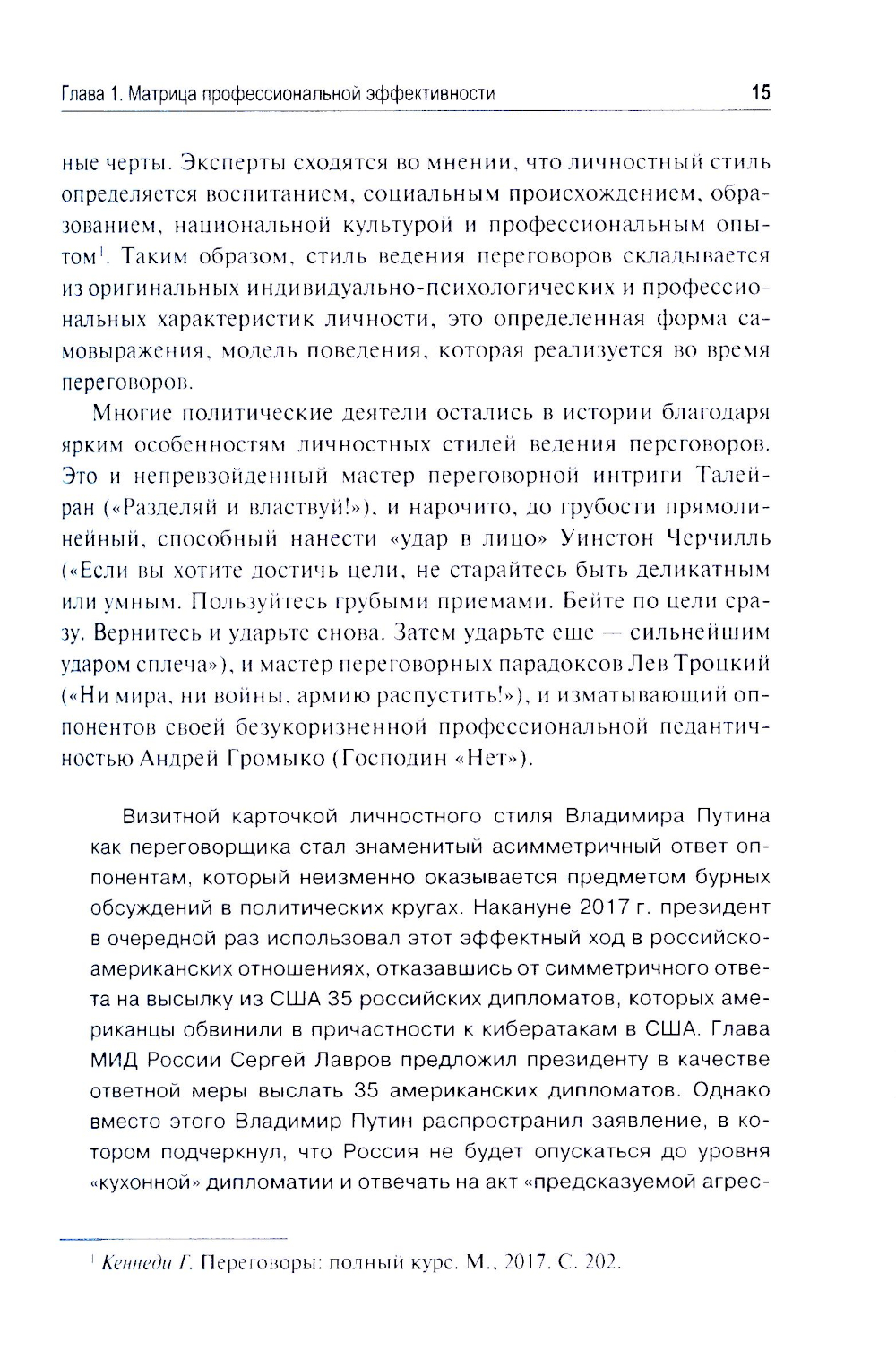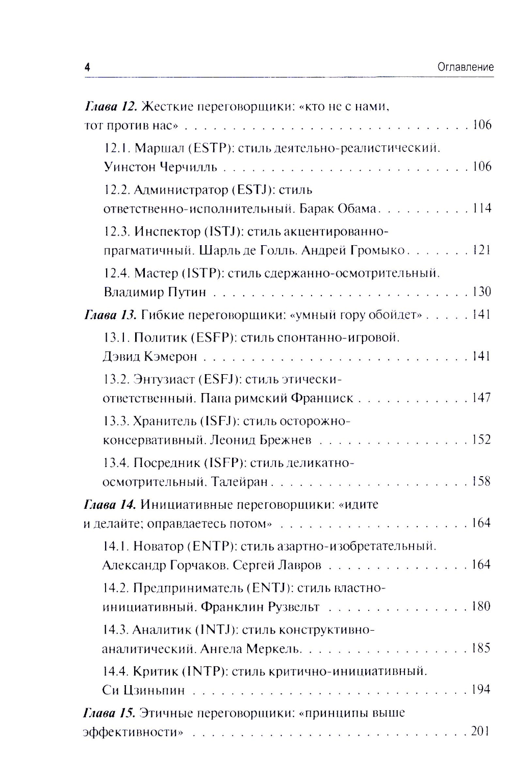Во втором издании монографии представлена концепция формирования личностного стиля ведения переговоров, раскрываются секреты мастерства выдающихся переговорщиков прошлого и современности. Проанализированы наиболее эффективные стратегии и тактики, которые помогут достичь цели в процессе самых сложных переговоров. Книга также содержит переговорный практикум, включающий тесты, кейсы и тренинги, что позволит читателю самостоятельно совершенствовать навыки ведения переговоров. Дается авторская классификация шестнадцати личностных переговорных стилей, разработанная на основе современного Международного стандарта психологических типов и теории психических базовых констант личности К.Г. Юнга. Представлен сравнительный анализ эффективности личностных стилей политических деятелей и дипломатов (В. Путин, С. Лавров, А. Горчаков, А. Громыко, В. Молотов, И. Сталин, Ф. Рузвельт, У. Черчилль, Ш. де Голль, Си Цзиньпин, А. Меркель и др.). Особое внимание уделяется проблемам преодоления социокультурных барьеров в процессе международных переговоров. Книга адресована всем, кто участвует в подготовке и проведении переговоров: политикам, дипломатам, менеджерам, бизнесменам, специалистам в сфере международных связей.| Издательство | Международные отношения |