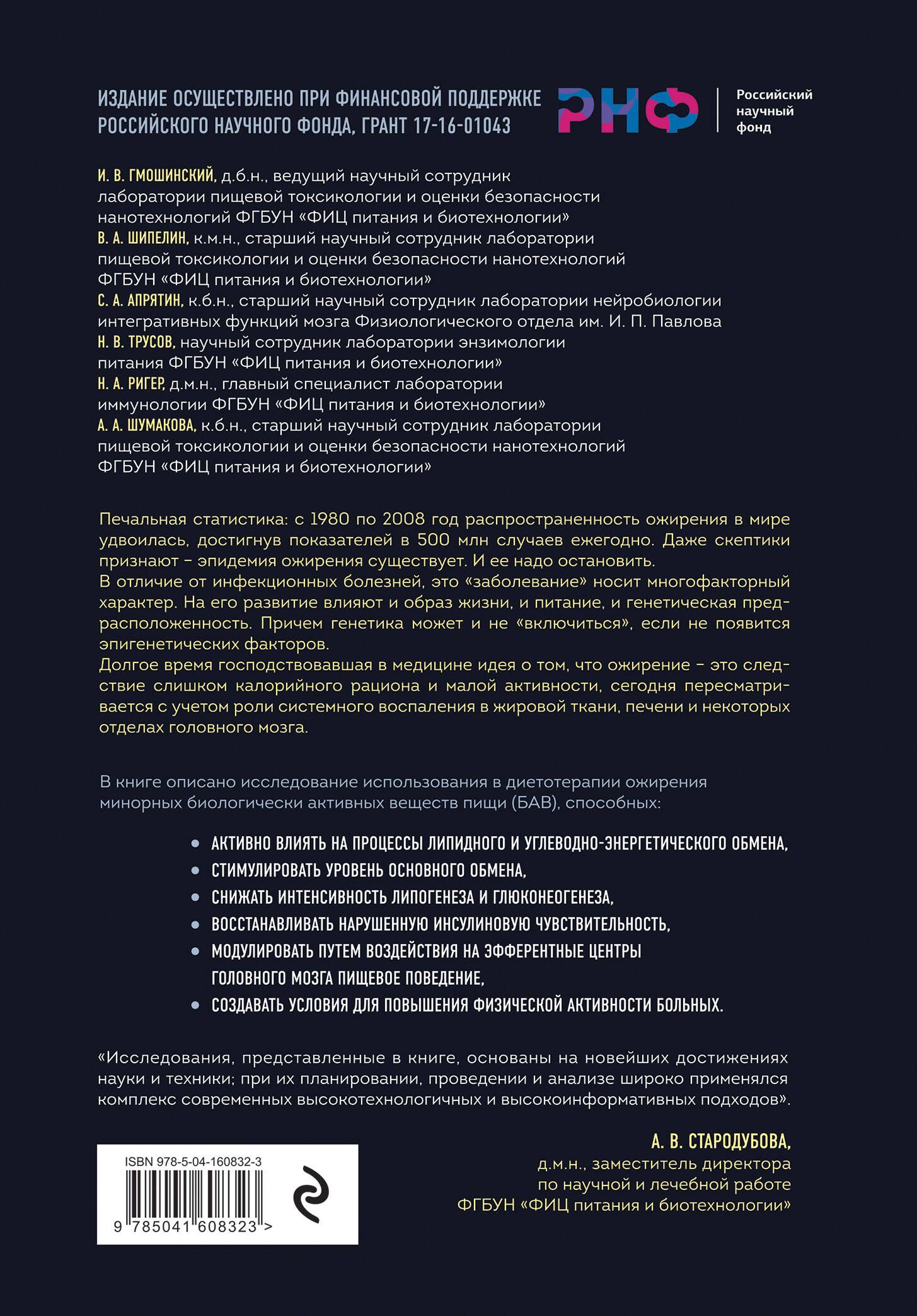 Что такое эффекторные звенья метаболизма? Если говорить простым языком, это те самые цепочки причин и следствий, которые в итоге приводят или к развитию ожирения, или к похудению. Команда российских ученых из Федерального исследовательского центра питания, биотехнологий и безопасности пищи провело и опубликовало результаты многолетних исследований влияния тех или иных элементов на развитие метаболического синдрома: - кварцетин и ресвератрол; - l-карнитин, тирозин и триптофан; - геномные и эпигеномные маркеры набора лишнего веса; - регуляторные микроРНК в патогенезе ожирения. И еще 10 маркеров, которые исследовали, изучили и выявили их реальный вес в ожирении человека.| Издательство | Эксмо |