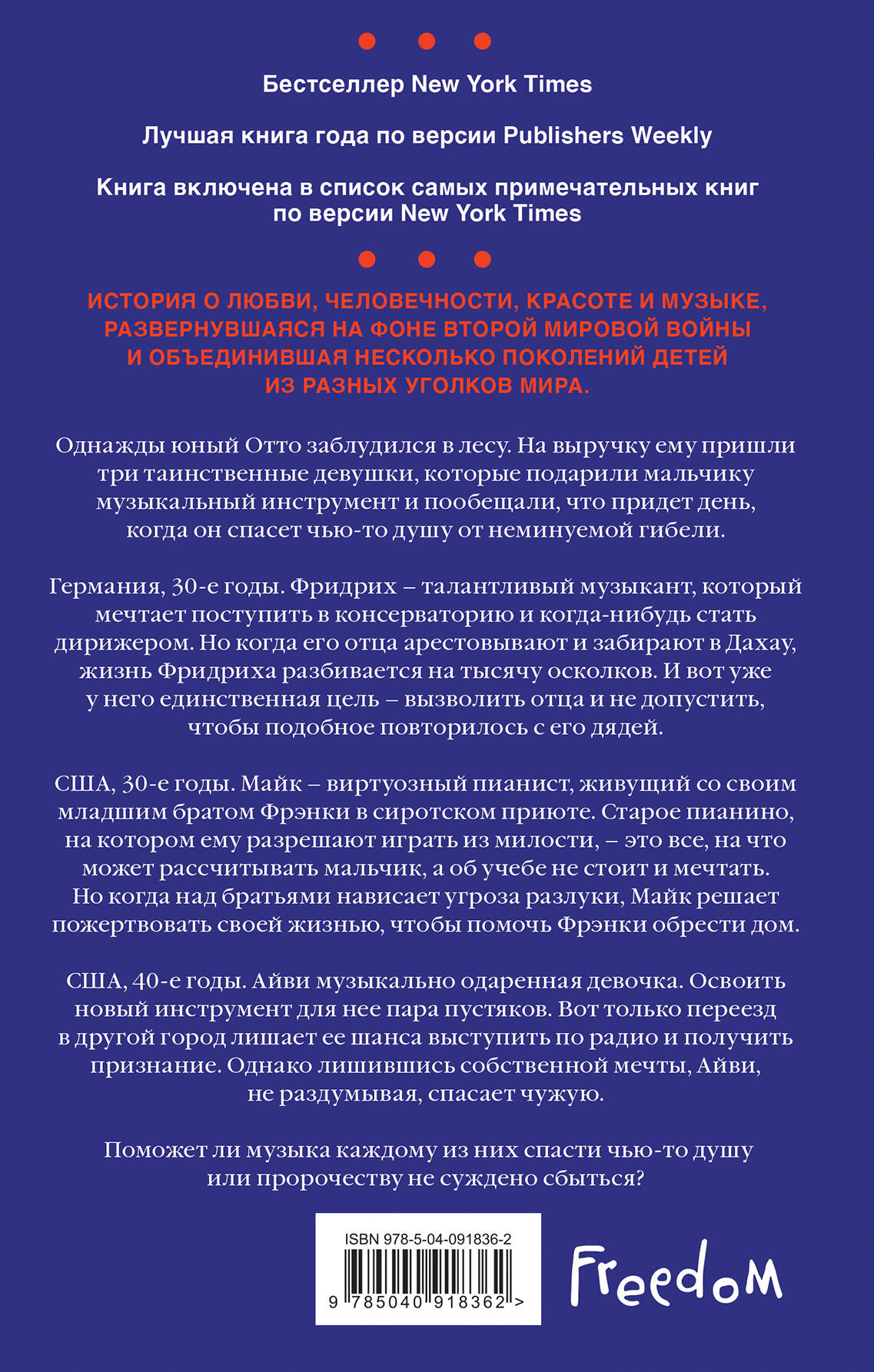 Книга - обладатель множества регалий: медаль Джона Ньюбери, бестселлер New York Times, книга года по версии Publishers Weekly, книга включена в список выдающихся книг New York Times. Автор романа - обладательница множества литературных премий и наград: медаль Джона Ньюбери за вклад в литературу, дважды медаль Pura Belpre, премия Kirkus, золотая премия NAPPA и др. Роман - настоящая современная классика, которую можно порекомендовать к обязательному прочтению в школе! Тонкая, трогательная, лиричная проза в великолепном переводе. История о любви, всепрощении, верности, преданности и самоотверженности, развернувшаяся на фоне Второй мировой войны. Одним из полноправных действующих лиц является музыка! Это роман, от которого у вас побегут мурашки по коже, настолько необычно построено повествование: три главных сюжетных линии, три главных героя, но вы ни за что не догадаетесь, как они связаны, ведь каждая линия резко обрывается. Чтобы узнать, нужно дочитать до конца!| Издательство | ООО "Издательство "Эксмо" |