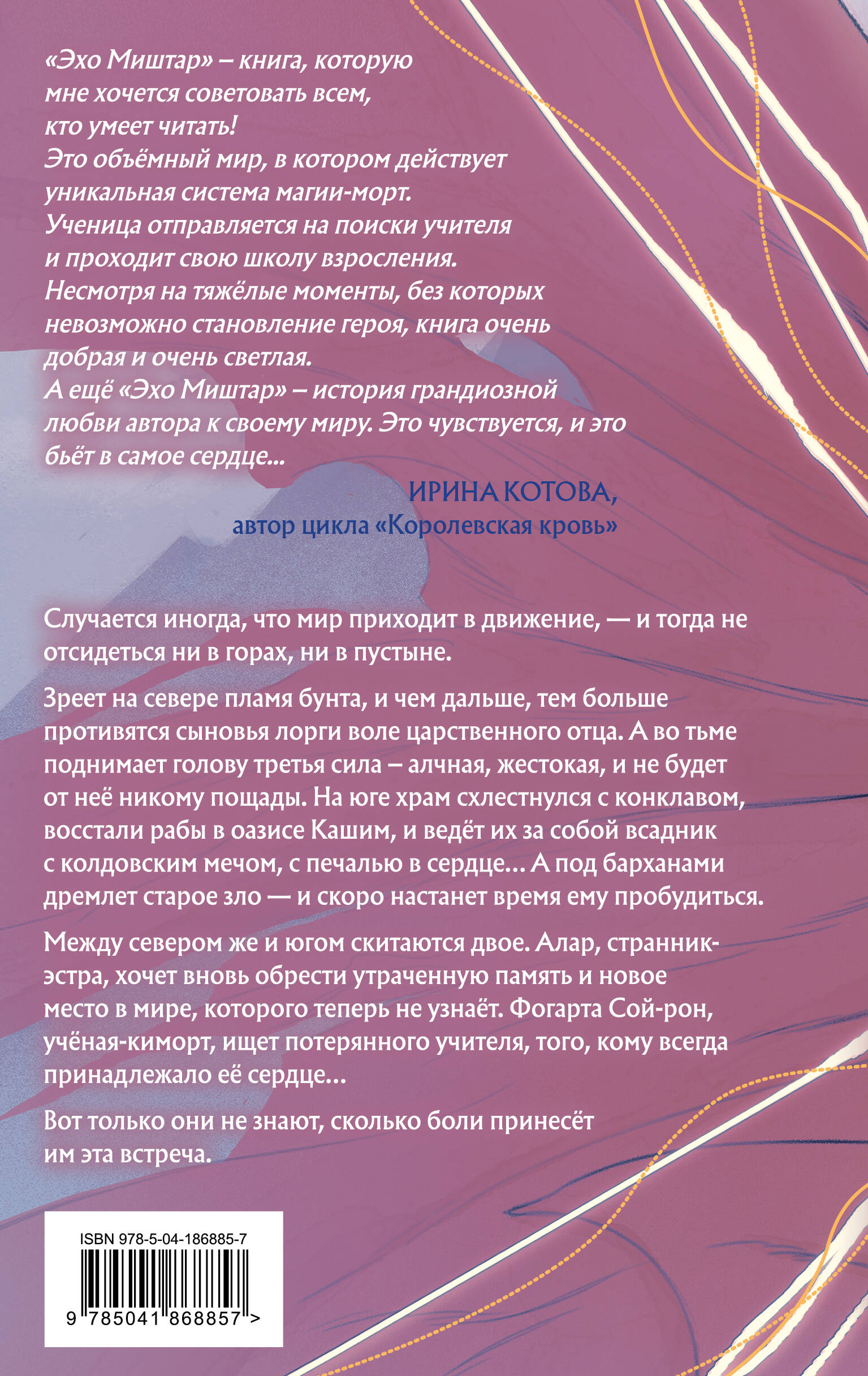 Случается иногда, что мир приходит в движение - и тогда не отсидеться ни в горах, ни в пустыне. Зреет на севере пламя бунта, и чем дальше, тем больше противятся сыновья лорги воле царственного отца. А во тьме поднимает голову третья сила - алчная, жестокая, и не будет от неё никому пощады. На юге храм схлестнулся с конклавом, восстали рабы в оазисе Кашим, и ведёт их за собой всадник с колдовским мечом, с печалью в сердце… А под барханами дремлет старое зло - и скоро настанет время ему пробудиться. Между севером же и югом скитаются двое. Алар, странник-эстра, хочет вновь обрести утраченную память - и новое место в мире, который теперь не узнаёт. Фогарта Сой-рон, учёная-киморт, ищет потерянного учителя, того, кому всегда принадлежало её сердце… Вот только они не знают, сколько боли принесёт им эта встреча. Завершающий роман дилогии «Эхо Миштар» от автора популярной книги «Тимьян и клевер» Софьи Ролдугиной. Умное фэнтези в редком жанре эфирпанка. Философско-социальный роман взросления с четким тропом становления героя. Множество авторских деталей, продуманных Софьей Ролдугиной и делающих мир объемным и живым. Контрабандисты, перелеты на дирижаблях, вольный север и знойный юг - дух настоящих приключений! Издание дополнено иллюстрациями художницы HAIME перед каждой главой и картой на форзаце от художницы Aaerynn. К каждой книге в комплекте идет сюжетная открытка от художницы Anne Svart.| Издательство | ООО "Издательство "Эксмо" |