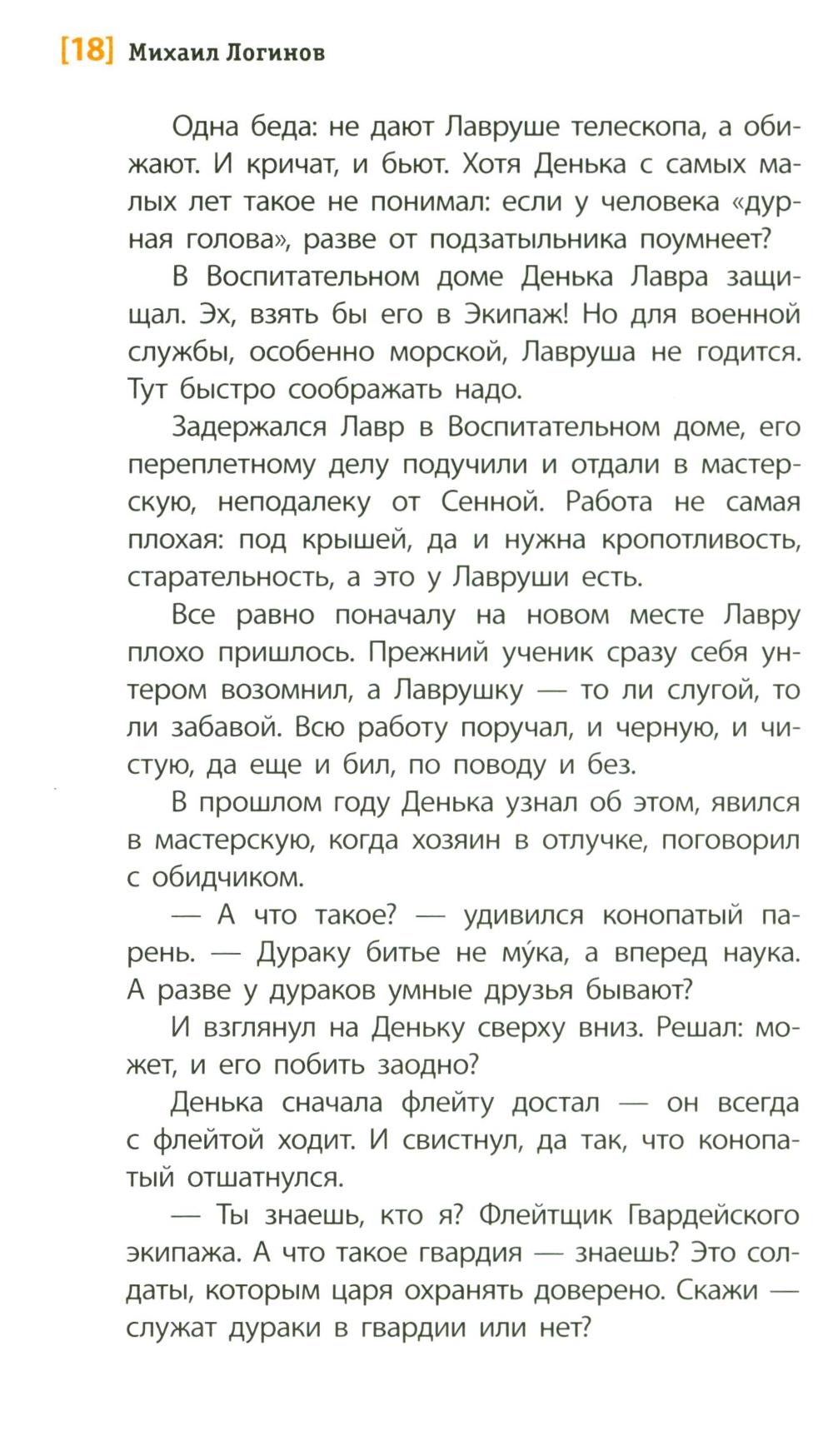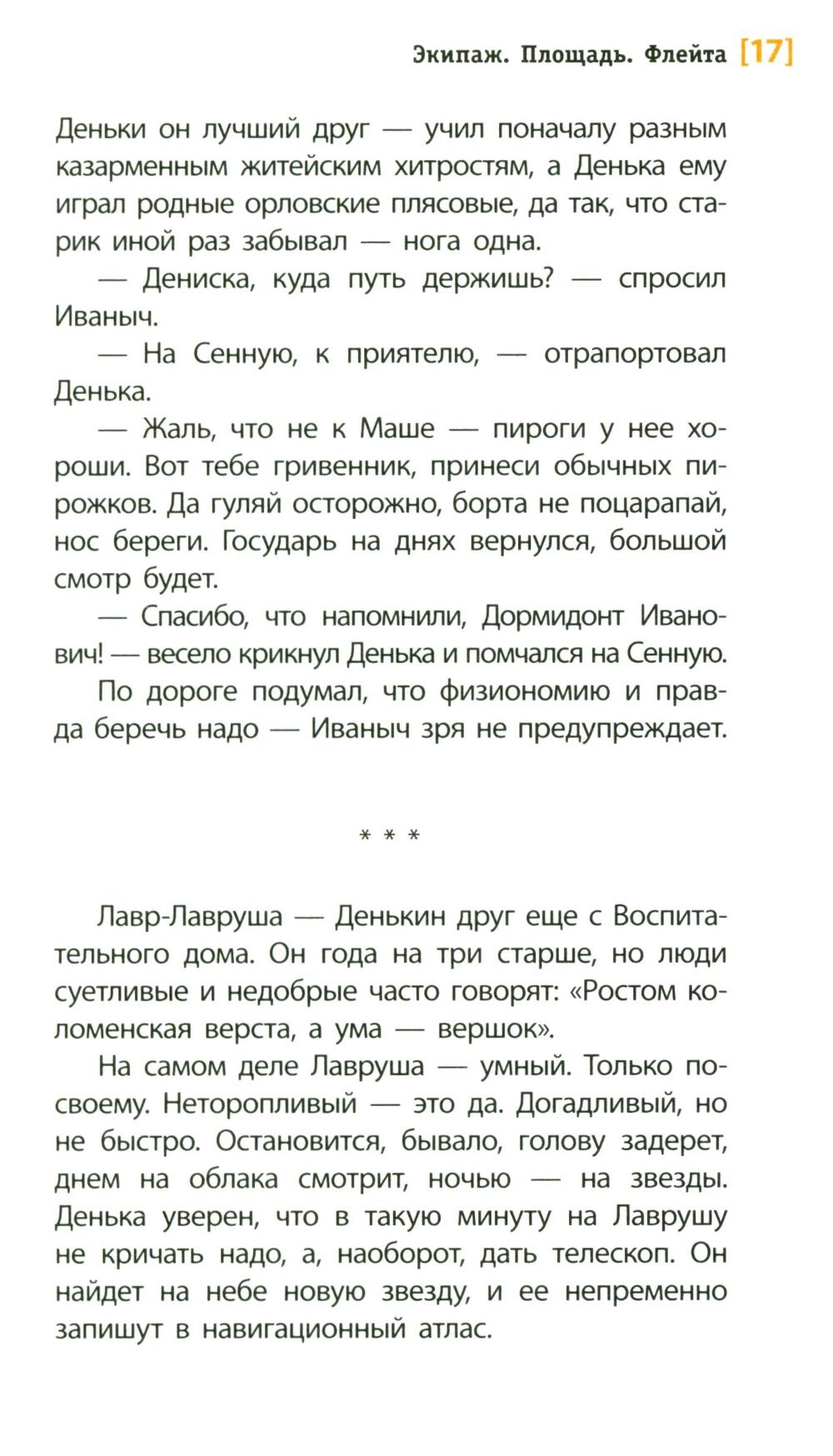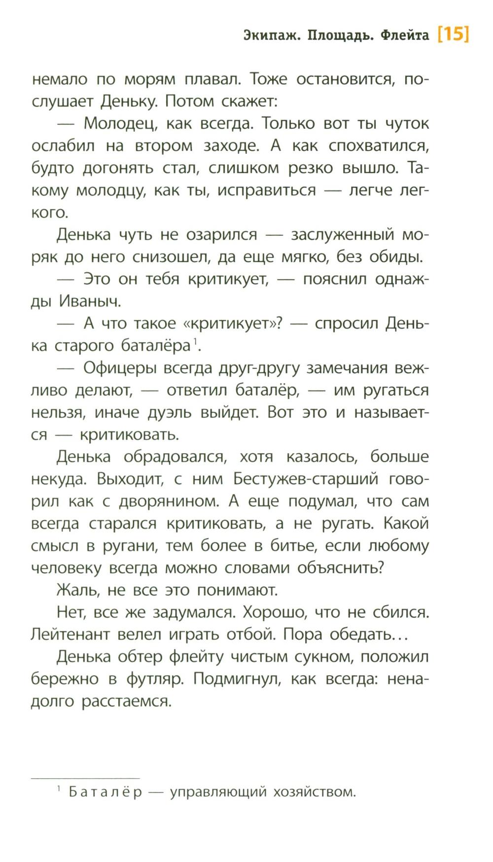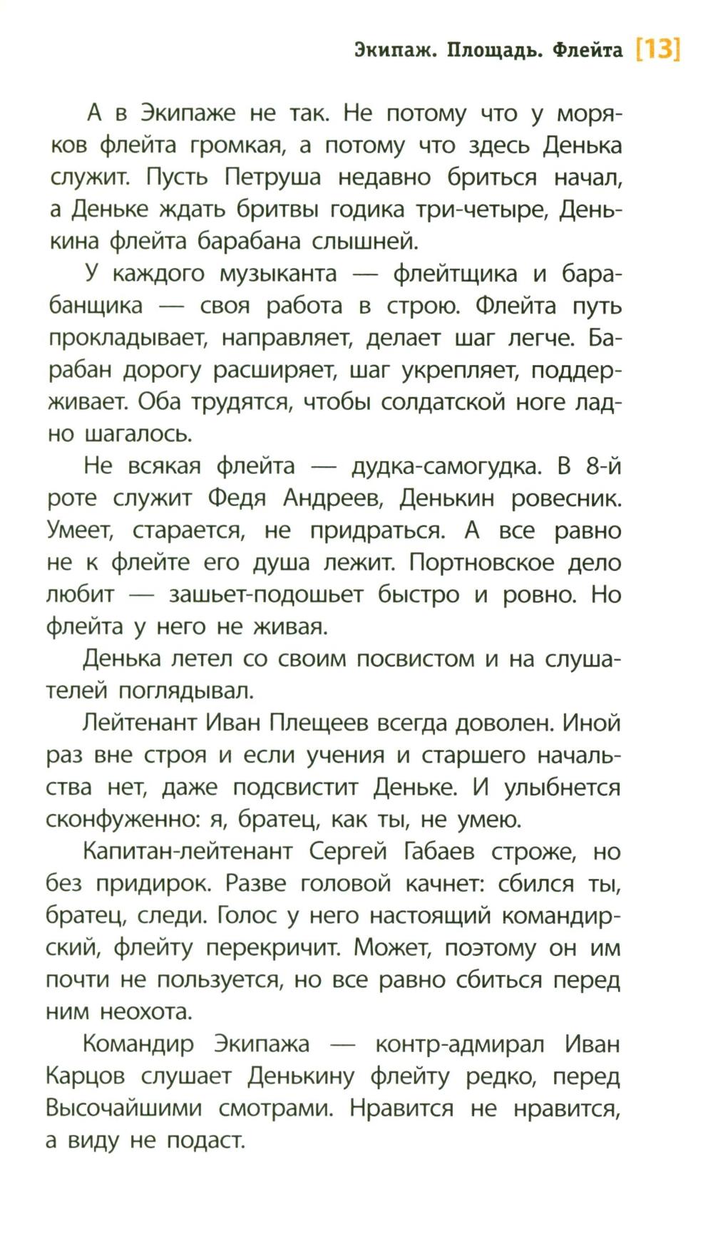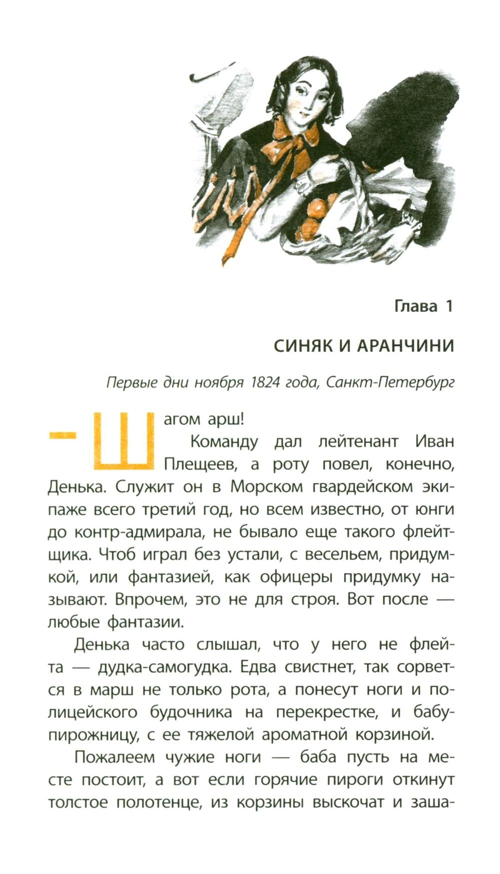 Историческая повесть, рассказывающая о юном флейтисте Денисе, служащем в Морском гвардейском экипаже. Повесть наполнена звуками: мелодиями флейты и фортепиано, ударами барабана, пением птиц, голосами улицы, шумом балтийских волн и свистом ветра. Глазами 13-летнего подростка показан один год из жизни страны, который вместил и небывалое по своей силе наводнение в ноябре 1824 года в Санкт-Петербурге, и восстание 14 декабря 1825 года на Сенатской площади. Читатель как будто проживает с героями это время, знакомится с реальными историческими персонажами той эпохи - офицерами и рядовыми, великими князьями и простыми горожанами того времени. Для среднего и старшего школьного возраста.| Издательство | Детская литература |