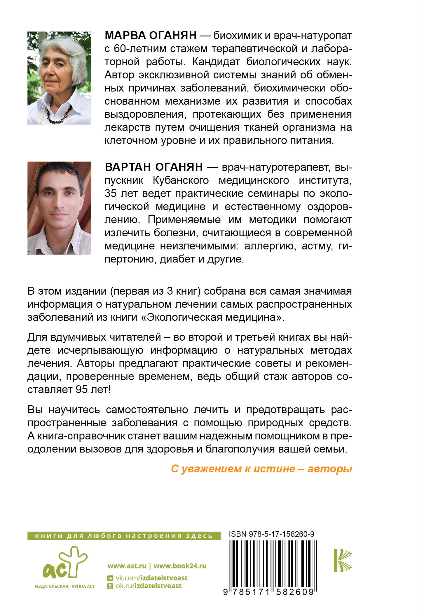 Марва Оганян - биохимик и врач-натуропат с 60-летним стажем терапевтической и лабораторной работы. Кандидат биологических наук. Автор эксклюзивной системы знаний об обменных причинах заболеваний, биохимически обоснованном механизме их развития и способах выздоровления, протекающих без применения лекарств путем очищения тканей организма на клеточном уровне и их правильного питания. Вартан Оганян - врач-натуротерапевт, выпускник Кубанского медицинского института, 35 лет ведет практические семинары по экологической медицине и естественному оздоровлению. Применяемые им методики помогают излечить болезни, считающиеся в современной медицине неизлечимыми: аллергию, астму, гипертонию, диабет и другие. В этом издании (первая из 3 книг) собрана вся самая значимая информация о натуральном лечении самых распространенных заболеваний из книги "Экологическая медицина". Для вдумчивых читателей - во второй и третьей книгах вы найдете исчерпывающую информацию о натуральных методах лечения. Авторы предлагают практические советы и рекомендации, проверенные временем, ведь общий стаж авторов составляет 95 лет! Вы научитесь самостоятельно лечить и предотвращать распространенные заболевания с помощью природных средств. А книга-справочник станет вашим надежным помощником в преодолении вызовов для здоровья и благополучия вашей семьи. С уважением к истине - авторы| Издательство | ИЗДАТЕЛЬСТВО "АСТ" |