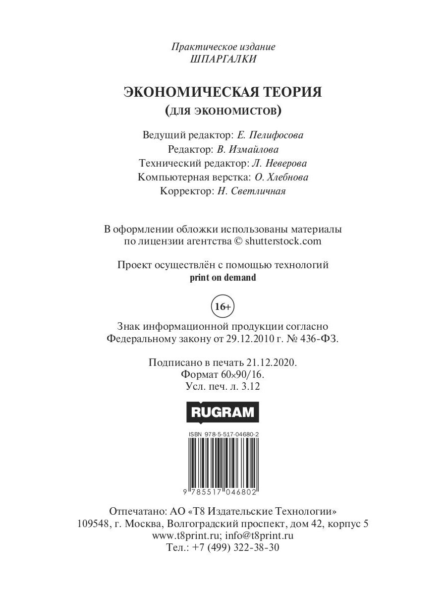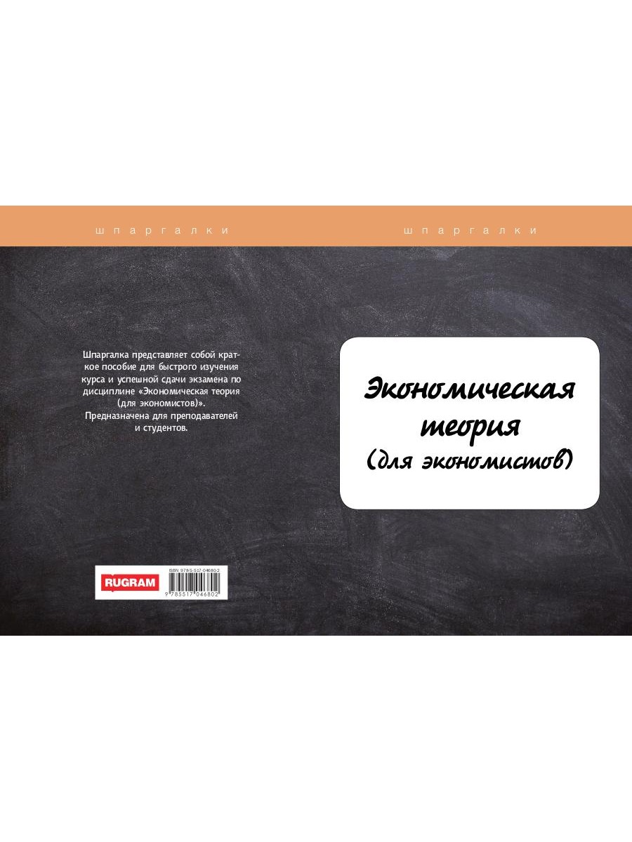 Шпаргалка представляет собой краткое пособие для быстрого изучения курса и успешной сдачи экзамена по дисциплине «Экономическая теория (для экономистов)». Предназначена для преподавателей и студентов.| Издательство | Т8 RUGRAM |