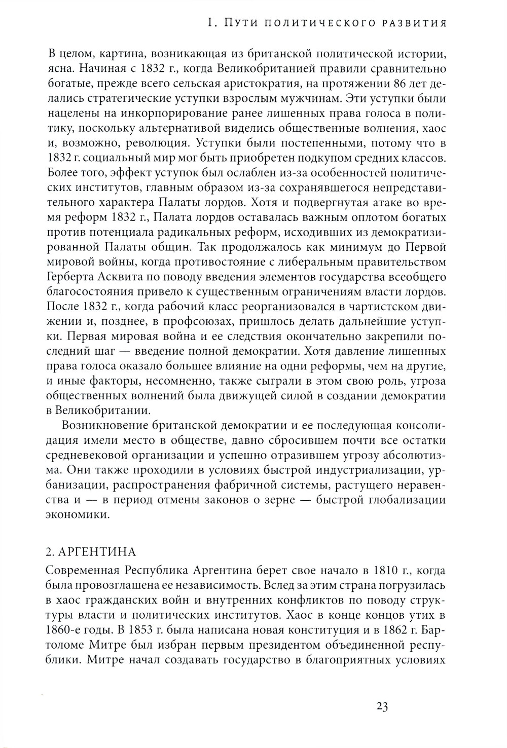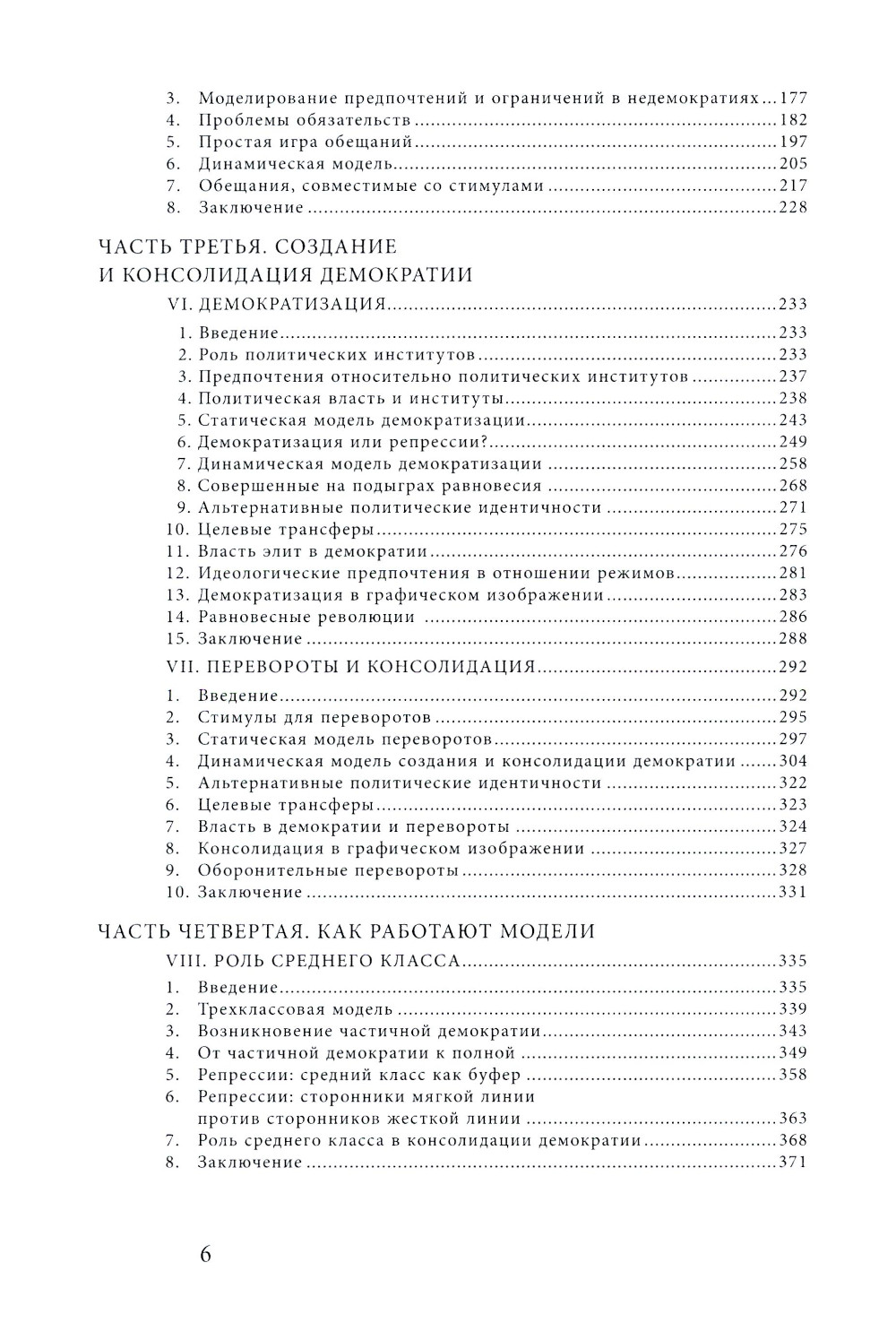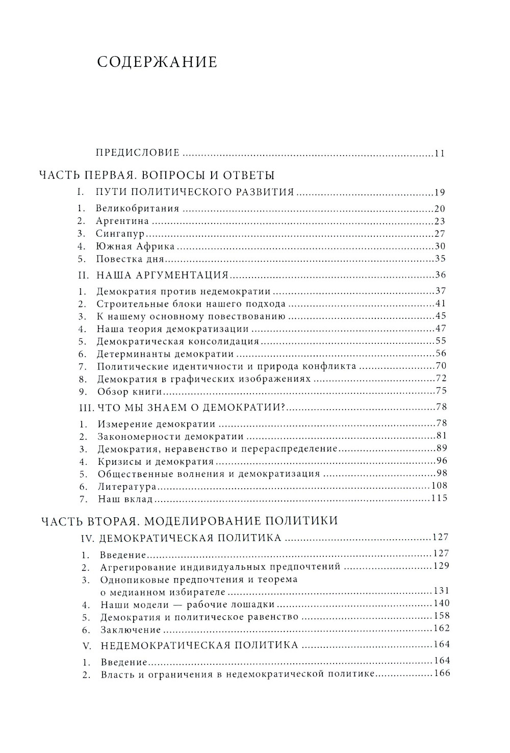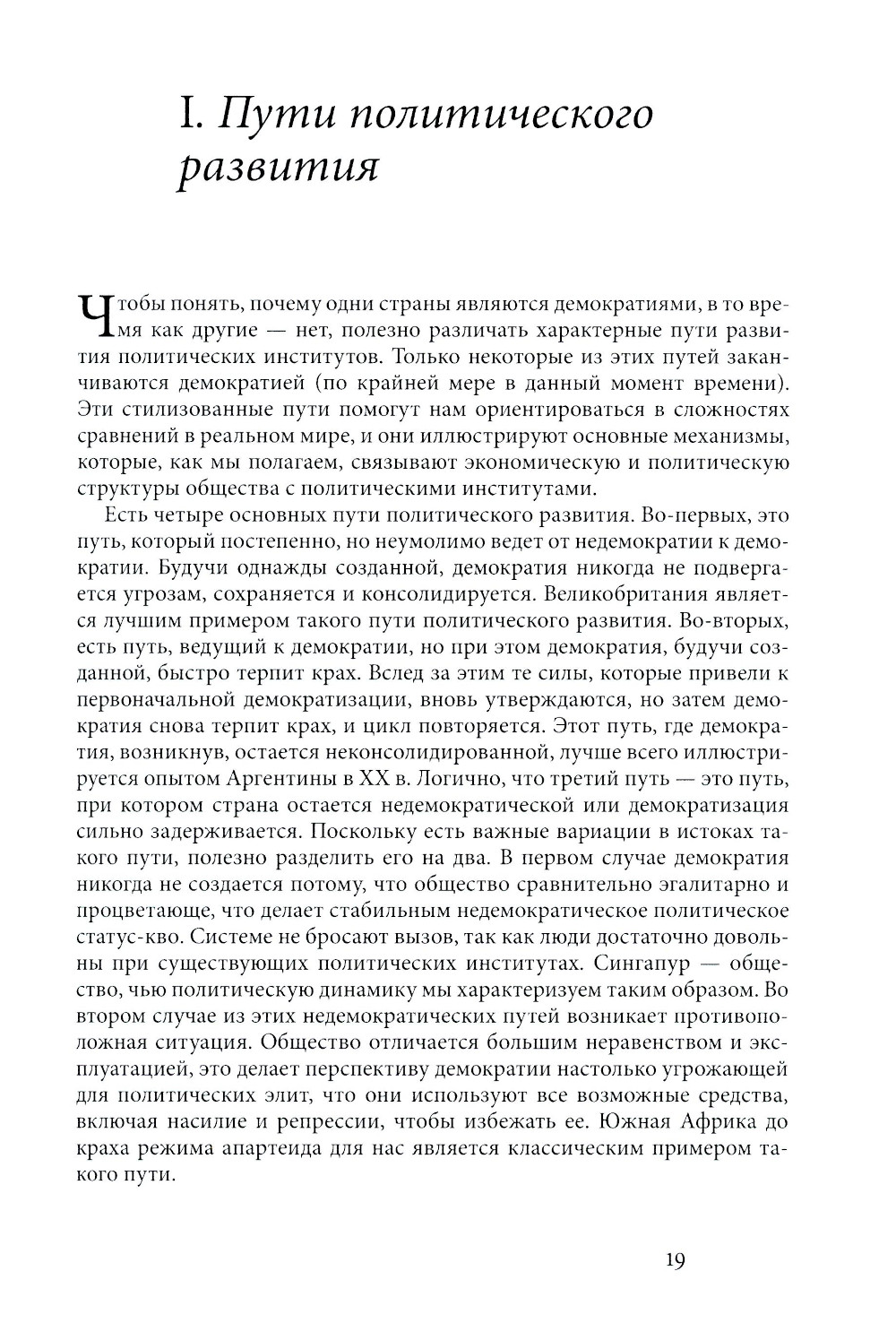 Научный бестселлер экономистов Дарона Аджемоглу и Джеймса А. Робинсона посвящен разработке концептуальных оснований для анализа создания и консолидации демократии. Авторы исходят из внешне простого тезиса о том, что различные социальные группы предпочитают различные политические институты из-за того, как они распределяют политическую власть и ресурсы. Так, демократию предпочитает большинство граждан, но ей противятся элиты. Однако диктатура нестабильна, когда граждане могут создавать угрозу общественных беспорядков и революции. В ответ на это, когда цена репрессий существенно высока и обещания уступок не вызывают доверия, элиты могут быть вынуждены создать демократию. Через демократизацию элиты вызывающим доверие образом передают политическую власть гражданам, обеспечивая социальную стабильность. Демократия консолидируется, когда у элит нет сильных стимулов для ее свержения. Эти процессы зависят от силы гражданского общества, структуры политических институтов, природы политических и экономических кризисов, уровня экономического неравенства, структуры экономики и формы и масштаба глобализации.