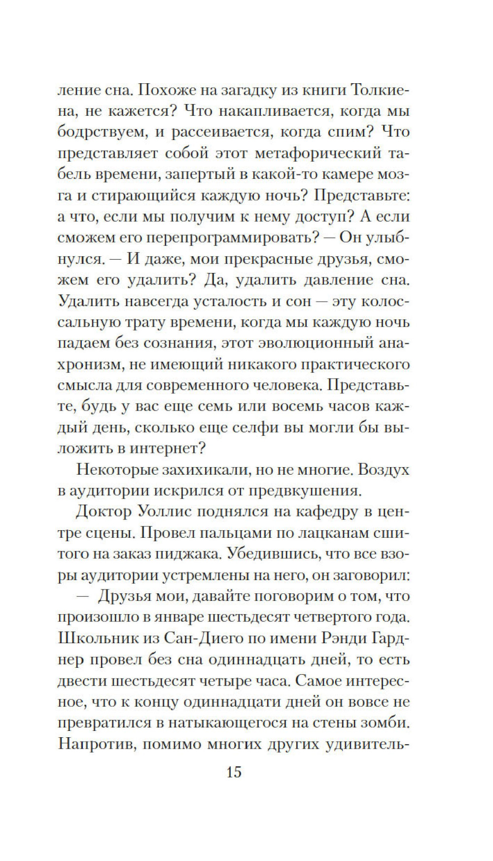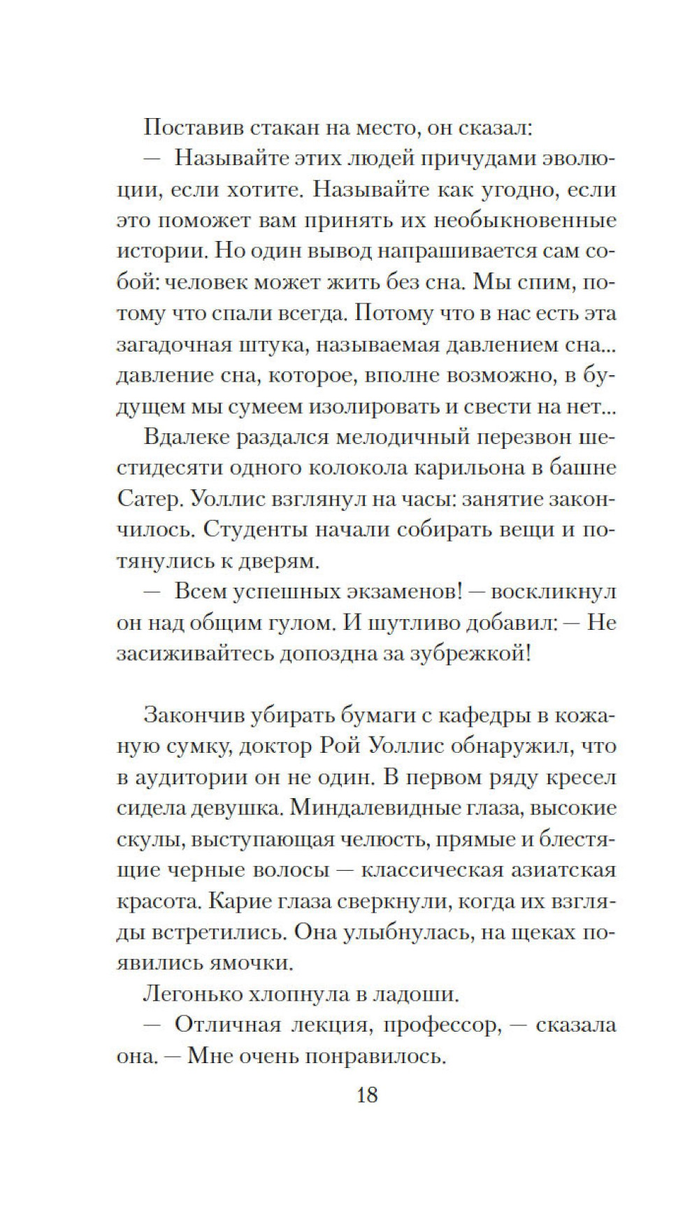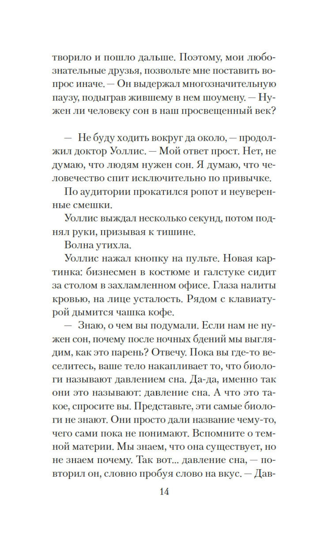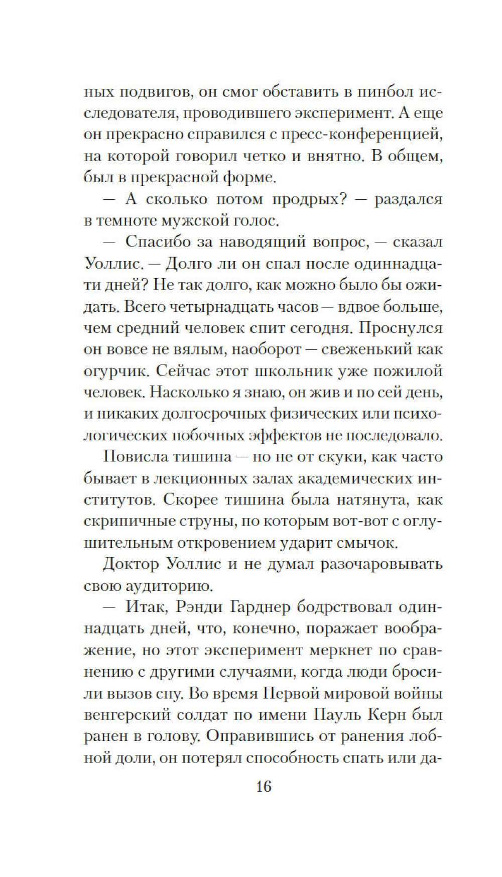 Действительно ли человеку жизненно необходим сон? Или это своего рода атавизм, унаследованный от доисторических предков? Видный психолог Рой Уоллис из университета в Беркли считает, что люди вполне могут обходиться без сна, и намерен доказать это на опыте, чтобы облагодетельствовать человечество и вписать свое имя в историю науки. Существует известная городская легенда, что в 1954 году в СССР провели эксперимент по лишению сна на заключенных, пообещав им свободу. Никто из подопытных не выжил… И в 2018 году профессор Уоллис получает разрешение провести аналогичный опыт на добровольцах. Что может пойти не так?| Издательство | Иностранка |