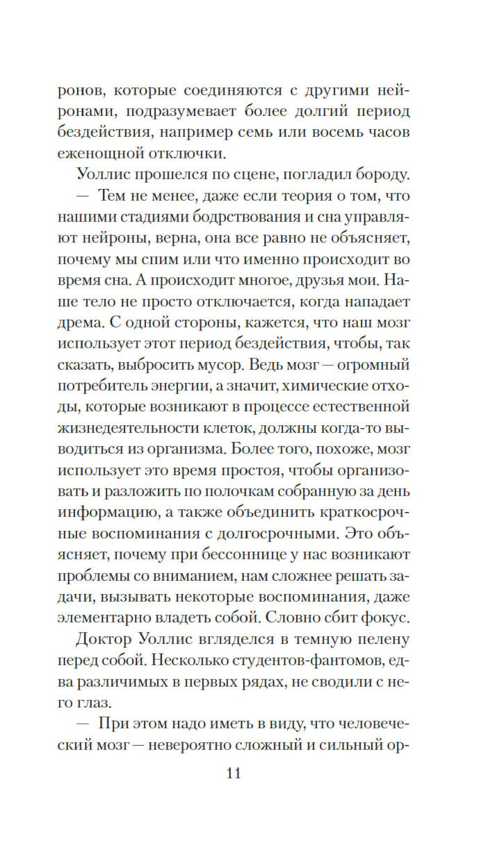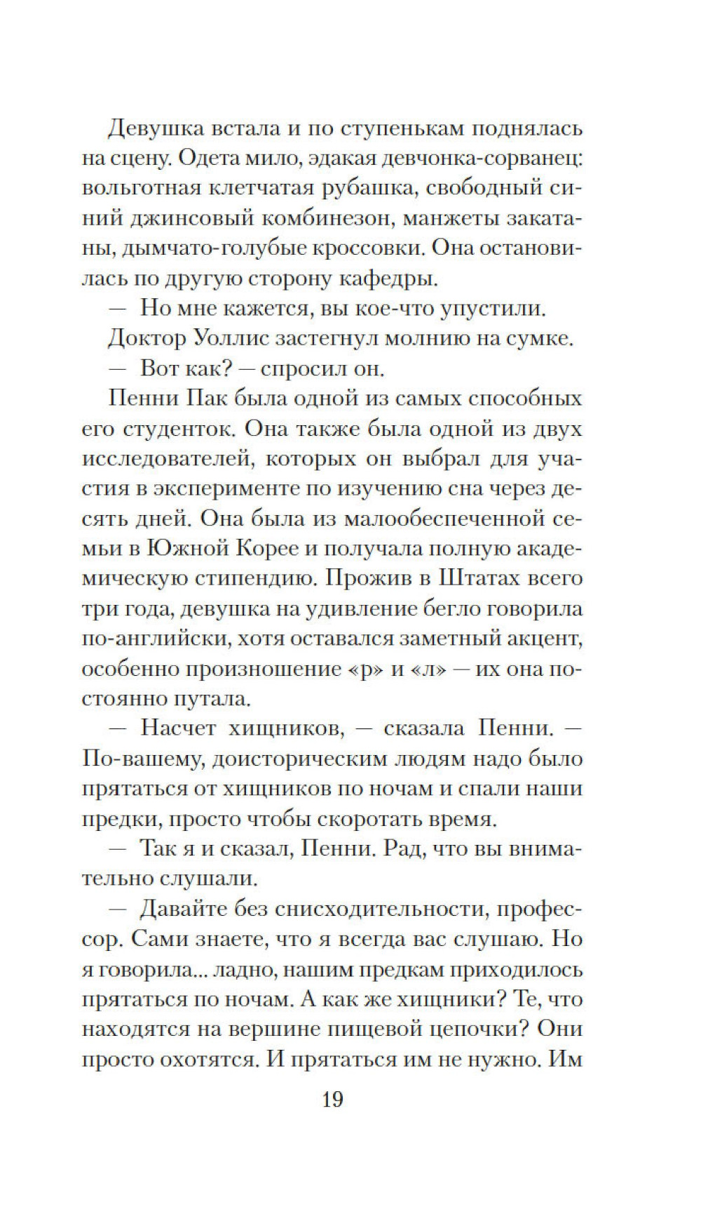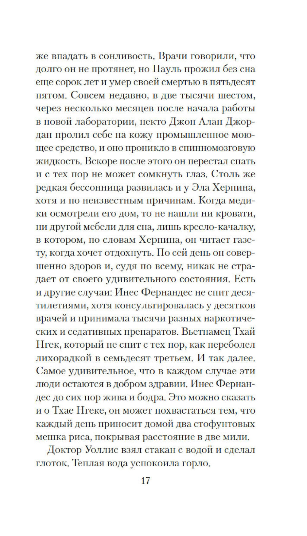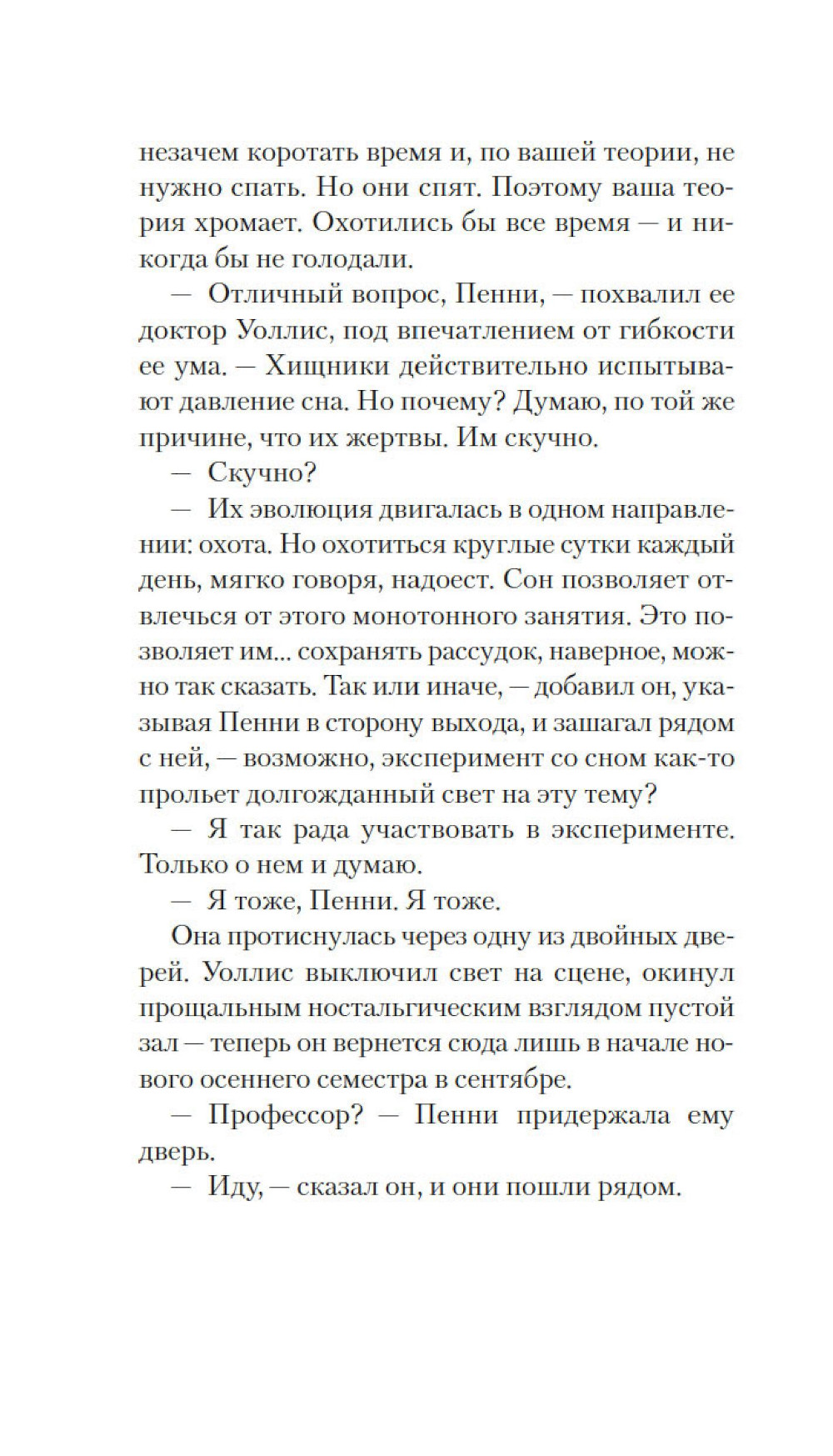 Действительно ли человеку жизненно необходим сон? Или это своего рода атавизм, унаследованный от доисторических предков? Видный психолог Рой Уоллис из университета в Беркли считает, что люди вполне могут обходиться без сна, и намерен доказать это на опыте, чтобы облагодетельствовать человечество и вписать свое имя в историю науки. Существует известная городская легенда, что в 1954 году в СССР провели эксперимент по лишению сна на заключенных, пообещав им свободу. Никто из подопытных не выжил… И в 2018 году профессор Уоллис получает разрешение провести аналогичный опыт на добровольцах. Что может пойти не так?| Издательство | Иностранка |