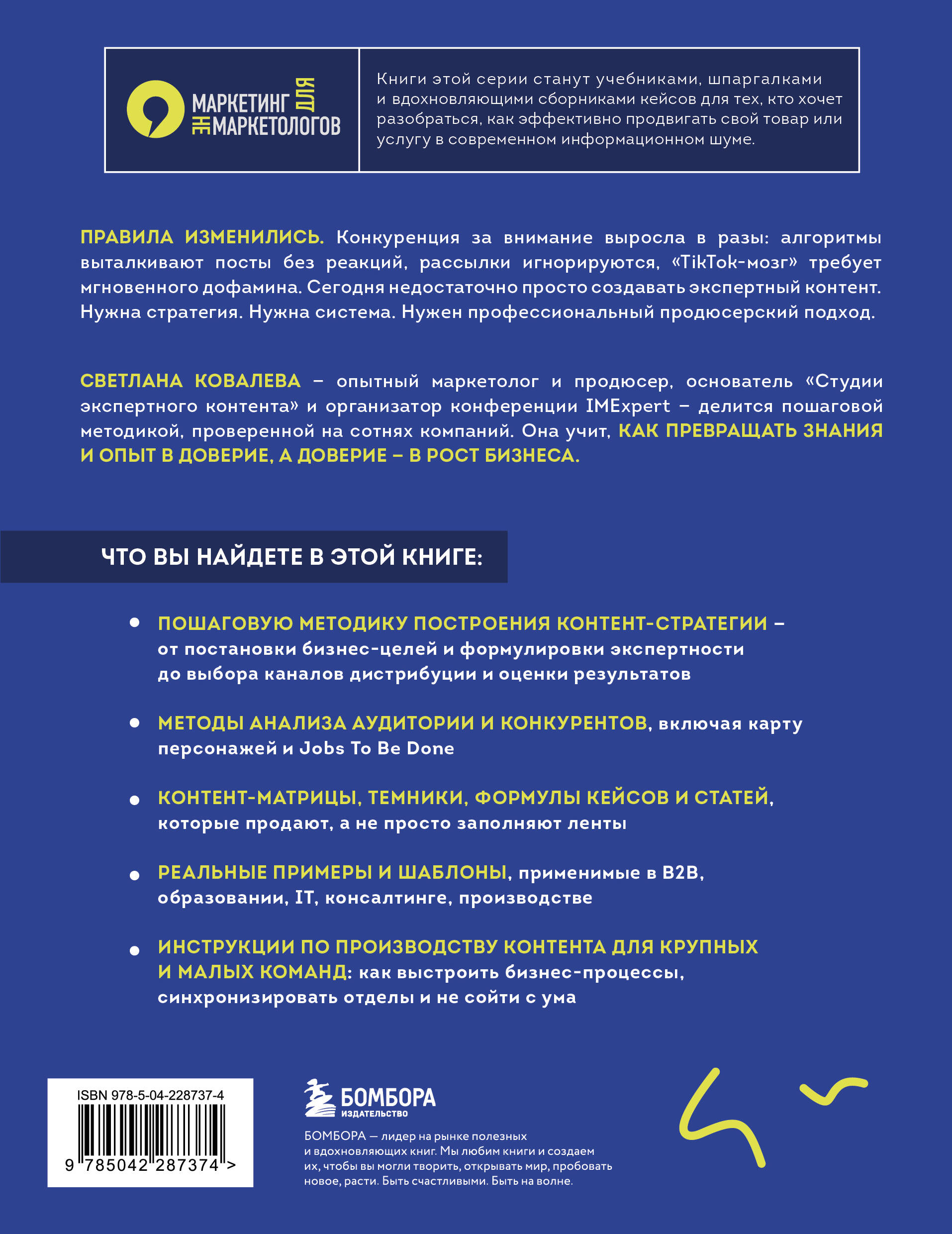 Правила изменились. Конкуренция за внимание выросла в разы: алгоритмы выталкивают посты без реакций, рассылки игнорируются, "TikTok-мозг" требует мгновенного дофамина. Сегодня недостаточно просто создавать экспертный контент. Нужна стратегия. Нужна система. Нужен профессиональный продюсерский подход. Светлана Ковалева - опытный маркетолог и продюсер, основатель "Студии экспертного контента" и организатор конференции IMExpert - делится пошаговой методикой, проверенной на сотнях компаний. Она учит, как превращать знания и опыт в доверие, а доверие - в рост бизнеса. Что вы найдете в этой книге: - Пошаговую методику построения контент-стратегии - от постановки бизнес-целей и формулировки экспертности до выбора каналов дистрибуции и оценки результатов. - Методы анализа аудитории и конкурентов, включая карту персонажей и Jobs To Be Done. - Контент-матрицы, темники, формулы кейсов и статей, которые продают, а не просто заполняют ленты. - Реальные примеры и шаблоны, применимые в B2B, образовании, IT, консалтинге, производстве. - Инструкции по производству контента для крупных и малых команд: как выстроить бизнес-процессы, синхронизировать отделы и не сойти с ума.| Издательство | ООО "Издательство "Эксмо" |