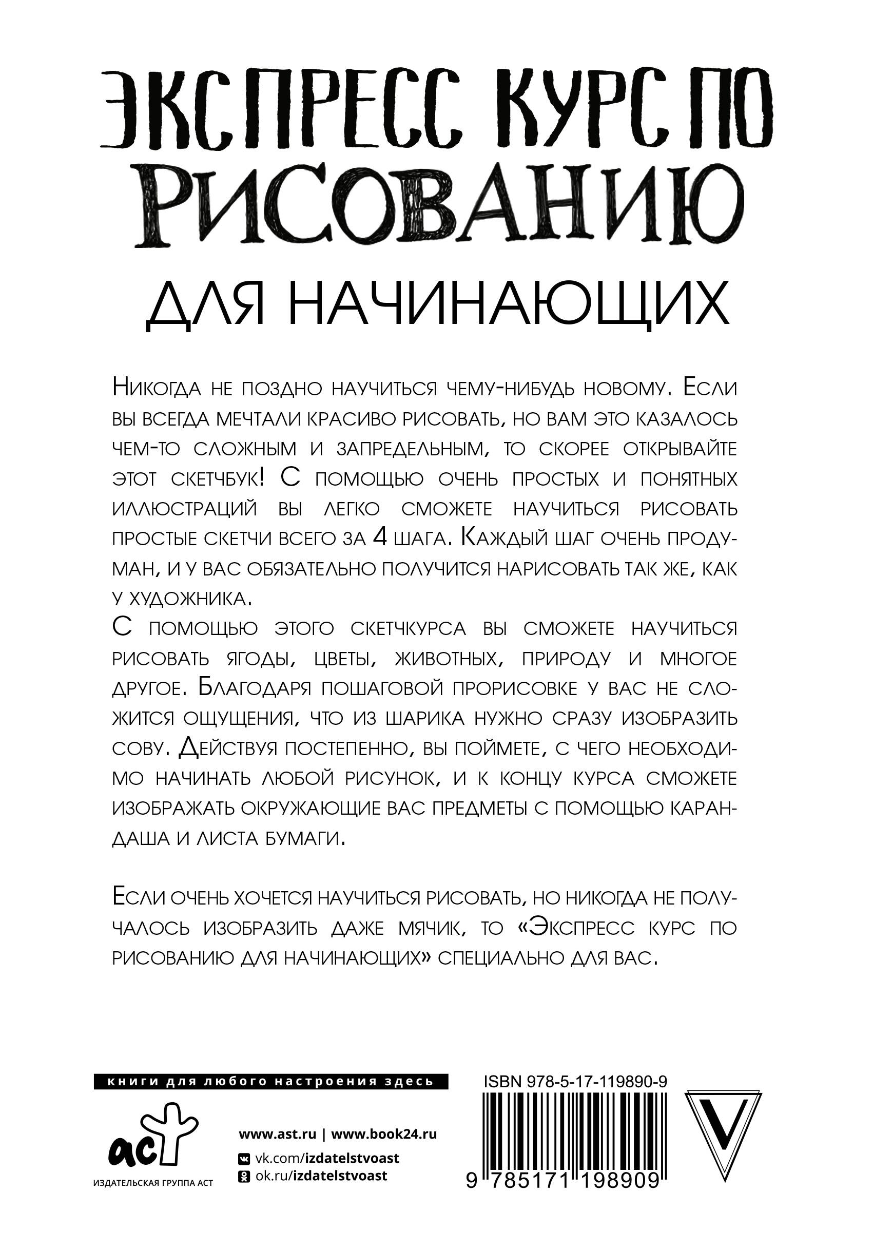 Экспресс-курс по рисованию для всех. Скетчинг помогает развить творческую жилку и успокаивает нервы. Рисовать можно в метро, на работе в обед, на скучных лекциях и на подоконнике дома уютными вечерами. Эксклюзивные рисунки от профессионального художника. Научитесь рисовать всего за 4 шага| Издательство | ИЗДАТЕЛЬСТВО "АСТ" |