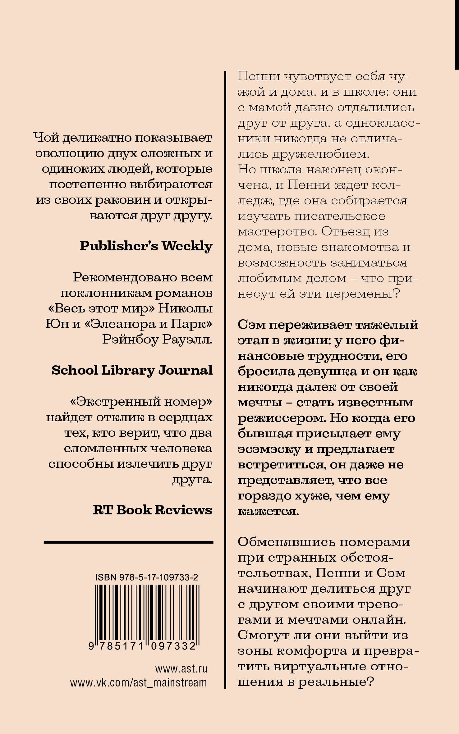 Пенни чувствует себя чужой и дома, и в школе: они с мамой давно отдалились друг от друга, а одноклассники никогда не отличались дружелюбием. Но школа наконец окончена, и Пенни ждет колледж, где она собирается изучать писательское мастерство. Отъезд из дома, новые знакомства и возможность заниматься любимым делом - что принесут ей эти перемены? Сэм переживает тяжелый этап в жизни: у него финансовые трудности, его бросила девушка и он как никогда далек от своей мечты - стать известным режиссером. Но когда его бывшая присылает ему эсэмэску и предлагает встретиться, он даже не представляет, что все гораздо хуже, чем ему кажется. Обменявшись номерами при странных обстоятельствах, Пенни и Сэм начинают делиться друг с другом своими тревогами и мечтами онлайн. Смогут ли они выйти из зоны комфорта и превратить виртуальные отношения в реальные?| Издательство | Издательство "АСТ" |