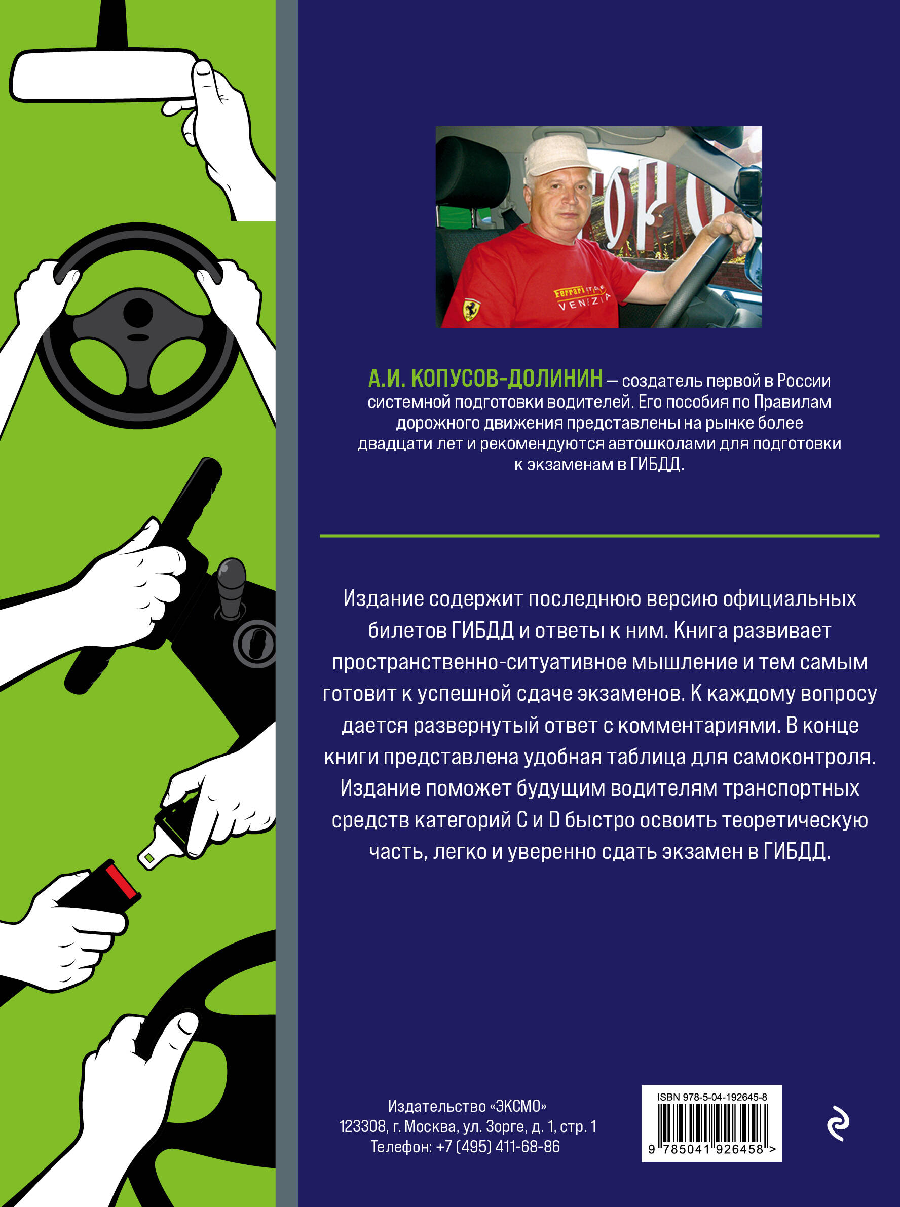 Издание содержит последнюю версию официальных билетов ГИБДД и ответы к ним. Книга развивает пространственно-ситуативное мышление и тем самым готовит к успешной сдаче экзаменов. К каждому вопросу дается развернутый ответ с комментариями. В конце книги представлена удобная таблица для самоконтроля. Книга адресована будущим водителям транспортных средств категорий C и D и помогает им сдать теоретическую часть легко и уверенно. Алексей Иванович Копусов-Долинин - создатель первой в России системной методики подготовки водителей. Его пособия представлены на рынке более двадцати лет и рекомендуются автошколами для подговки к экзаменам в ГИБДД.| Издательство | ООО "Издательство "Эксмо" |