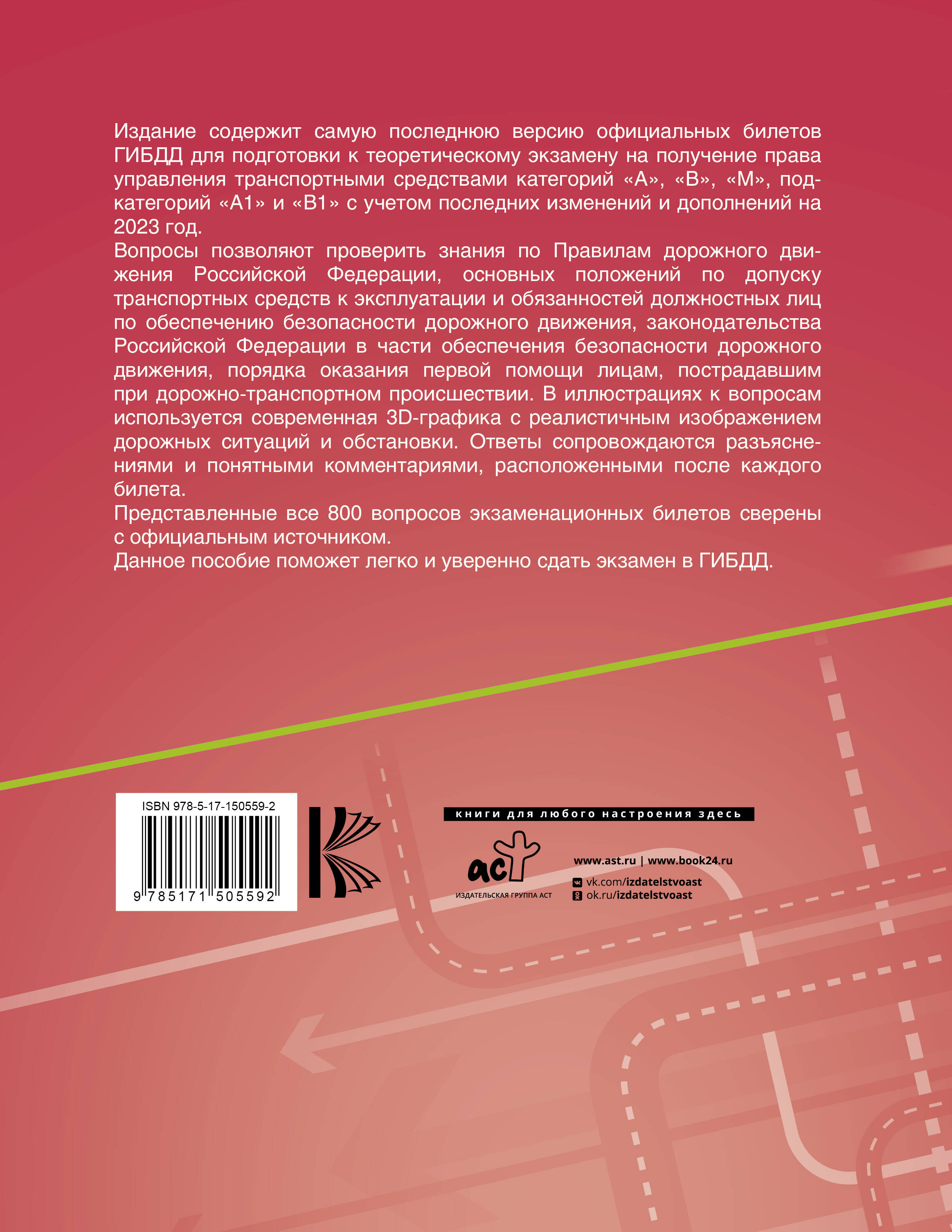 Издание содержит самую последнюю версию официальных билетов ГИБДД для подготовки к теоретическому экзамену на получение права управления транспортными средствами категорий "А", "В", "М", подкатегорий "А1" и "В1" с учетом последних изменений и дополнений на 2023 год. Вопросы позволяют проверить знания по Правилам дорожного движения Российской Федерации, основных положений по допуску транспортных средств к эксплуатации и обязанностей должностных лиц по обеспечению безопасности дорожного движения, законодательства Российской Федерации в части обеспечения безопасности дорожного движения, порядка оказания первой помощи лицам, пострадавшим при дорожно-транспортном происшествии. В иллюстрациях к вопросам используется современная 3D-графика с реалистичным изображением дорожных ситуаций и обстановки. Ответы сопровождаются разъяснениями и понятными комментариями, расположенными после каждого билета. Представленные все 800 вопросов экзаменационных билетов сверены с официальным источником. Данное пособие поможет легко и уверенно сдать экзамен в ГИБДД.