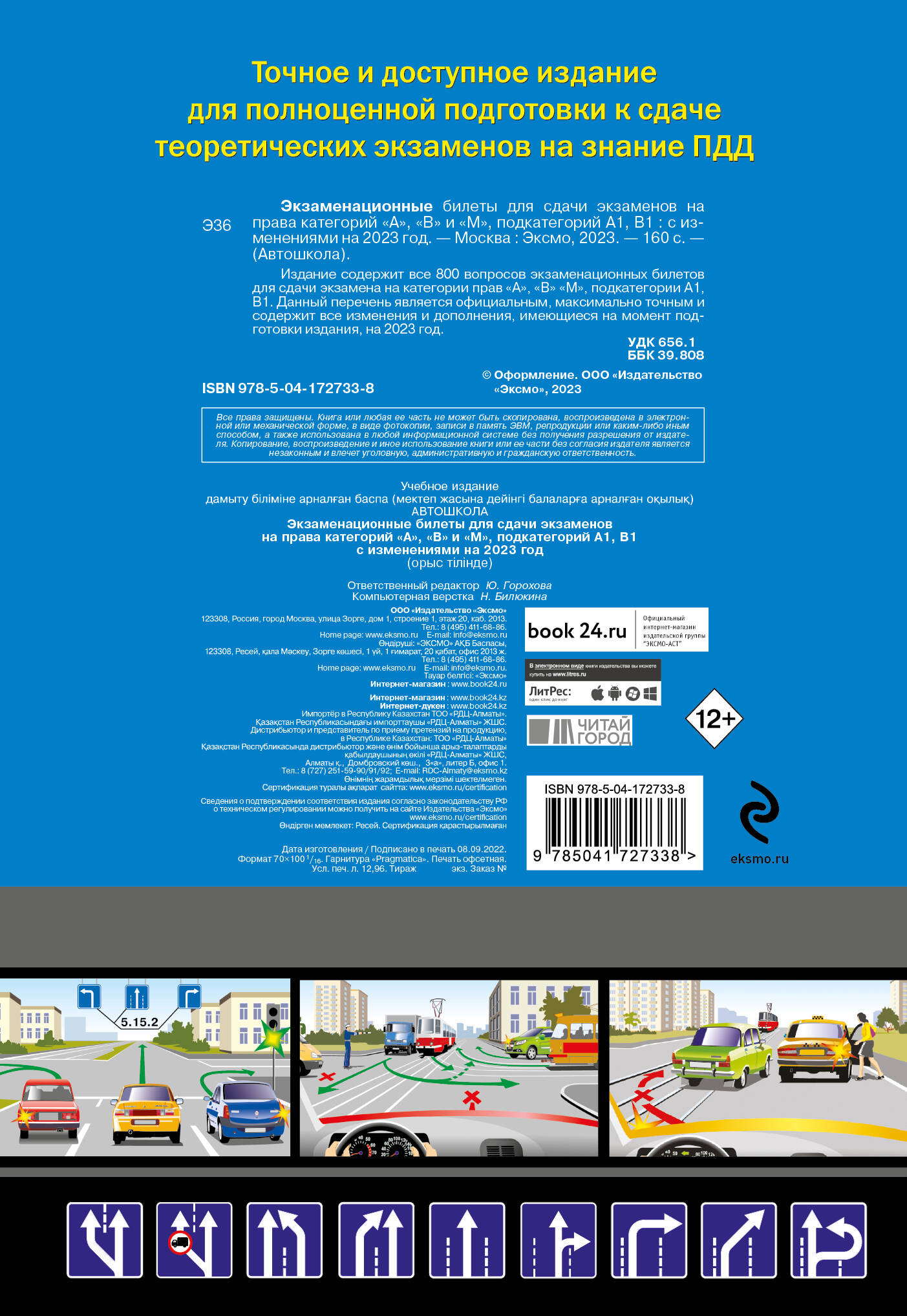 Издание содержит все 800 вопросов экзаменационных билетов для сдачи экзамена на категории прав "А", "В" "M", подкатегории A1, B1. Данный перечень является официальным, максимально точным и содержит все изменения и дополнения, имеющиеся на момент подготовки издания, на 2023 год.| Издательство | ООО "Издательство "Эксмо" |