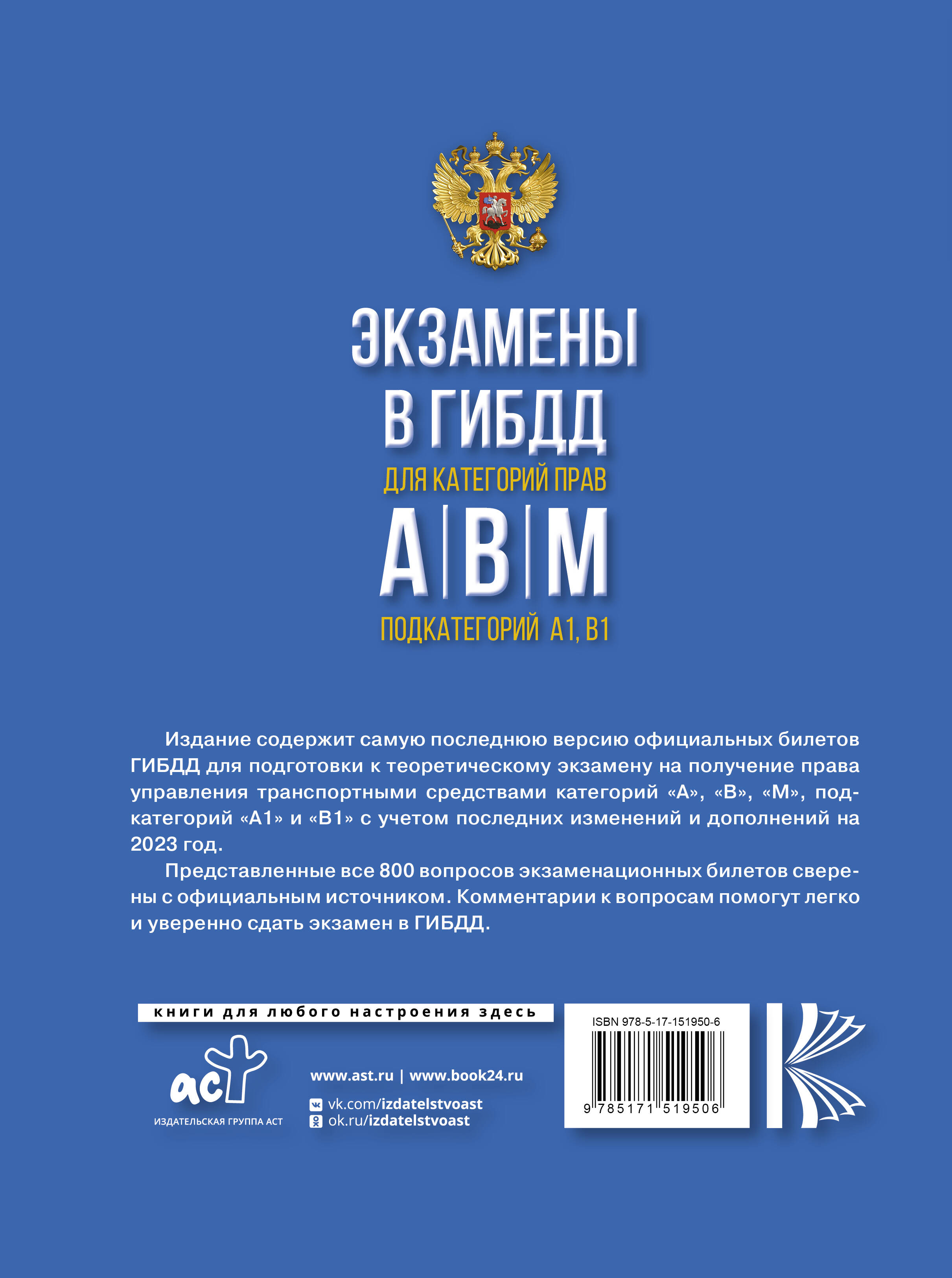 Аннотация: Экзамены в ГИБДД категорий А, В и М, подкатегорий А1 и В1 на 2023 год. Со всеми последними изменениями и дополнениями