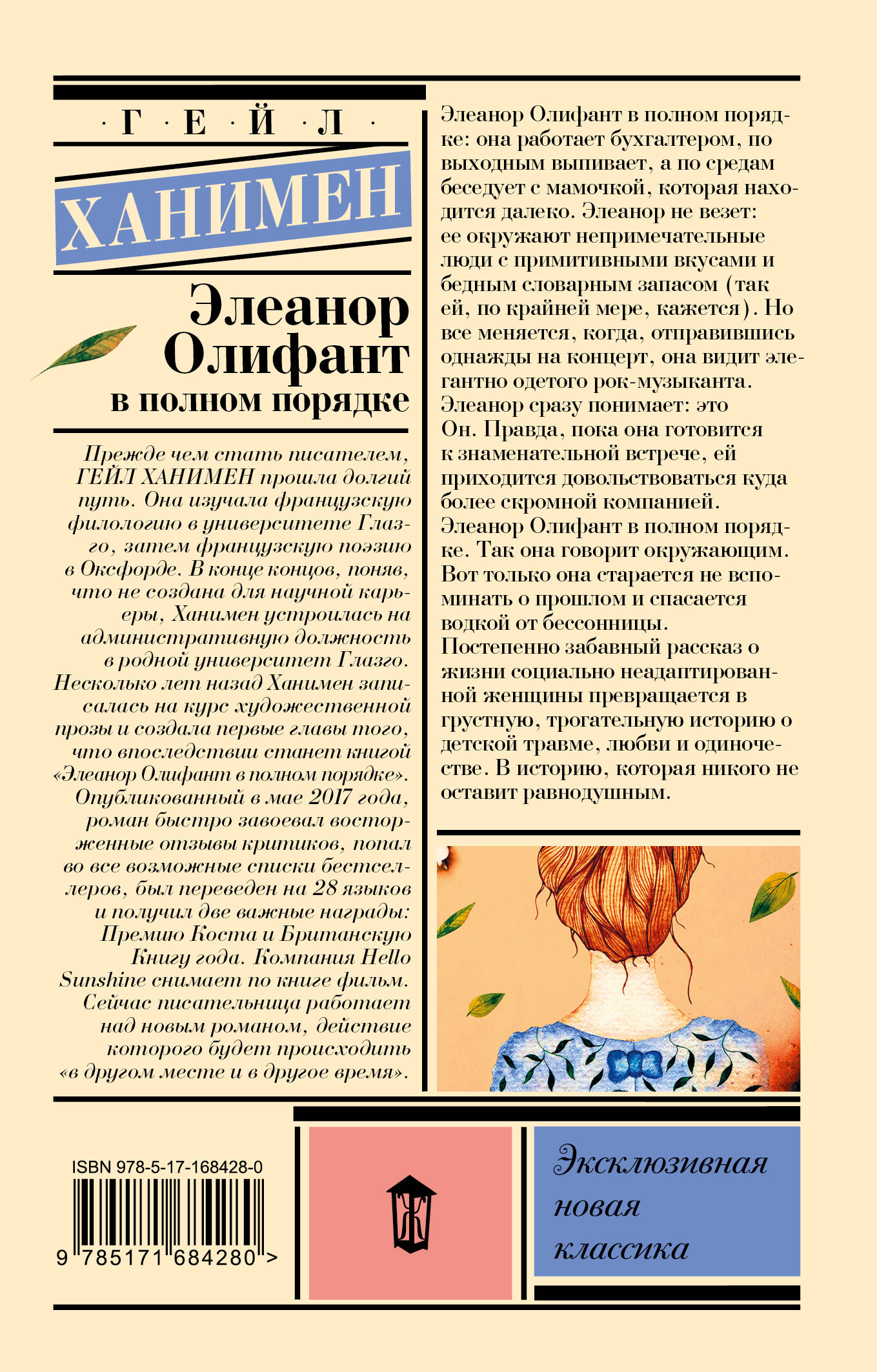 - Культовый роман шотландской писательницы - в серии «Эксклюзивная новая классика»! - Бестселлер The New York Times и Publishers Weekly. Обладатель престижной литературной премии «Коста». Выбор Книжного клуба Риз Уизерспун. - Права на экранизацию романа приобрела компания Риз Уизерспун Hello Sunshine. - Чуткая и чудна́я история об одиночестве любви и иллюзиях - странном, не всегда логичном мире Элеанор, в котором тем не менее нужно жить. Великолепный юмор и выстроившая целый бастион защит от реальности героиня, в которой так легко узнать себя. - Компактный карманный формат.