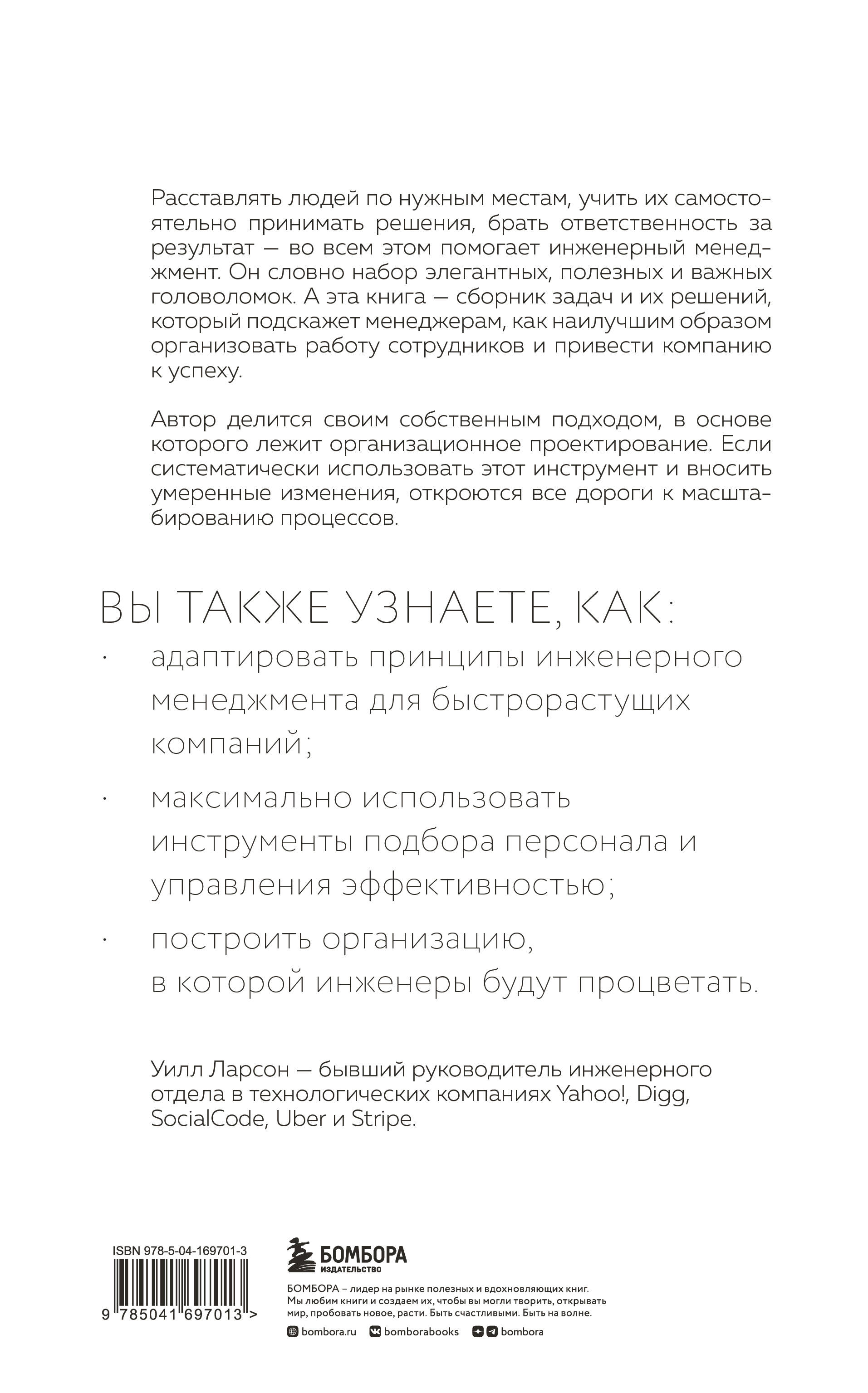 Расставлять людей по нужным местам, учить их самостоятельно принимать решения, брать ответственность за результат - во всем этом помогает инженерный менеджмент. Он словно набор элегантных, полезных и важных головоломок. А эта книга - сборник задач и их решений, который подскажет менеджерам, как наилучшим образом организовать работу сотрудников и привести компанию к успеху. Автор делится своим собственным подходом, в основе которого лежит организационное проектирование. Если систематически использовать этот инструмент и вносить умеренные изменения, откроются все дороги к масштабированию процессов. Вы также узнаете, как: • адаптировать принципы инженерного менеджмента для быстрорастущих компаний; • максимально использовать инструменты подбора персонала и управления эффективностью; • построить организацию, в которой инженеры будут процветать. Уилл Ларсон - бывший руководитель инженерного отдела в технологических компаниях Yahoo!, Digg, SocialCode, Uber и Stripe.| Издательство | ООО "Издательство "Эксмо" |