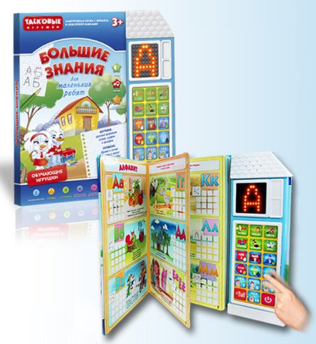 Электронная книга для маленьких детей от 3-х лет. Книга оснащена светодиодным экраном и сенсорной панелью. Имеет 5 основных режимов: буквы русского алфавита (озвучиваются буквы, не звуки), цифры от 1 до 10, цвета, математические фигуры, веселые мелодии.