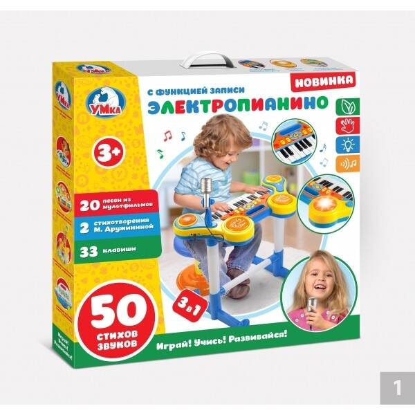 Электропианино с функцией записи станет любимым музыкальным инструментом ребёнка. У него есть 3 функции: - нажимай на клавиши пианино, кнопки и записывай свою мелодию; - поменяй режим, слушай песни и стихи знаменитой М. Дружининой; - включи микрофон и спой свои любимые песни. Всего на пианино записано 50 стихов и звуков, 20 песен из мультиков и установлено 33 клавиши. При воспроизведении включаются световые эффекты, которые позволят малышу создать своё яркое выступление. Пианино можно использовать со стойками и стульчиком, которые находятся в комплекте. Так ребёнок сможет по-настоящему почувствовать себя артистом и с интересом проводить время за клавишами. Развивает музыкальный слух, моторику, воображение и другие навыки. Для работы нужны 3 батарейки типа АА. Рекомендуется детям от 3 лет.| Издательство | СИМБАТ ООО |