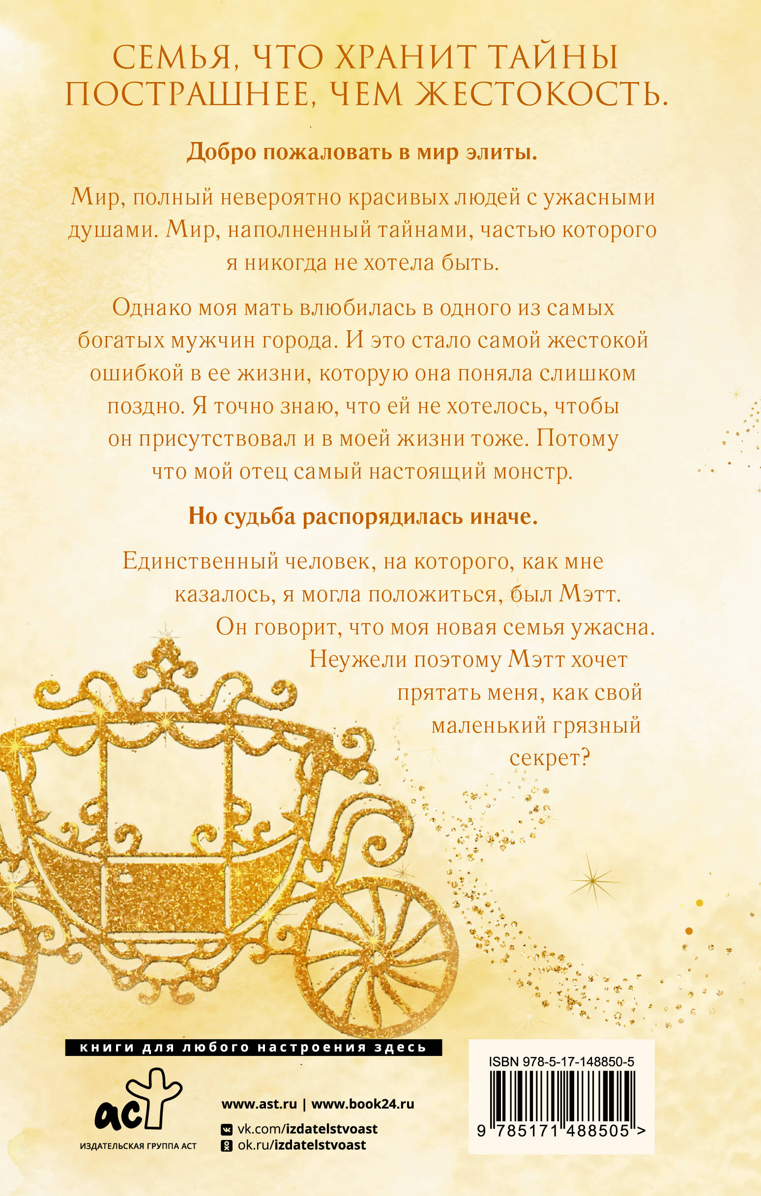 Добро пожаловать в мир элиты. Мир, полный невероятно красивых людей с ужасными душами. Мир, наполненный тайнами, частью которого я никогда не хотела быть. Однако моя мать влюбилась в одного из самых богатых мужчин города. И это стало самой жестокой ошибкой в ее жизни, которую она поняла слишком поздно. Я точно знаю, что ей не хотелось, чтобы он присутствовал и в моей жизни тоже. Потому что мой отец самый настоящий монстр. Но судьба распорядилась иначе. Единственный человек, на которого, как мне казалось, я могла положиться, был Мэтт. Он говорит, что моя новая семья ужасна. Неужели поэтому Мэтт хочет прятать меня, как свой маленький грязный секрет?| Издательство | ИЗДАТЕЛЬСТВО "АСТ" |