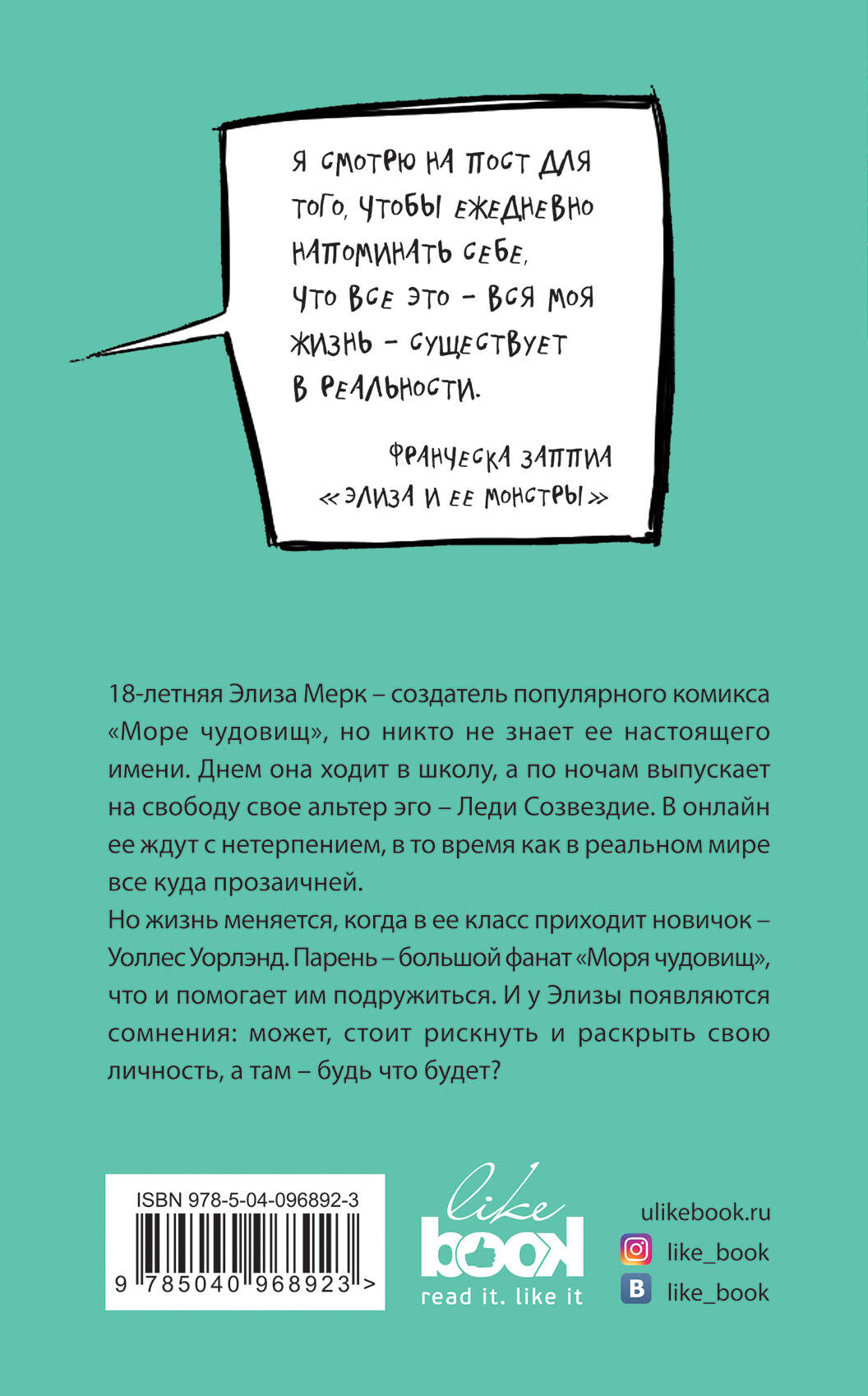18-летняя Элиза Мерк - создатель популярного комикса "Море чудовищ", но никто не знает ее настоящего имени. Днем она ходит в школу, а по ночам выпускает на свободу свое альтер эго - ЛедиСозвездие. В онлайн ее ждут с нетерпением, в то время как в реальном мире все куда прозаичней. Но жизнь меняется, когда в ее класс приходит новичок - Уоллес Уорлэнд. Парень большой фанат "Моря чудовищ", что и помогает им подружиться. И у Элизы появляются сомнения: может, стоит рискнуть и раскрыть свою личность, а там - будь что будет?| Издательство | ООО "Издательство "Эксмо" |