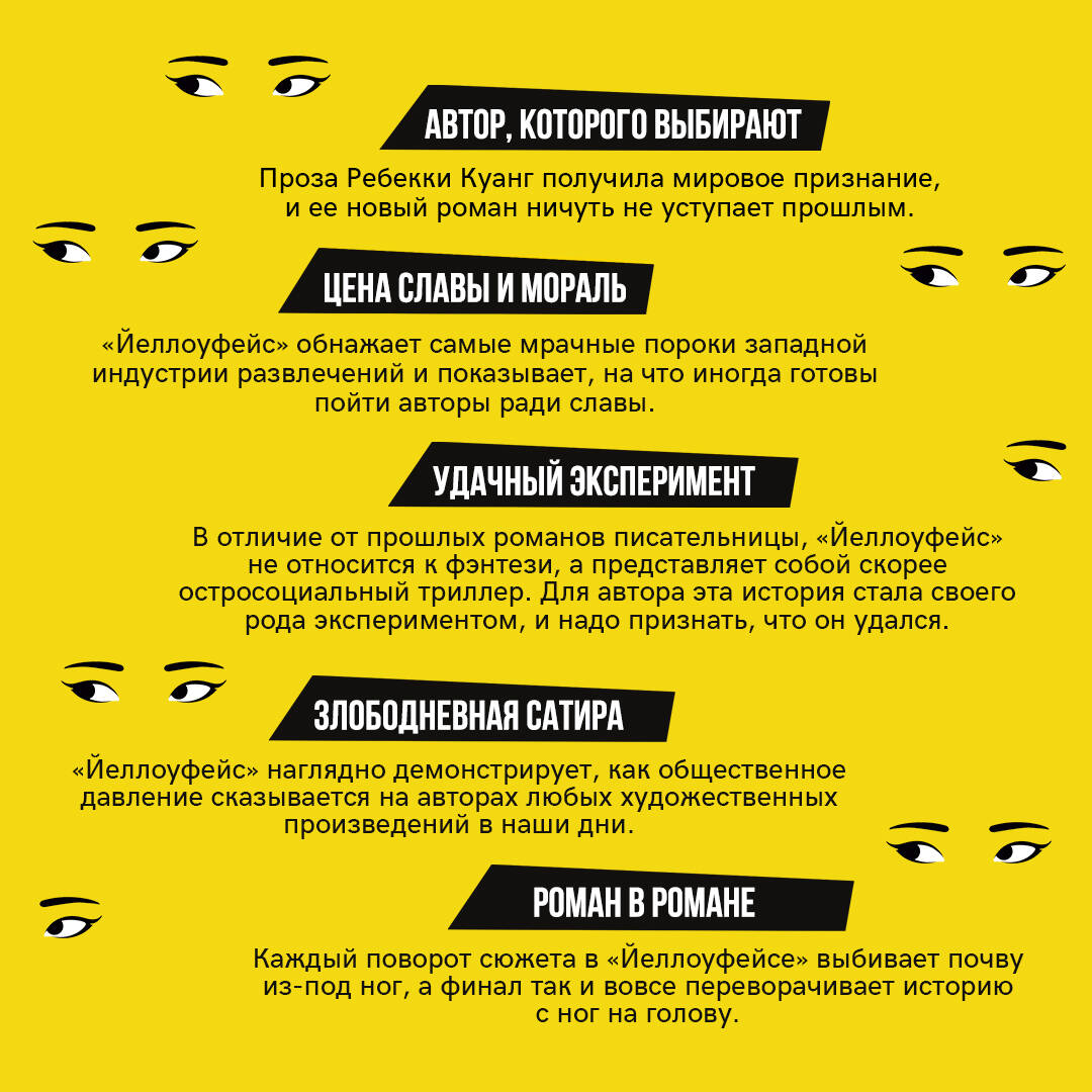 Лауреат Goodreads Choice Awards. Бестселлер № 1 NEW YORK TIMES и AMAZON. Выбор Риз Уизерспун - Reese's Book Club. Писательницы Джун Хэйворд и Афина Лю должны были одновременно стать восходящими звездами. Но Афина - литературная сенсация, а роман Джун не продается. Ведь, кажется, никого в современном мире не интересуют истории о простых белых девушках. Поэтому, когда Джун становится свидетелем гибели Афины в результате несчастного случая, она действует импульсивно: крадет неоконченный роман коллеги о неизвестном подвиге китайских рабочих на фронтах Первой мировой войны. Что с того, что Джун отредактирует черновик Афины и отправит его литагенту как собственный труд? Что с того, что она позволит своему новому издателю опубликовать его под псевдонимом Джунипер Сонг и поставить на обложку этнически неоднозначную фотографию автора? Когда история заслуживает того, чтобы ее рассказали, совсем не важно, кто будет рассказчиком, не так ли?. По крайней мере, сама Джун считает именно так, а список бестселлеров New York Times это подтверждает. Но девушка не может выйти из тени Афины, а появляющиеся улики и негативная реакция сторонников социальной справедливости грозят ей ОТМЕНОЙ. И теперь Джун предстоит узнать, как далеко она готова зайти, чтобы сохранить тайну и не лишиться всего того, чего она заслуживает по праву. «Это отличное чтение. Криминал, сатира, ужасы, паранойя, вопросы культурной апроприации. Много неприятных моментов в социальных сетях. В общем, просто отличная история. Трудно описать, еще труднее забыть». - Стивен Кинг «Жестокое наслаждение… вызывает привыкание». - New York Times Book Review «Захватывающий, быстро развивающийся роман с качественным содержанием». - NPR «Читая этот роман, я чувствовала себя участником дикой, жестокой психологической схватки на ножах с сумасшедшим клоуном. Безжалостная сатира, которая заставила меня внутренне кричать… ведь это так ужасно и смешно одновременно». - Констанс Ву, «Безумно богатые азиаты» «Блестящая сатира, провоцирующая на размышления, захватывающая и бьющая по больному. Обязательная к прочтению история о границе между репрезентацией и эксплуатацией и о тех, кто готов переступить ее ради славы. Каждый, кто так или иначе причастен к издательскому бизнесу, должны прочесть эту книгу и посмотреть на себя в зеркало». - Вайшнави Патель, автор романа «Kaikeyi» «Блестящая сатира, сочетающая ужас и юмор, тонкое исследование расы, наследия, идентичности и разнообразия в книгоиздательском деле, а также честный взгляд на ад, которым являются социальные сети». - Boston Globe «Это захватывающее, шокирующее, убедительное, нелепое и чрезвычайно веселое чтение». - Paste Magazine «Этот роман - хлесткое, язвительное чтение, которое затронуло меня до глубины души. Куанг постоянно находит новые способы разоблачения систем власти, в данном случае рассматриваются вопросы коммодификации и потребления искусства с размахом и утонченностью. "Йеллоуфейс" действительно та еще стерва». - Оливи Блейк, автор романа «Шестерка Атласа» «Превосходная сатира… Эту книгу нельзя пропустить». - Publishers Weekly «Эта тревожная и захватывающая книга затрагивает острые вопросы культурной апроприации и расовой идентичности». - Library Journal «В книге много интересного (часто с иронией) о превратностях издательского дела и эгоизме писателя. Я узнала много нового о собственной белой привилегии. Н