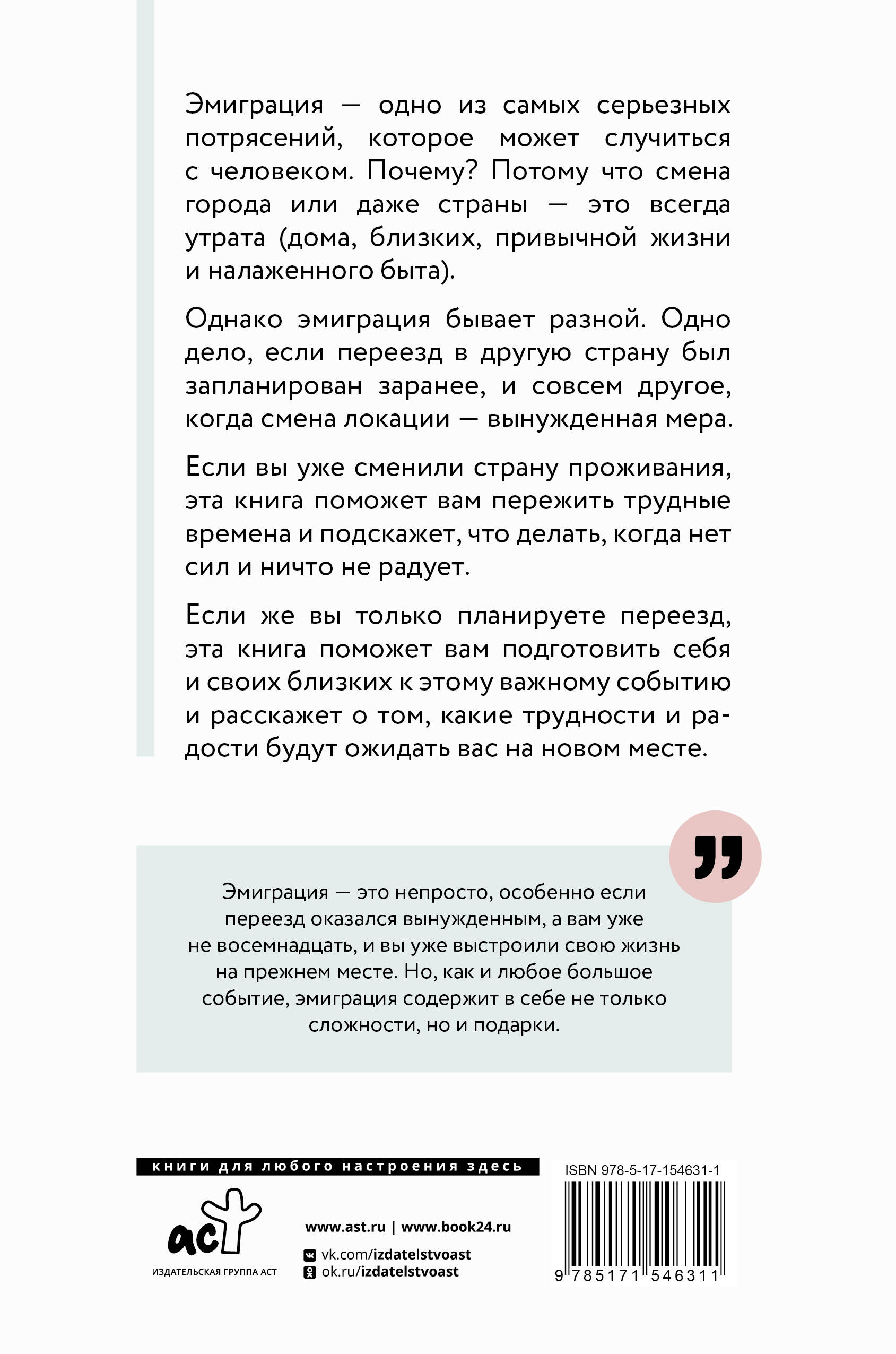 Эмиграция - одно из самых серьезных потрясений, которое может случиться с человеком. Почему? Потому что смена города или даже страны - это всегда утрата (дома, близких, привычной жизни и налаженного быта). Однако эмиграция бывает разной. Одно дело, если переезд в другую страну был запланирован заранее, и совсем другое, когда смена локации - вынужденная мера. Если вы уже сменили страну проживания, эта книга поможет вам пережить трудные времена и подскажет, что делать, когда нет сил и ничто не радует. Если же вы только планируете переезд, эта книга поможет вам подготовить себя и своих близких к этому важному событию и расскажет о том, какие трудности и радости будут ожидать вас на новом месте.| Издательство | ИЗДАТЕЛЬСТВО "АСТ" |