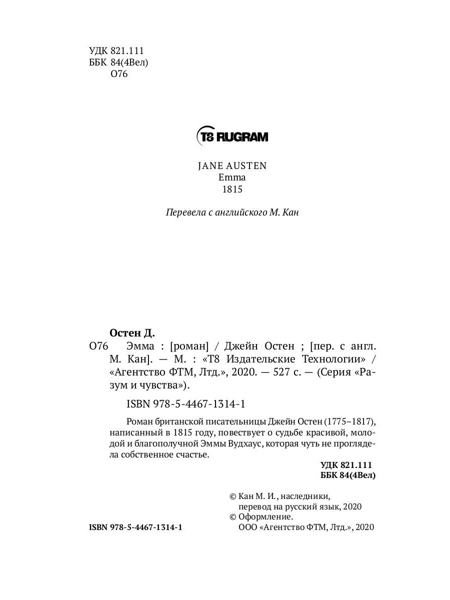 Роман британской писательницы Джейн Остен (1775-1817), написанный в 1815 году, повествует о судьбе красивой, молодой и благополучной Эммы Вудхаус, которая чуть не проглядела собственное счастье.| Издательство | Т8 RUGRAM |