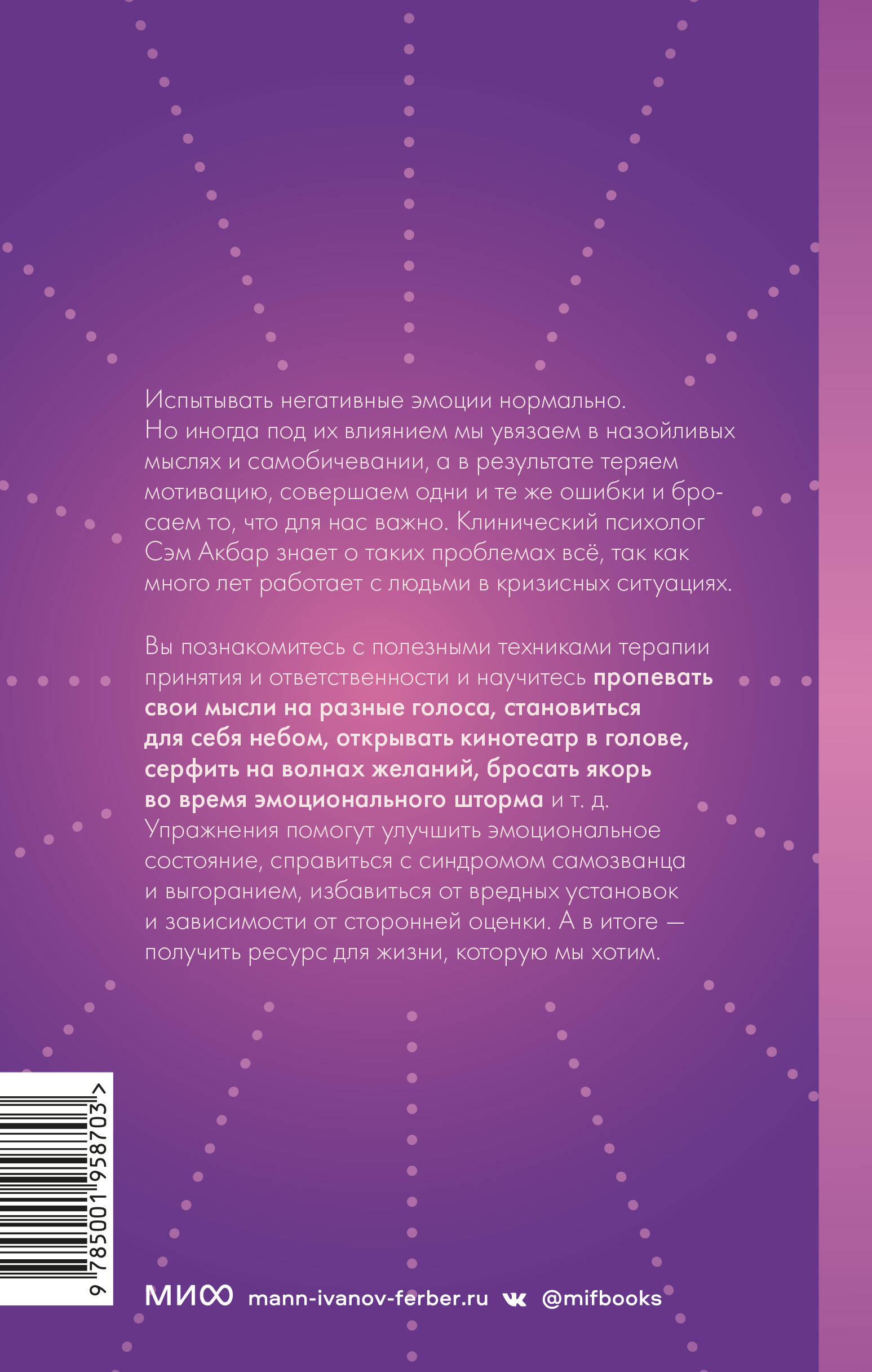 Под обложкой - практические инструменты для эмоционального выздоровления от клинического психолога с 10-летним опытом. Они помогут справиться с напряжением, болезненными чувствами, неприятными воспоминаниями и, как следствие, улучшить качество жизни. Испытывать негативные эмоции нормально. Но иногда под их влиянием мы увязаем в назойливых мыслях и самобичевании, а в результате теряем мотивацию, совершаем одни и те же ошибки и бросаем то, что для нас важно. Клинический психолог Сэм Акбар знает о таких проблемах всё, так как много лет работает с людьми в кризисных ситуациях. Вы познакомитесь с полезными техниками терапии принятия и ответственности и научитесь пропевать свои мысли на разные голоса, становиться для себя небом, открывать кинотеатр в голове, серфить на волнах желаний, бросать якорь во время эмоционального шторма и не только. Упражнения помогут улучшить эмоциональное состояние, справиться с синдромом самозванца и выгоранием, избавиться от вредных установок и зависимости от сторонней оценки. А в итоге - получить ресурс для жизни, которую мы хотим. Для кого эта книга: Для тех, кто испытывает эмоциональные перегрузки и внутреннее напряжение. Для всех, кто переживает сложный жизненный период и стремится окрепнуть, обрести устойчивость и опору.| Издательство | МАНН, ИВАНОВ И ФЕРБЕР ООО |