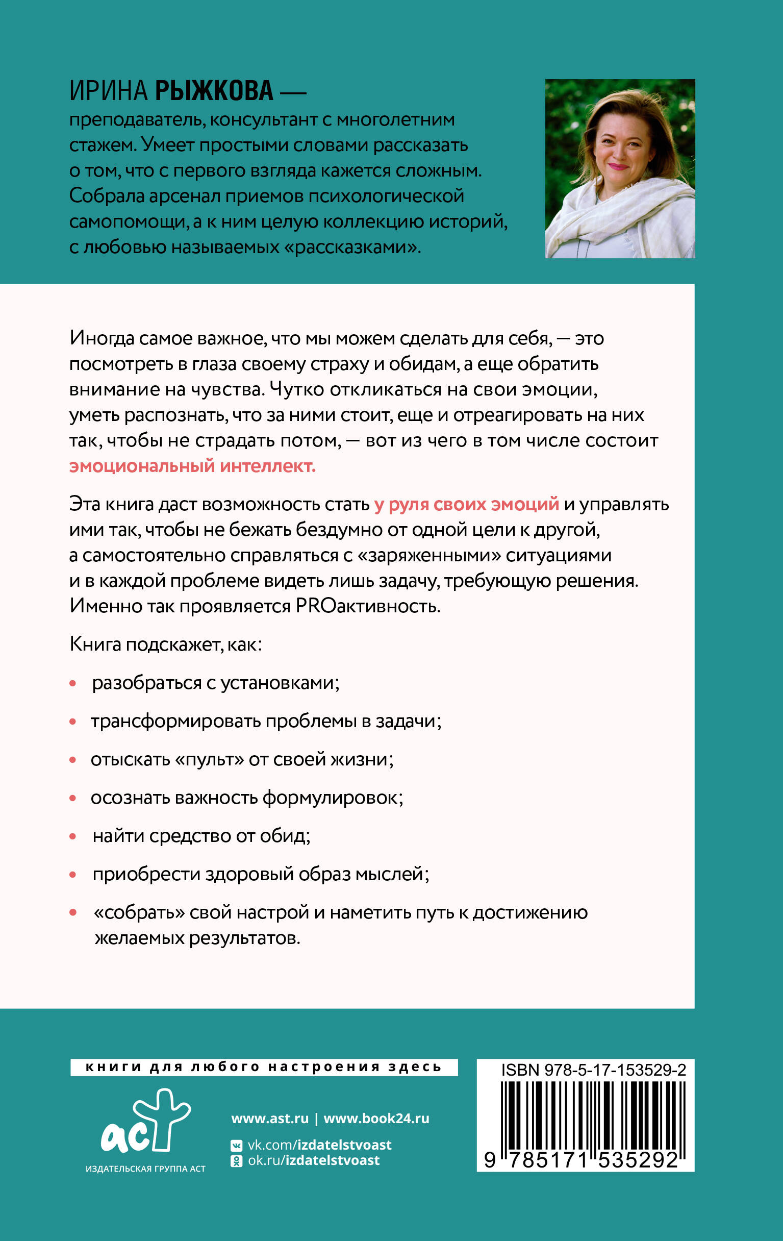 Ирина Рыжкова - преподаватель, консультант с многолетним стажем. Собрала арсенал приемов психологической самопомощи, а к ним целую коллекцию историй, с любовью называемых "рассказками". Иногда самое важное, что мы можем сделать для себя, - это посмотреть в глаза своему страху и обидам, а еще обратить внимание на чувства. Чутко откликаться на свои эмоции, уметь распознать, что за ними стоит, еще и отреагировать на них так, чтобы не страдать потом, - вот из чего в том числе состоит эмоциональный интеллект. Книга "Эмоциональный интеллект: кто рулит твоими эмоциями" даст возможность стать у руля своих эмоций и управлять ими так, чтобы не бежать бездумно от одной цели к другой, а самостоятельно справляться с "заряженными" ситуациями и в каждой проблеме видеть лишь задачу, требующую решения. Именно так проявляется PROактивность. Книга подскажет, как: • разобраться с установками; • трансформировать проблемы в задачи; • отыскать "пульт" от своей жизни; • осознать важность формулировок; • найти средство от обид; • приобрести здоровый образ мыслей; • "собрать" свой настрой и наметить путь к достижению желаемых результатов.