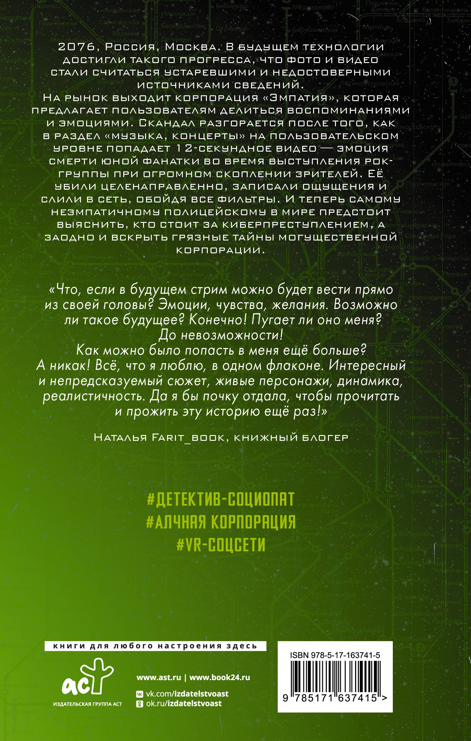 - Киберпанк-антиутопия о соцсетях будущего. - Триллер, пугающий своей реалистичностью. Высокотехнологичные корпорации создали новые способы проникнуть в разум людей, и теперь пользователи добровольно делятся своими настоящими воспоминаниями и эмоциями. - Автор - талантливая сценаристка, режиссер и продюсер, создавшая фильмы «Эквадор», «Нормальная такая жизнь» и «Я не договорил». Победительница конкурсов «Новый взгляд», «Potential», «Screenlife Project» и других. - Для поклонников романа «Глубина» и других киберпанк-миров Сергея Лукьяненко.| Издательство | Издательство "АСТ" |