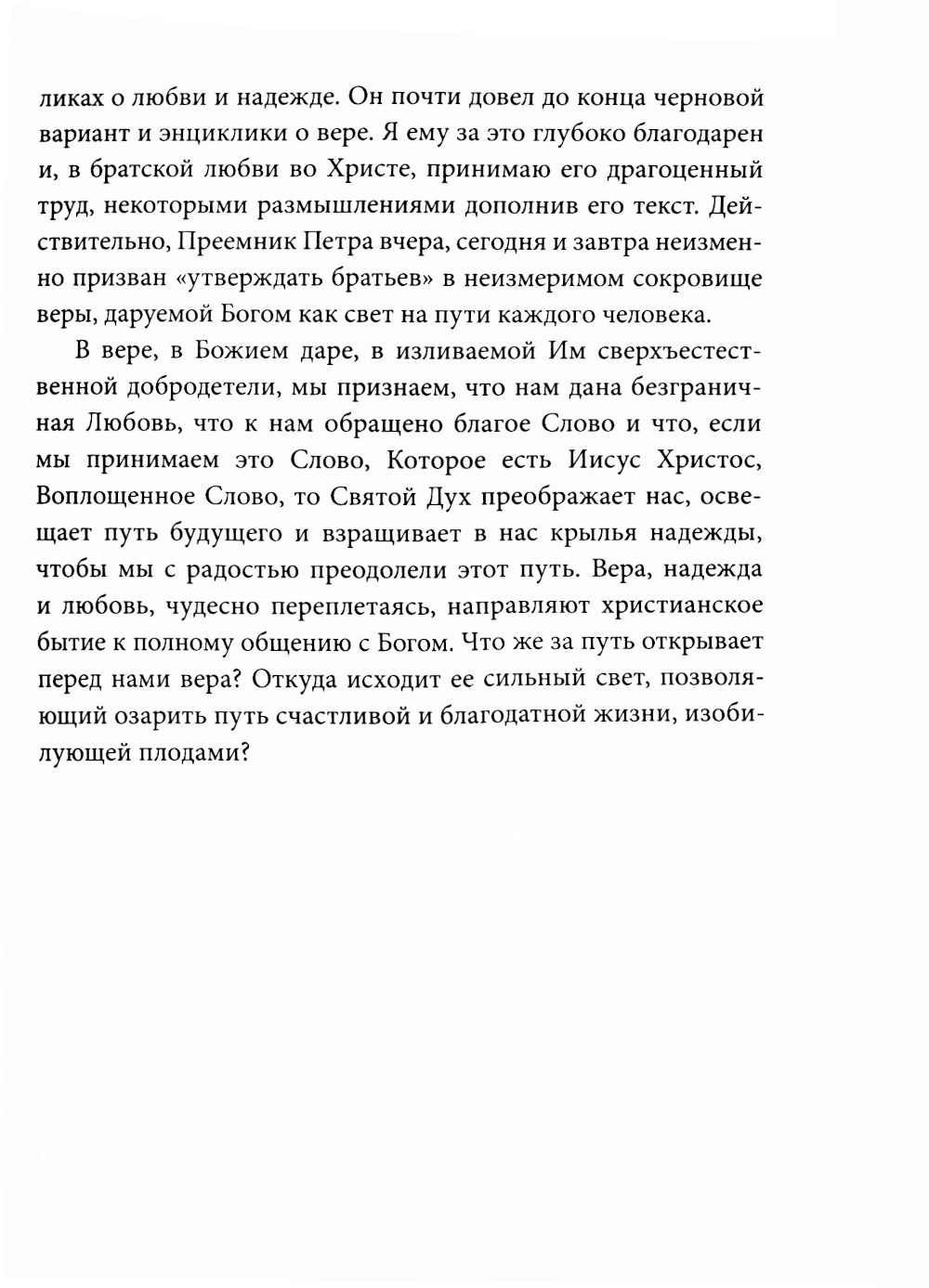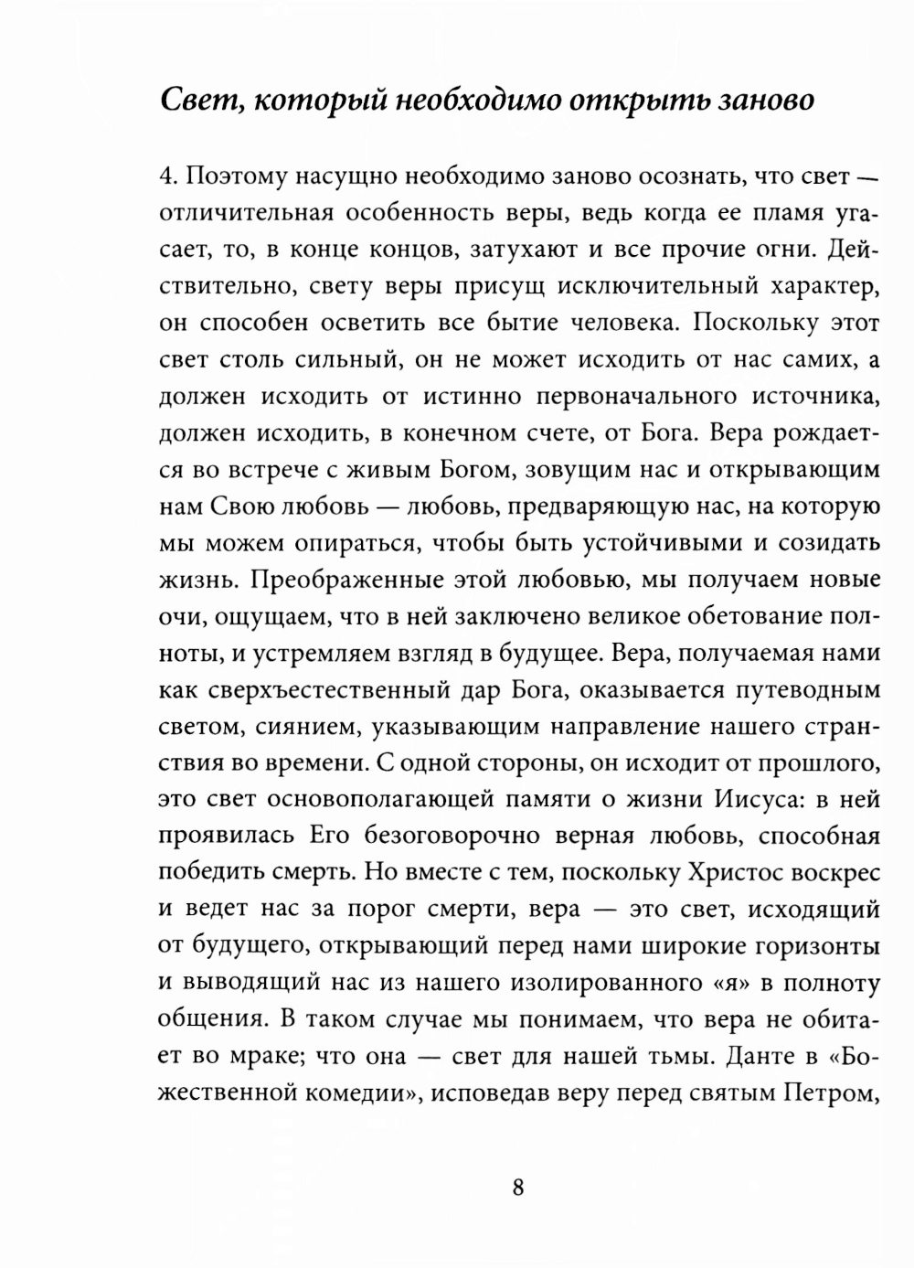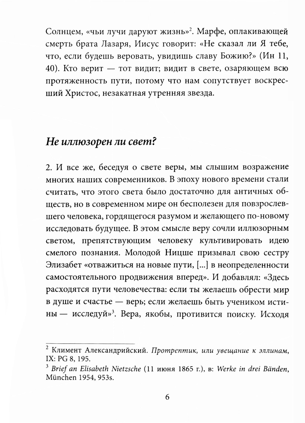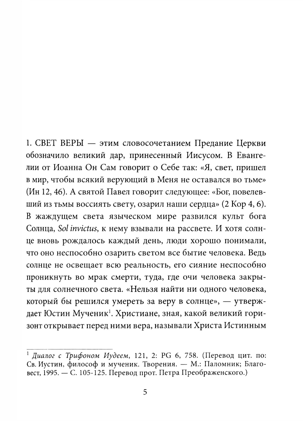 Свет веры - этим словосочетанием Предание Церкви обозначило великий дар, принесенный Иисусом. В Евангелии от Иоанна Он Сам говорит о Себе так: «Я, свет, пришел в мир, чтобы всякий верующий в Меня не оставался во тьме» (Ин 12, 46). А святой Павел говорит следующее: «Бог, повелевший из тьмы воссиять свету, озарил наши сердца» (2 Кор 4, 6). В жаждущем света языческом мире развился культ бога Солнца, Sol invictus, к нему взывали на рассвете. И хотя солнце вновь рождалось каждый день, люди хорошо понимали, что оно неспособно озарить светом все бытие человека. Ведь солнце не освещает всю реальность, его сияние неспособно проникнуть во мрак смерти, туда, где очи человека закрыты для солнечного света. «Нельзя найти ни одного человека, который бы решился умереть за веру в солнце», - утверждает Юстин Мученик.