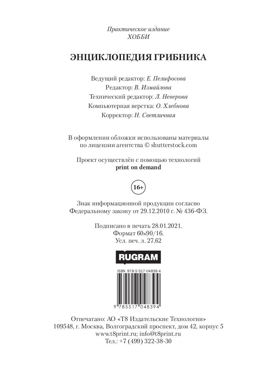 «Энциклопедия грибника» представляет собой уникальное издание, содержащее массу интереснейших сведений о самых разнообразных грибах, в том числе и о мало известных. Вы найдете в этой книге не только описание грибов, но и оригинальные рецепты блюд, узнаете много нового о способах переработки и хранения этих даров природы. Но самое главное, благодаря энциклопедии вы сможете самостоятельно выращивать грибы. Книга рассчитана на широкий круг читателей.| Издательство | Т8 RUGRAM |