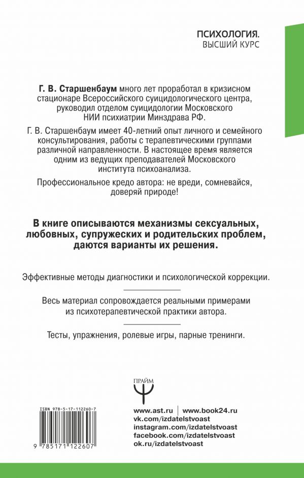 Известный отечественный психотерапевт Г.В. Старшенбаум обобщает свою многолетнюю работу с интимно-личными и семейными проблемами клиентов. В книге рассматриваются и решаются сексуальные, любовные, супружеские и родительские проблемы, а также проблемное поведение как у взрослых членов семьи, так и у детей. Интимные вопросы разбираются в подробностях, но без сложных медицинских терминов, простым и ясным языком. Детальные описания случаев, тесты и упражнения помогут читателю вместе с партнером сделать семейную жизнь счастливой. Книга адресована широкому кругу читателей и особенно полезна будет психологам, психотерапевтам, сексологам и педагогам.