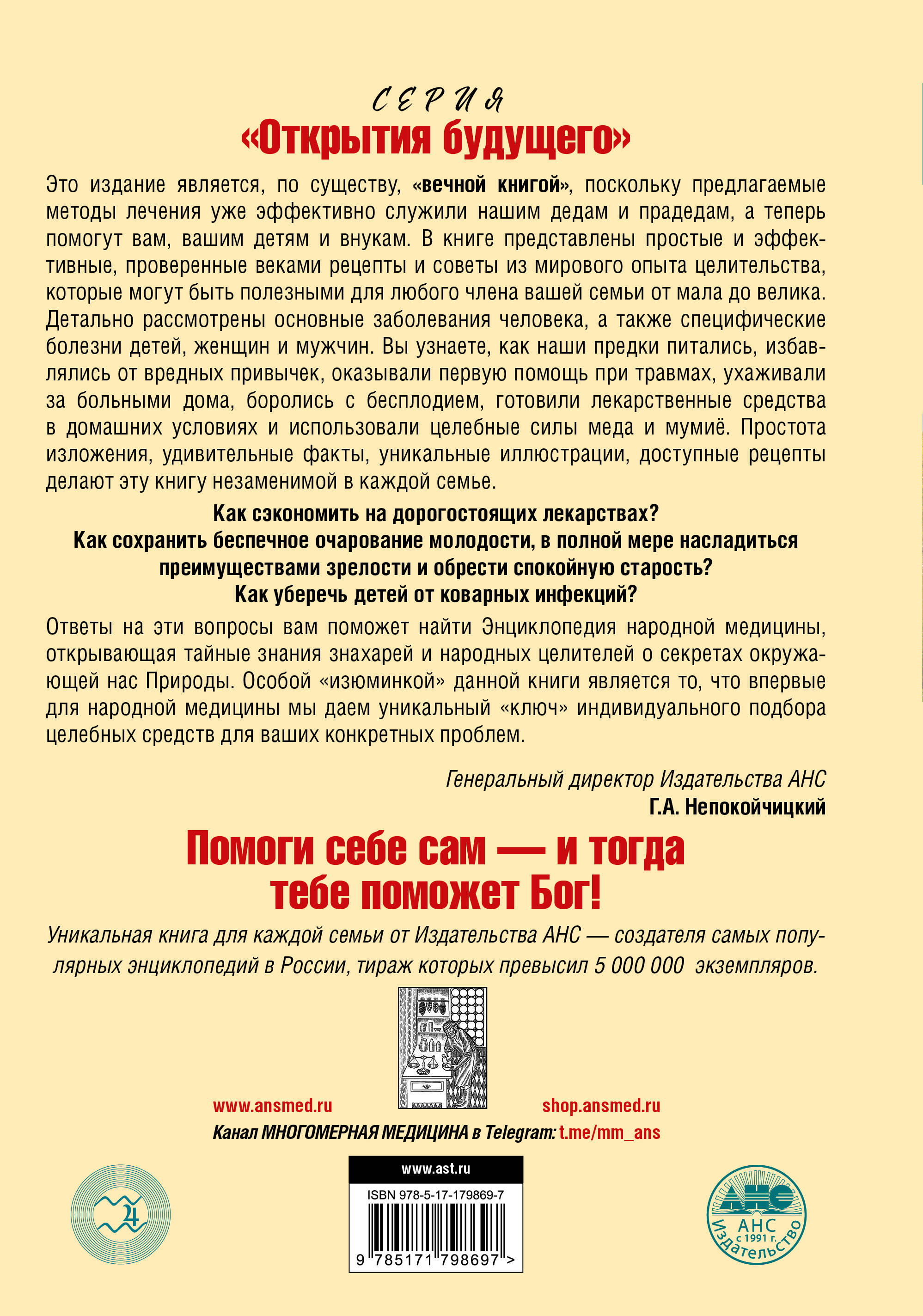 Это издание является, по существу, "вечной книгой", поскольку предлагаемые методы лечения уже эффективно служили нашим дедам и прадедам, а теперь помогут вам, вашим детям и внукам. Это сокращенная версия самой популярной в России Энциклопедии Народной Медицины, тираж которой превысил 3 миллиона экземпляров. В отличие от прошлых изданий в данной книге впервые дан уникальный "ключ" для индивидуального подбора целебных средств для ваших конкретных проблем. В основе данного подхода лежит уникальная методика самопознания, самодиагностики и самоисцеления - Многомерная медицина, разработанная физиком, кандидатом технических наук Л. Г. Пучко. В книге представлены простые и эффективные, проверенные веками рецепты и советы из мирового опыта целительства, которые могут быть полезными для любого члена вашей семьи от мала до велика. Детально рассмотрены основные заболевания человека, а также специфические болезни детей, женщин и мужчин. Вы узнаете, как наши предки питались, избавлялись от вредных привычек, оказывали первую помощь при травмах, ухаживали за больными дома, боролись с бесплодием, готовили лекарственные средства в домашних условиях и использовали целебные силы меда и мумиё. Вся народная медицина испокон веков была самым тесным образом связана с религиозными традициями народов России, поэтому в книге представлены наиболее популярные в народе молитвы для исцеления больных и страждущих. Естественно, не забыты и знахарские способы лечения, заговоры, заклинания. В книге представлены рецепты и советы на базе более 250 лекарственных растений и приведены прекрасные цветные иллюстрации 128 из них. Простота изложения, удивительные факты, доступные рецепты, способы их приготовления и использования делают эту книгу незаменимой в каждой семье.| Издательство | Издательство "АСТ" |