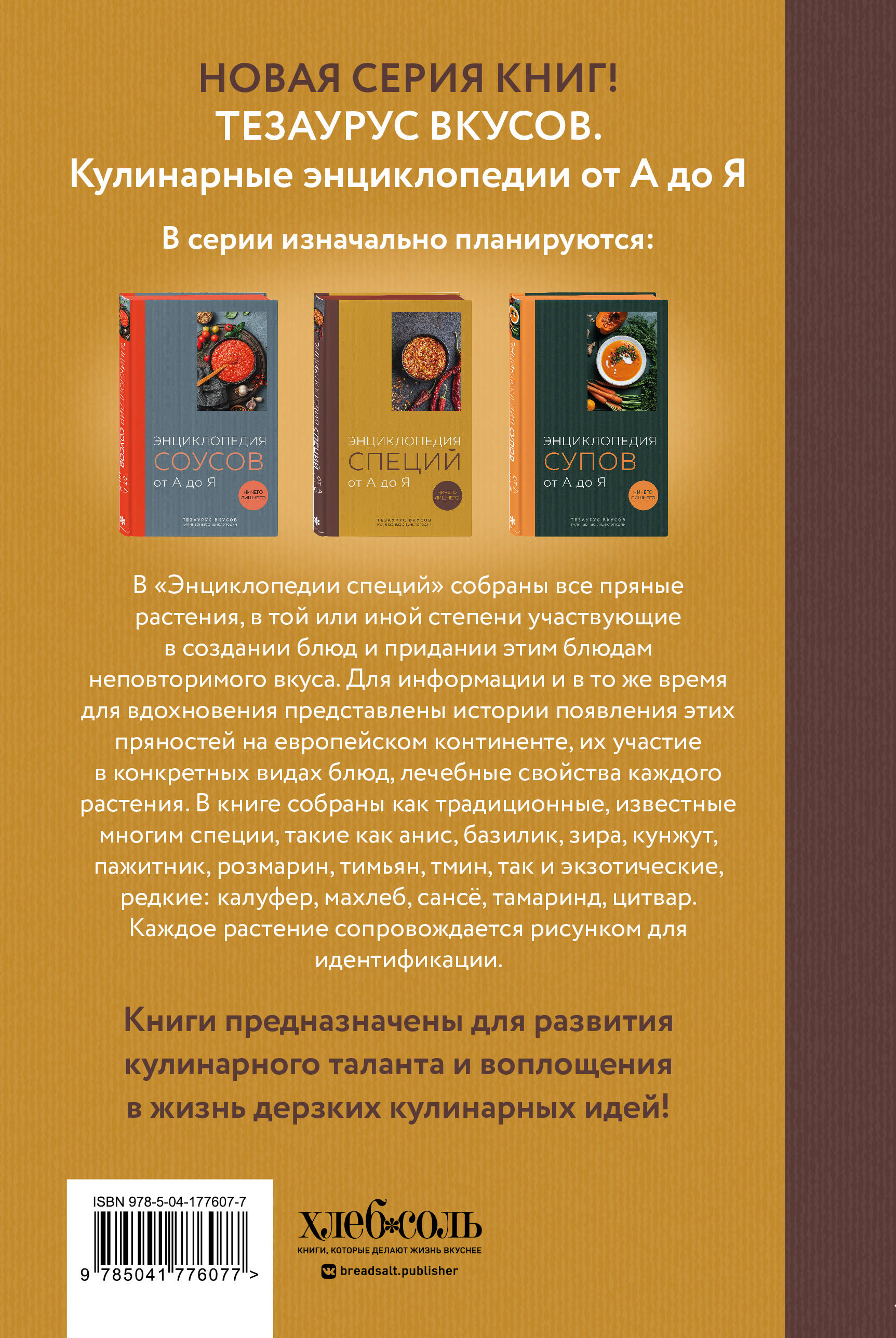 Новая серия книг! «Тезаурус вкусов. Кулинарные энциклопедии от А до Я». В серии изначально планируются: - «Энциклопедия специй». - «Энциклопедия соусов». - «Энциклопедия супов». В «Энциклопедии специй» собраны все пряные растения, в той или иной степени участвующие в создании блюд и придании этим блюдам неповторимого вкуса. Для информации и в то же время для вдохновения представлены истории появления этих пряностей на европейском континенте, их участие в конкретных видах блюд, лечебные свойства каждого растения. В книге собраны как традиционные, известные многим специи, такие как анис, базилик, зира, кунжут, пажитник, розмарин, тимьян, тмин, так и экзотические редкие: калуфер, махлеб, сансё, тамаринд, цитвар. Каждое растение сопровождается рисунком для идентификации. Книги предназначены для развития кулинарного таланта и воплощения в жизнь дерзких кулинарных идей!