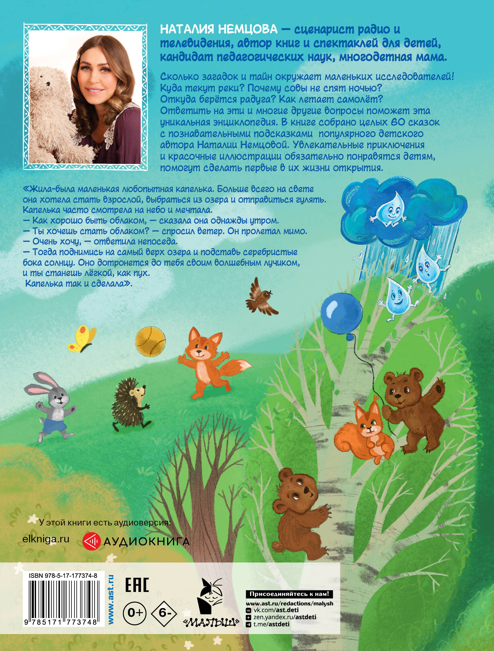 Как просто и интересно рассказать малышу о мире вокруг нас? Как найти ответы на многочисленные "почему" маленьких непосед? Энциклопедия, в которую вошли целых 60 познавательных сказок, - первая помощь родителям и воспитателям. В книге собраны простые и увлекательные истории по самым важным и интересным темам: животные и растения, природные явления, здоровье, правила безопасного поведения, даже полезные изобретения и алфавит. Автор Наталия Немцова, популярный детский писатель, сценарист, многодетная мама, умеет доходчиво и увлекательно объяснить сложное и непонятное, разжечь интерес к знаниям. Познавательные сказки - лучший способ подружить ребенка с книгой, весело и легко развить мышление, память, речь, воображение. Книгу можно использовать как для первоклассников, так и при подготовке к школе. Красочные и эмоциональные иллюстрации Анастасии Зининой превращают занятия по этой необычной энциклопедии в настоящий праздник. Издание станет отличным подарком для вашего сына или дочки и самым любимым первым учебником. У книги есть аудиоверсия.| Издательство | Издательство "АСТ" |