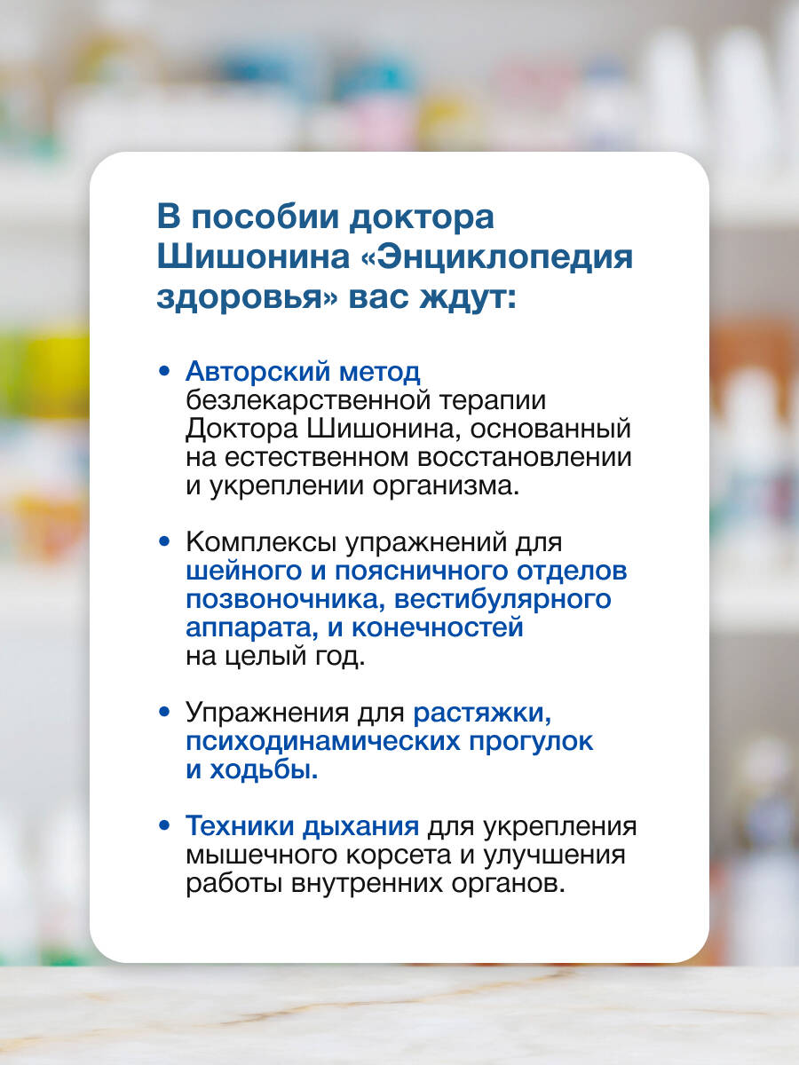 Если вы устали от болей в шее, спине и суставах, не хотите полагаться только на классическую лекарственную терапию, и намерены посвятить будущий год заботе о здоровье, то новая книга кандидата медицинских наук Александра Шишонина «Энциклопедия здоровья» - для вас. Издание познакомит вас с авторским методом безлекарственной терапии Доктора Шишонина, основанном на здоровом питании, лечебной гимнастике, диафрагмальном дыхании, и естественном восстановлении и укреплении организма. В пособии вы найдете комплексы упражнений для шейного и поясничного отделов позвоночника, вестибулярного аппарата, и конечностей. А также упражнения для растяжки и психодинамических прогулок и ходьбы, техники дыхания для укрепления мышечного корсета и улучшения работы внутренних органов. Все упражнения и техники удобно распределены по месяцам, чтобы уделять максимум внимания решению определенных задач. Важно! Книги не являются медицинским пособием. При возникновении проблем со здоровьем необходимо обратиться к врачу.| Издательство | Издательство "АСТ" |