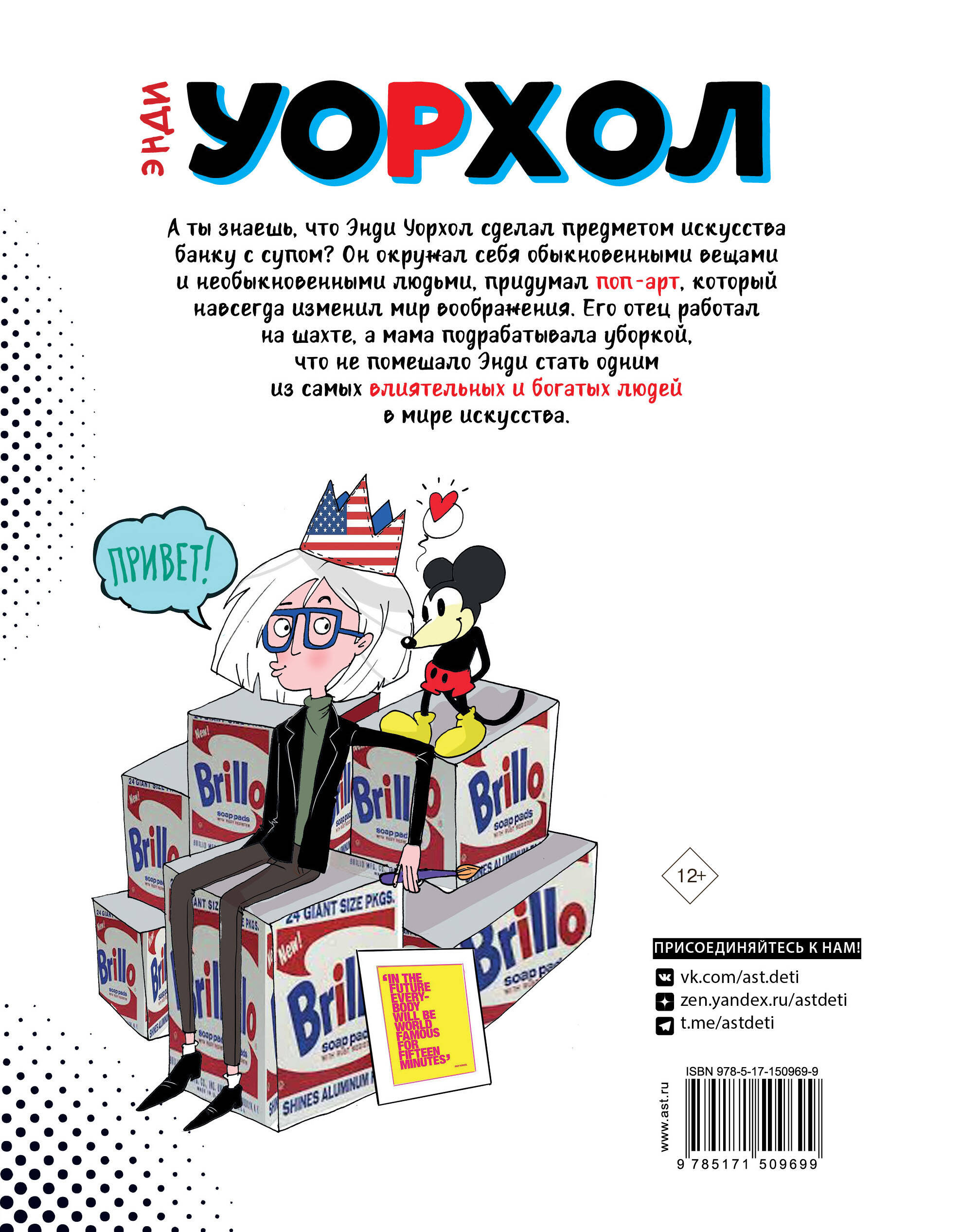 А ты знаешь, что Энди Уорхол сделал предметом искусства банку с супом? Он окружал себя обыкновенными вещами и необыкновенными людьми, придумал поп-арт, который навсегда изменил мир воображения. Его отец работал на шахте, а мама подрабатывала уборкой, что не помешало Энди стать одним из самых влиятельных и богатых людей в мире искусства.| Издательство | ИЗДАТЕЛЬСТВО "АСТ" |