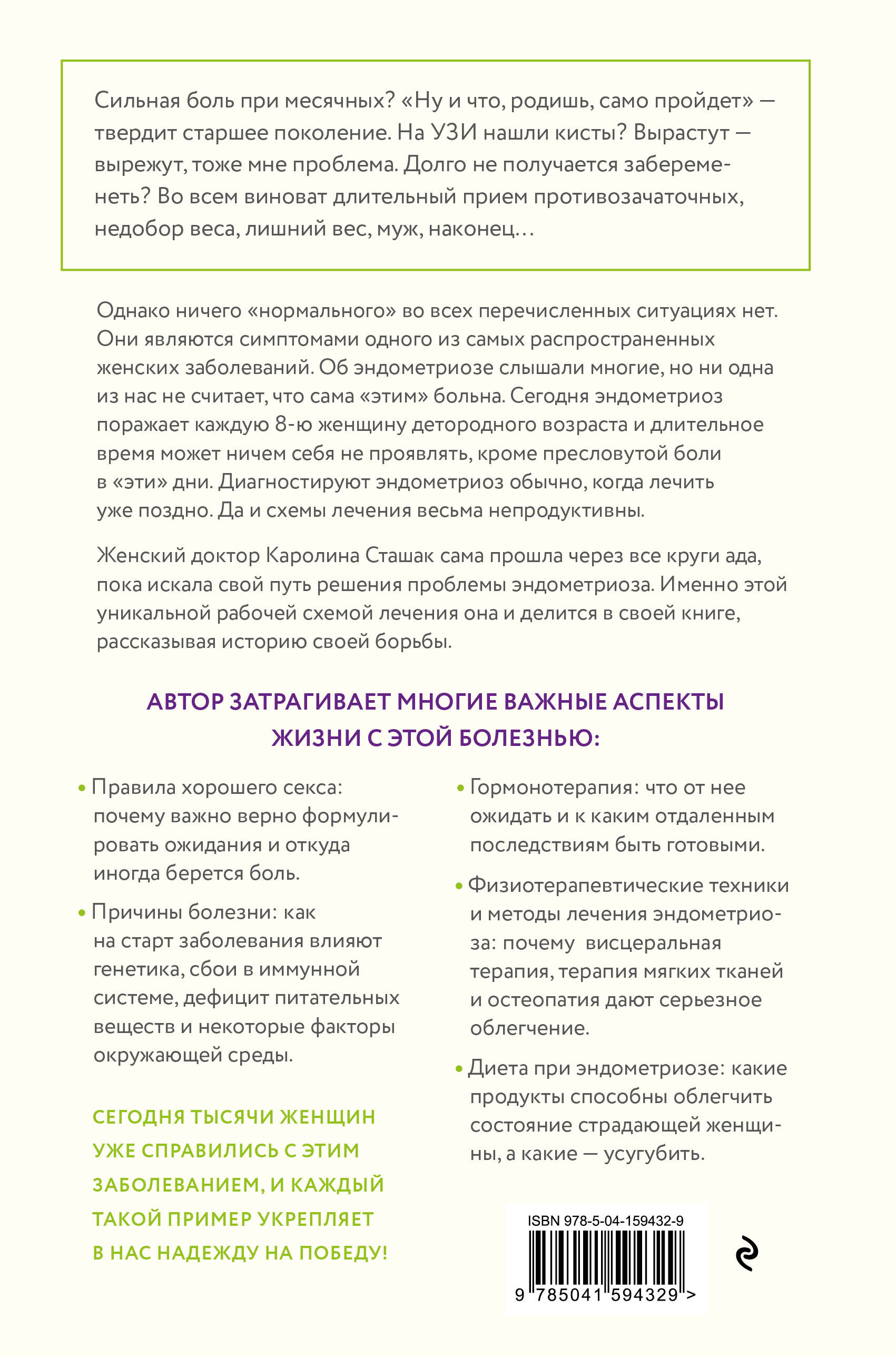 Сильная боль во время каждой менструации, неспособность забеременеть в течение длительного времени, невероятно обильные кровотечения в критические дни - все это признаки грозного женского заболевания - эндометриоза. Каждая 10-я женщина страдает этим недугом и даже не подозревает о своей болезни. А между тем она портит жизнь, характер и лишает счастья материнства. Известный польский врач, эксперт в области женских болезней Каролина Сташак предлагает полноценный план обследования и лечения эндометриоза. Первый раздел посвящен современным методам диагностики и лечения этого заболевания. Cледующие - таким важным аспектам, как психология, сексология, диетотерапия, физиотерапия. Иными словами, в своей книге автор описал, как справляться с эндометриозом с помощью комплексного подхода.| Издательство | Эксмо |