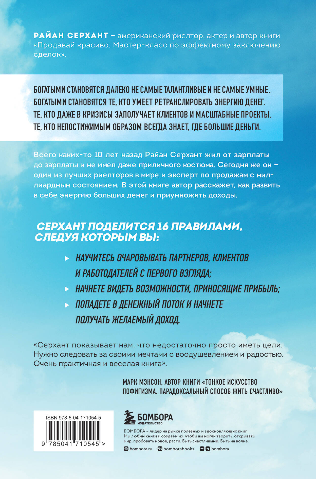 Богатыми становятся далеко не самые талантливые и не самые умные. Богатыми становятся те, кто умеет ретранслировать энергию денег. Те, кто даже в кризисы заполучает клиентов и масштабные проекты. Те, кто непостижимым образом всегда знает, где большие деньги. Всего каких-то 10 лет назад Райан Серхант жил от зарплаты до зарплаты и не имел даже приличного костюма. Сегодня же он - один из лучших риелторов в мире и эксперт по продажам с миллиардным состоянием. В этой книге автор расскажет, как развить в себе энергию больших денег и приумножить доходы. Серхант поделится 16 правилами, следуя которым вы: - научитесь очаровывать партнеров, клиентов и работодателей с первого взгляда; - начнете видеть возможности, приносящие прибыль; - попадете в денежный поток и начнете получать желаемый доход. Райан Серхант - американский риелтор, актер и автор книги «Продавай красиво. Мастер-класс по эффектному заключению сделок».| Издательство | ООО "Издательство "Эксмо" |