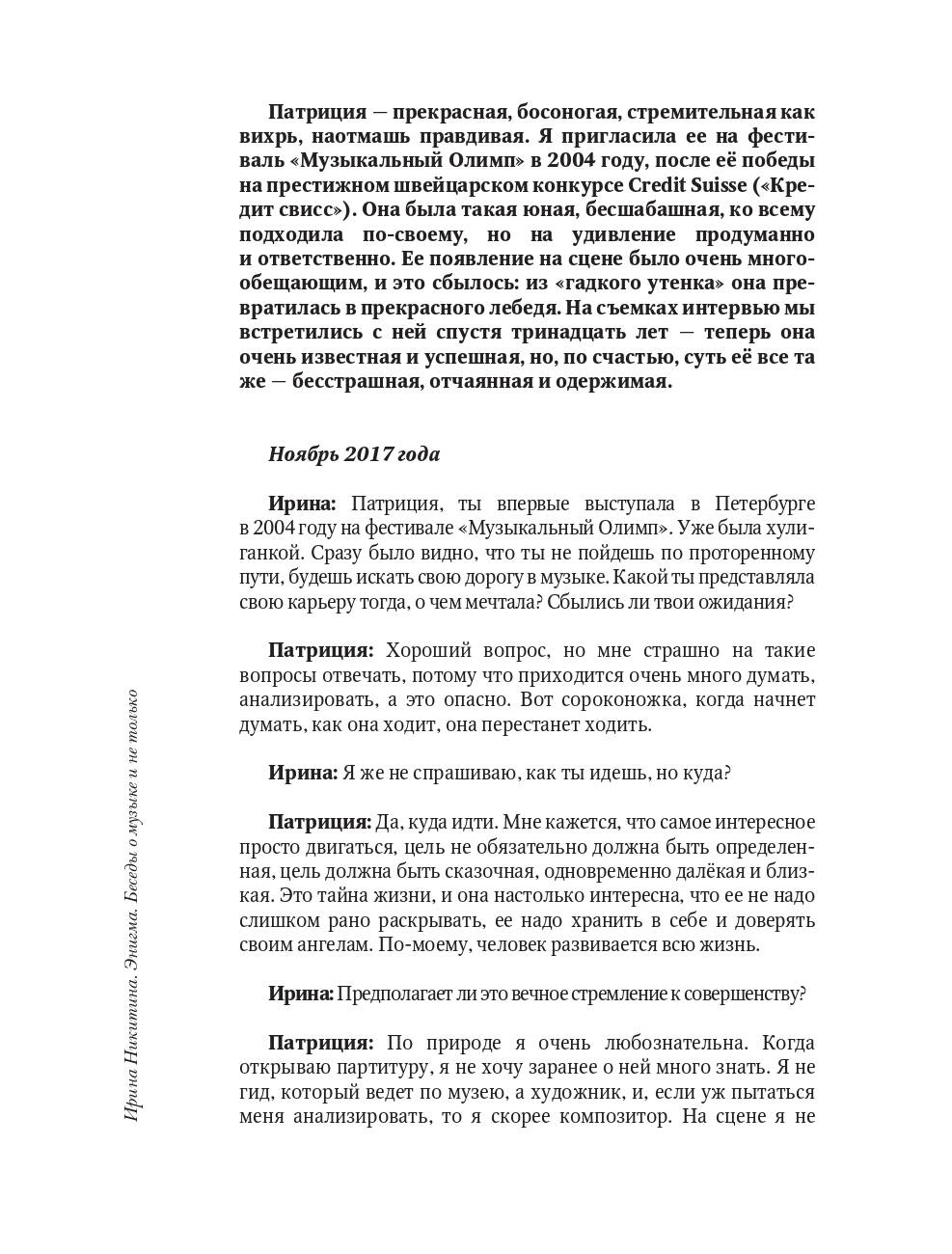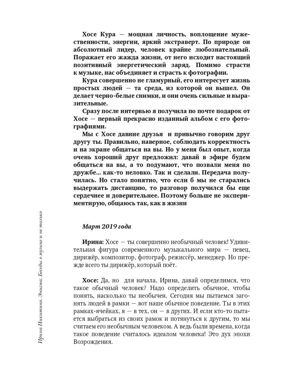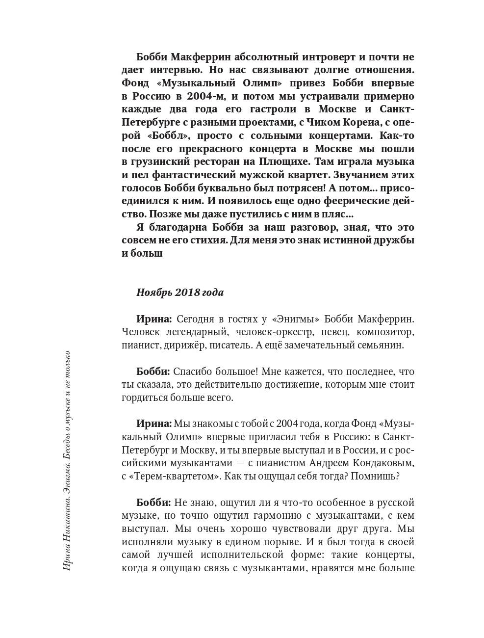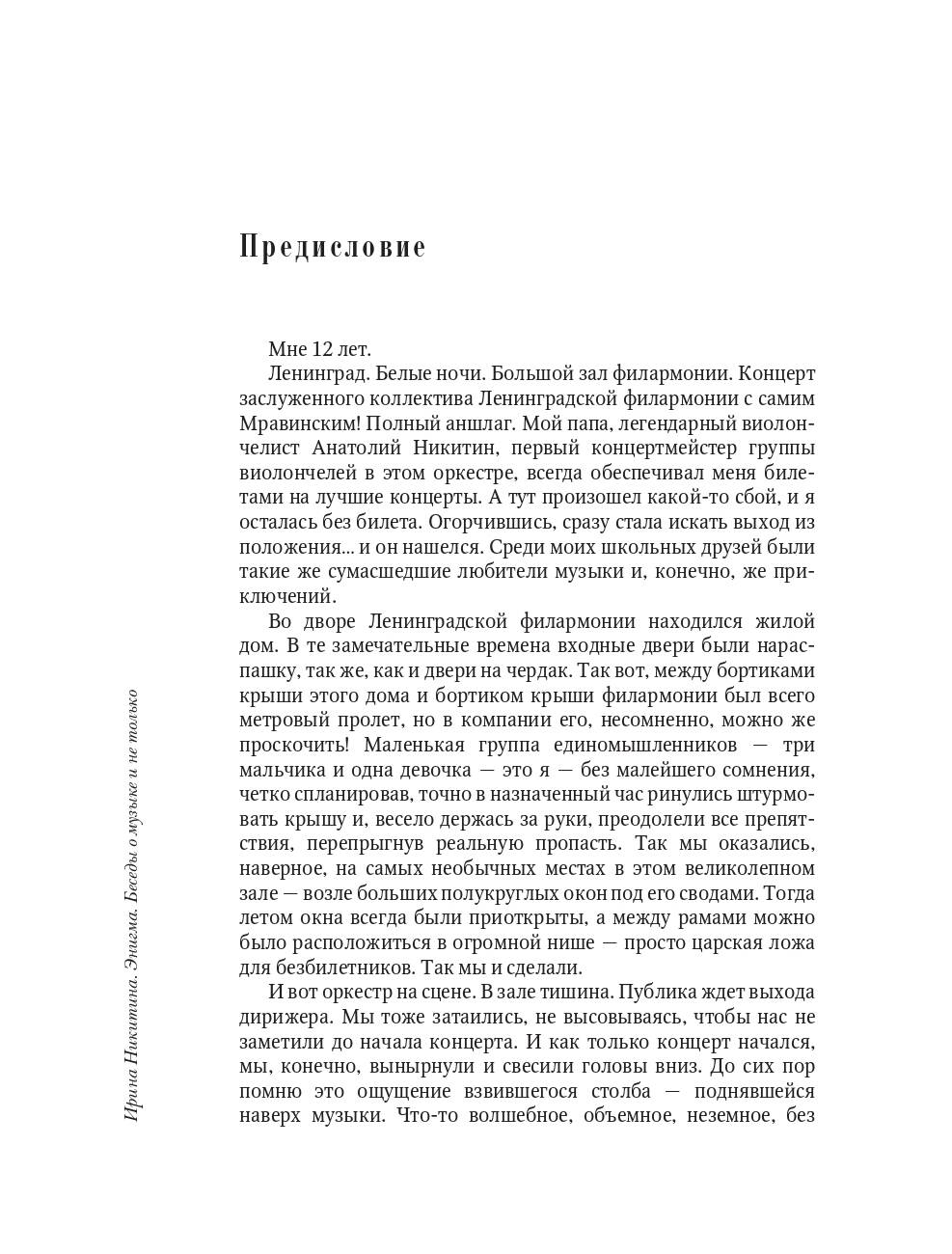 Ирина Никитина - пианистка по образованию, президент Фонда, директор фестиваля «Музыкальный Олимп» и ведущая телепередачи «Энигма». Благодаря книге «Энигма. Беседы с героями современного музыкального мира» вы: • Погрузитесь в будни мировых звезд академической сцены. • Откроете для себя ранее не известные молодые таланты. • Узнаете, как устроена музыкальная индустрия.| Издательство | АСТ |