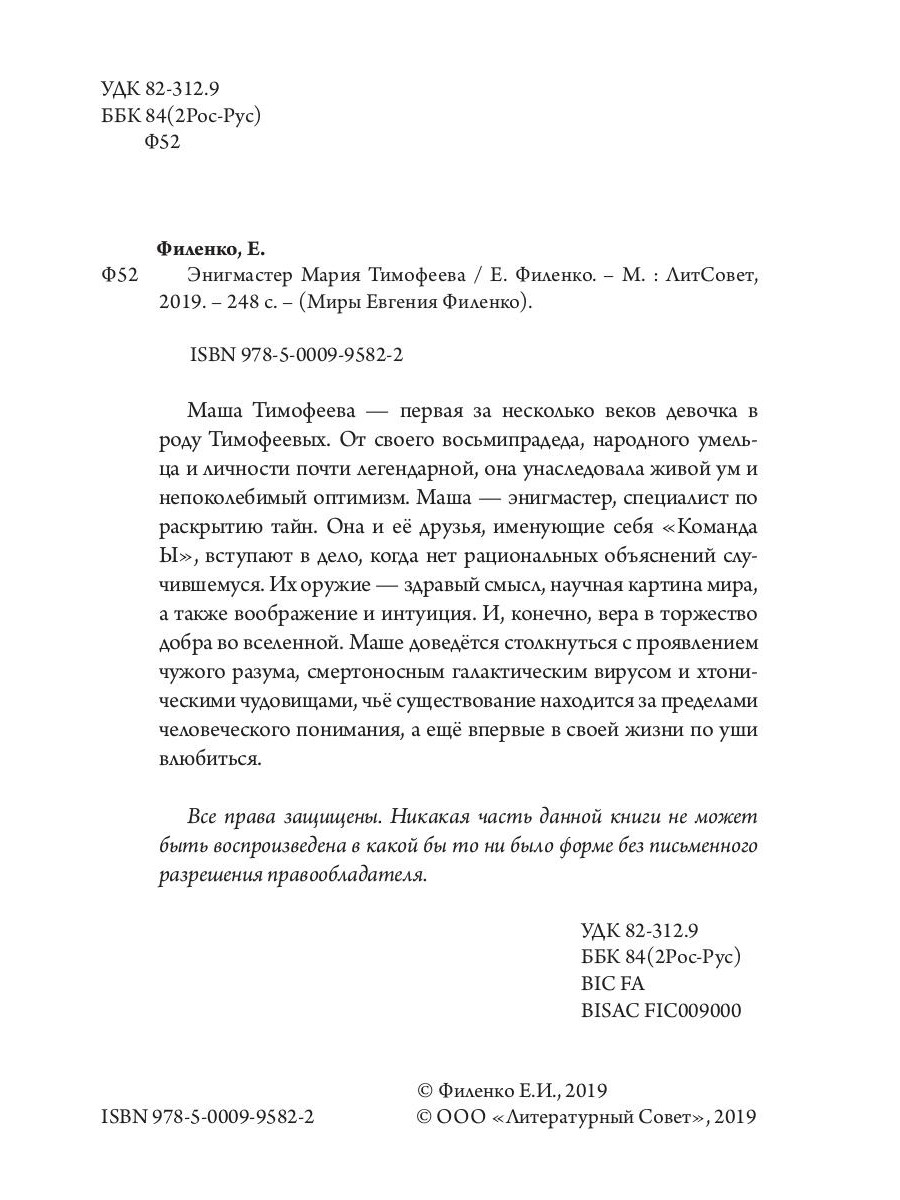 Маша Тимофеева - первая за несколько веков девочка в роду Тимофеевых. От своего восьмипрадеда, народного умельца и личности почти легендарной, она унаследовала живой ум и непоколебимый оптимизм. Маша - энигмастер, специалист по раскрытию тайн. Она и её друзья, именующие себя «Команда Ы», вступают в дело, когда нет рациональных объяснений случившемуся. Их оружие - здравый смысл, научная картина мира, а также воображение и интуиция. И, конечно, вера в торжество добра во вселенной. Маше доведётся столкнуться с проявлением чужого разума, смертоносным галактическим вирусом и хтоническими чудовищами, чьё существование находится за пределами человеческого понимания, а ещё впервые в своей жизни по уши влюбиться.