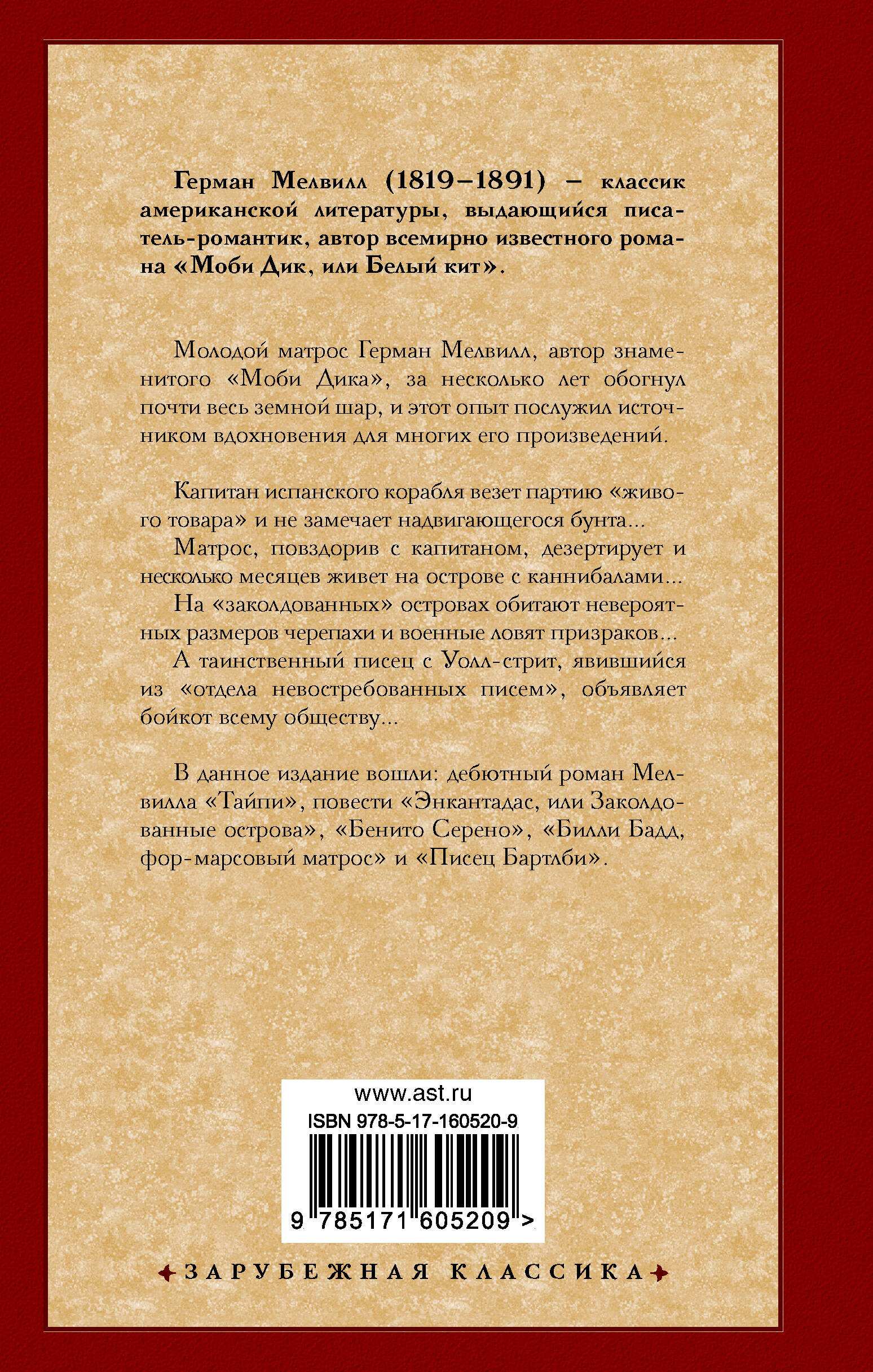 Молодой матрос Герман Мелвилл, автор знаменитого "Моби Дика", за несколько лет обогнул почти весь земной шар, и этот опыт послужил источником вдохновения для многих его произведений. Капитан испанского корабля везет партию "живого товара" и не замечает надвигающегося бунта… Матрос, повздорив с капитаном, дезертирует и несколько месяцев живет на острове с каннибалами… На "заколдованных" островах обитают невероятных размеров черепахи и военные ловят призраков… А таинственный писец с Уолл-стрит, явившийся из "отдела невостребованных писем", объявляет бойкот всему обществу… В данное издание вошли: дебютный роман Мелвилла "Тайпи", повести "Энкантадас, или Заколдованные острова", "Бенито Серено", "Билли Бадд, фор-марсовый матрос" и "Писец Бартлби".| Издательство | Издательство "АСТ" |
