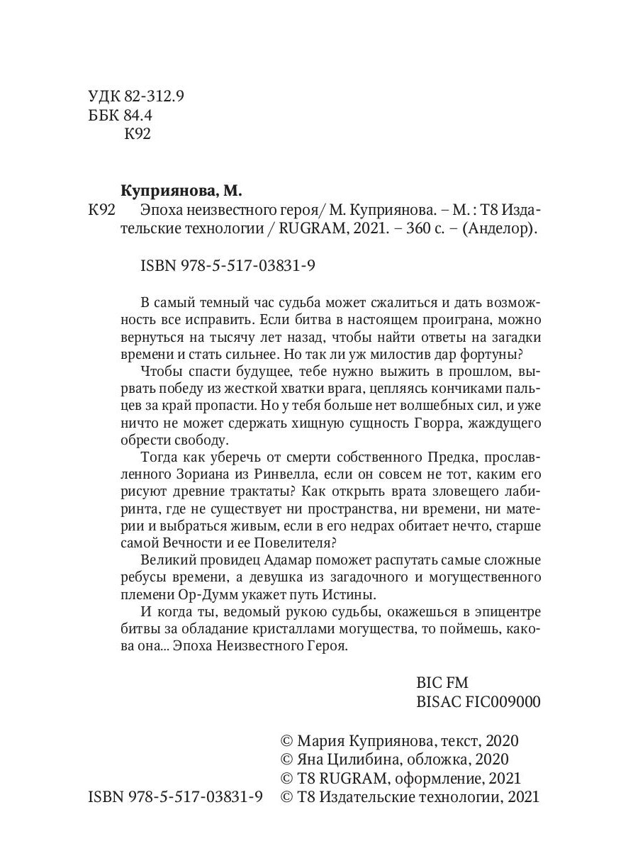 В самый темный час судьба может сжалиться и дать возможность все исправить. Если битва в настоящем проиграна, можно вернуться на тысячу лет назад, чтобы найти ответы на загадки времени и стать сильнее. Но так ли уж милостив дар фортуны? Чтобы спасти будущее, тебе нужно выжить в прошлом, вырвать победу из жесткой хватки врага, цепляясь кончиками пальцев за край пропасти. Но у тебя больше нет волшебных сил, и уже ничто не может сдержать хищную сущность Гворра, жаждущего обрести свободу. Тогда как уберечь от смерти собственного Предка, прославленного Зориана из Ринвелла, если он совсем не тот, каким его рисуют древние трактаты? Как открыть врата зловещего лабиринта, где не существует ни пространства, ни времени, ни материи и выбраться живым, если в его недрах обитает нечто, старше самой Вечности и ее Повелителя? Великий провидец Адамар поможет распутать самые сложные ребусы времени, а девушка из загадочного и могущественного племени Ор-Думм укажет путь Истины. И когда ты, ведомый рукою судьбы, окажешься в эпицентре битвы за обладание кристаллами могущества, то поймешь, какова она… Эпоха Неизвестного Героя.| Издательство | Т8 RUGRAM |