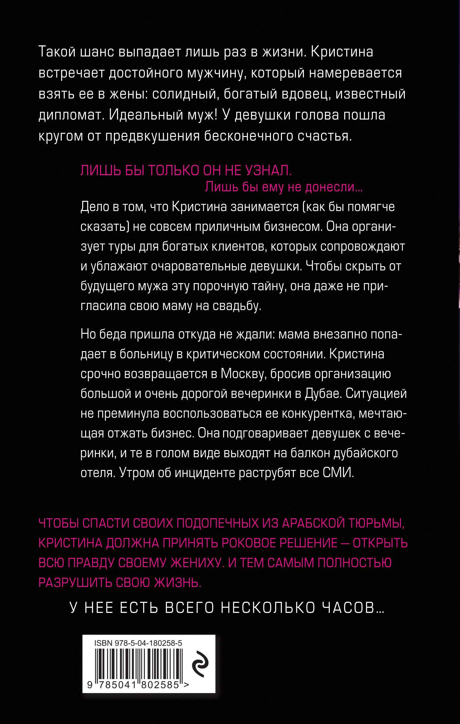 Основано на реальных событиях, произошедших недавно в Дубае. Такой шанс выпадает лишь раз в жизни. Кристина встречает достойного мужчину, который намеревается взять её в жёны: солидный богатый вдовец, известный дипломат. Идеальный муж! У девушки голова пошла кругом от предвкушения бесконечного счастья. Лишь бы только он не узнал. Лишь бы ему не донесли… Дело в том, что Кристина занимается (как бы помягче сказать) не совсем приличным бизнесом. Она организует туры для богатых клиентов, которых сопровождают и ублажают очаровательные девушки. Чтобы скрыть от будущего мужа эту порочную тайну, она даже не пригласила свою маму на свадьбу. Но беда пришла, откуда не ждали: мама внезапно попадает в больницу в критическом состоянии. Кристина срочно возвращается в Москву, бросив организацию большой и очень дорогой вечеринки в Дубае. Ситуацией не преминула воспользоваться ее конкурентка, мечтающая отжать бизнес. Подговаривает девушек с вечеринки, и те в голом виде выходят на балкон дубайского отеля. Утром об инциденте раструбят все СМИ. Чтобы спасти своих подопечных из арабской тюрьмы, Кристина должна принять роковое решение - открыть всю правду своему жениху. И тем самым полностью разрушить свою жизнь. У нее есть всего несколько часов…| Издательство | ООО "Издательство "Эксмо" |