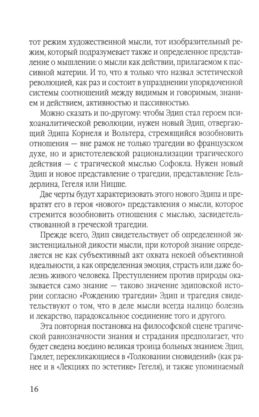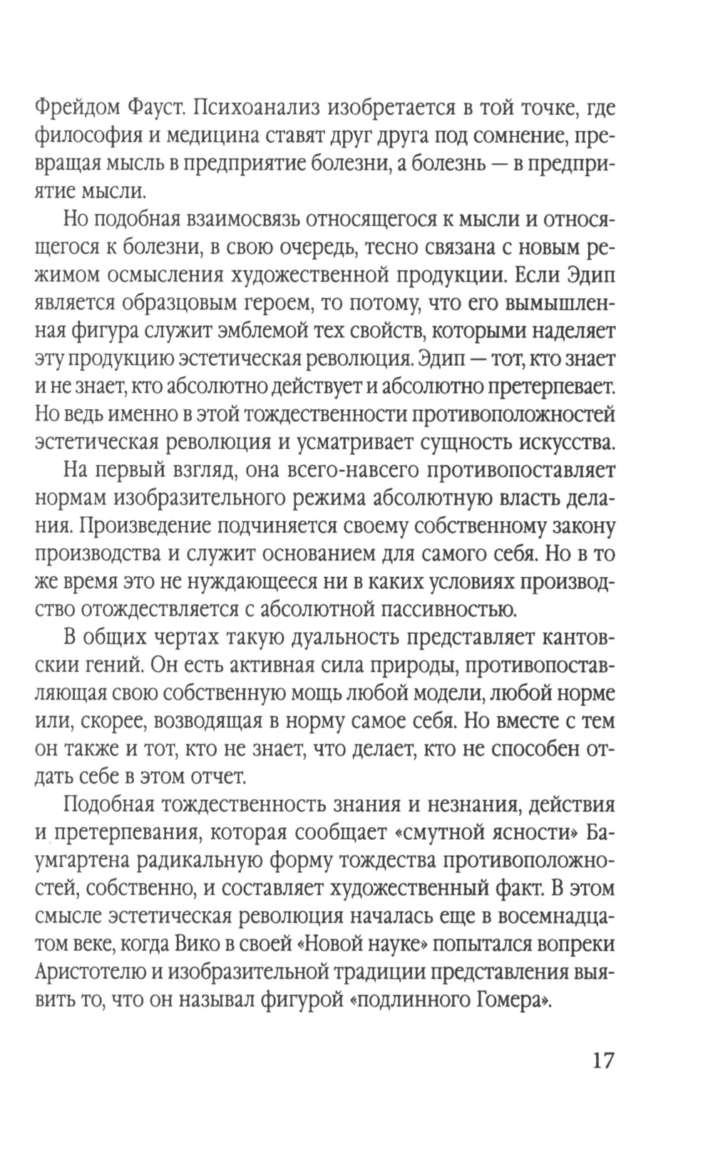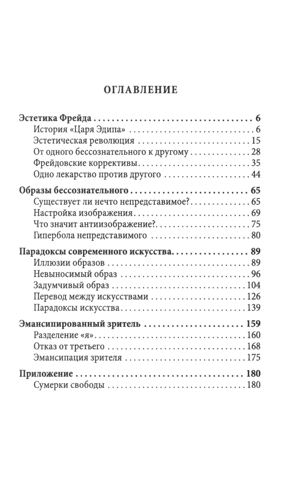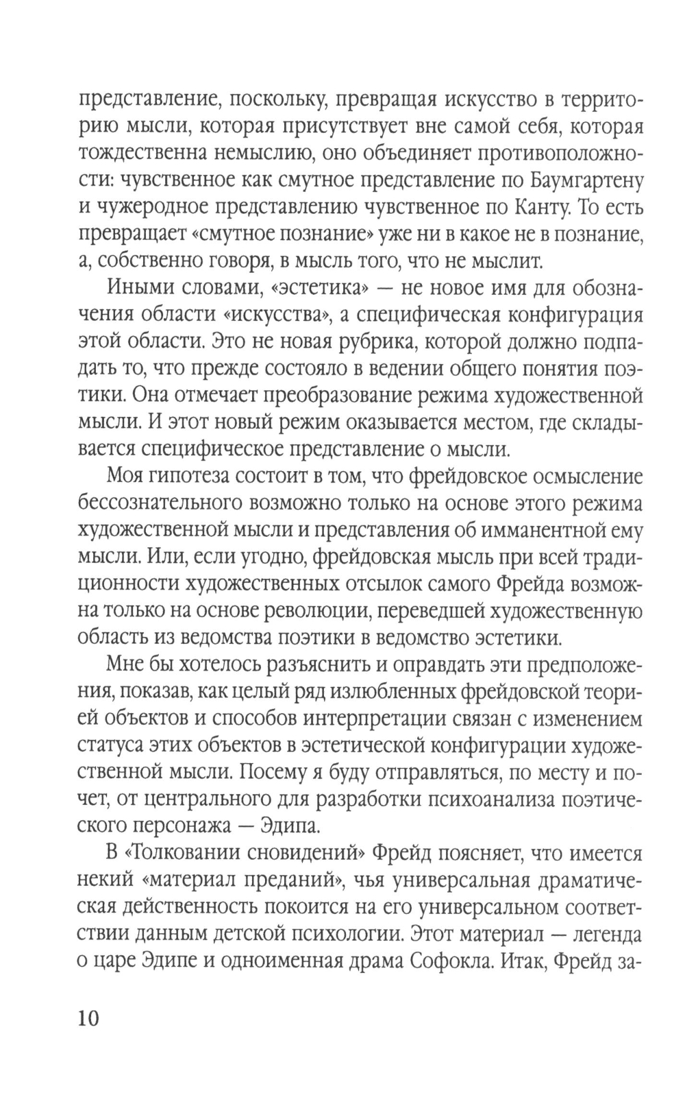 «Известно, что по оптимистическим взглядам Фрейда, которые были ранее простым противопоставлением принципа удовольствия принципу реальности, нанесла страшный удар война 1914 года, - пишет Жак Рансьер (род. 1940), французский философ, профессор Парижского университета. - Однако дозволительно думать, что это объяснение не исчерпывает всей сути дела». Обращаясь к идеям Фрейда, он показывает различные образы бессознательного, в том числе связанные с тем, что основные инстинкты жизни сохраняют за жизнью и направленность к смерти; «хранители жизни» являются одновременно и «спутниками смерти». Рансьер исследует также отражение бессознательного в классических и современных произведениях культуры, включая кино- и фотоискусство - как люди создают эстетику, которую они ранее не признавали.