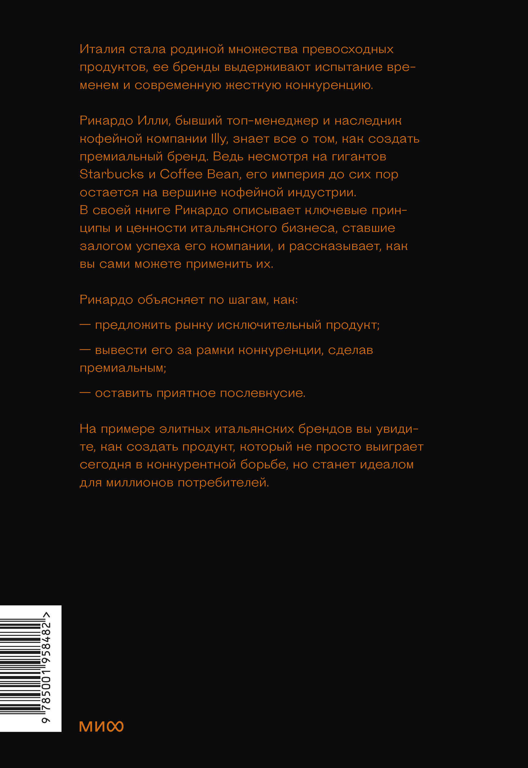 Риккардо Илли, член совета директоров компании Illy, рассказывает, как конкурировать на современном рынке, используя проверенные бизнес-принципы итальянских брендов. Известно, что итальянские бренды создают самые востребованные продукты премиум-класса в мире. Компания Illy - не исключение. Несмотря на жесткую конкуренцию со стороны Starbucks и Coffee Bean, ей все еще удается оставаться на вершине кофейной индустрии. В этой книги Риккардо Илли, бывший топ-менеджер компании, рассказывает о том, какие ключевые принципы и ценности помогают бренду быть успешным и востребованным, и как использовать проверенные временем итальянские стандарты ведения бизнеса. Вы узнаете: - какие исследования необходимо провести, чтобы найти способы повысить качество своей продукции и бренда; - как итальянцы создали так много брендов, выдержавших испытание временем; - как превратить ваш товар в продукт премиум-уровня. Применяя эти принципы в своем бизнесе, вы сможете успешно конкурировать на современном рынке. Для кого эта книга: Для тех, кто стремится преуспеть в ведении бизнеса. Для всех, кто интересуется Италией.| Издательство | МАНН, ИВАНОВ И ФЕРБЕР ООО |